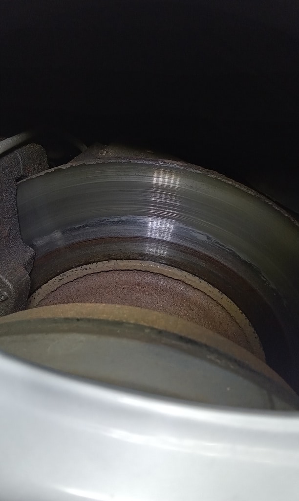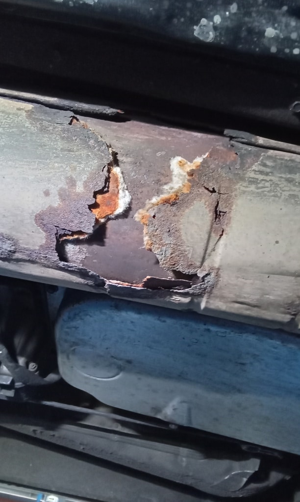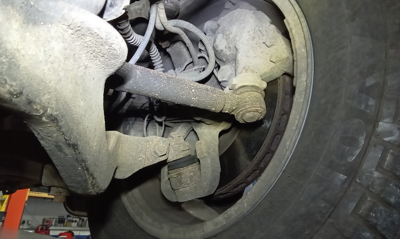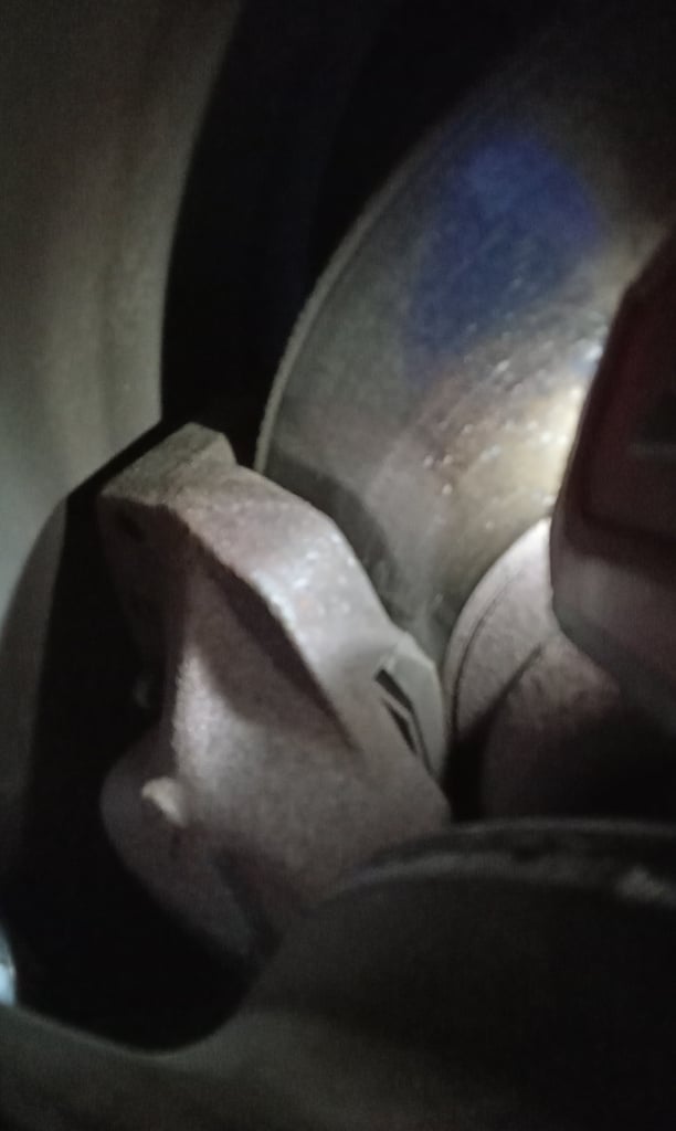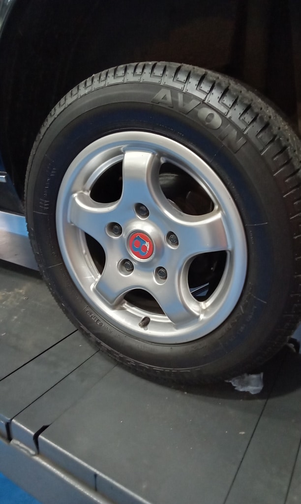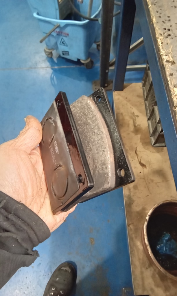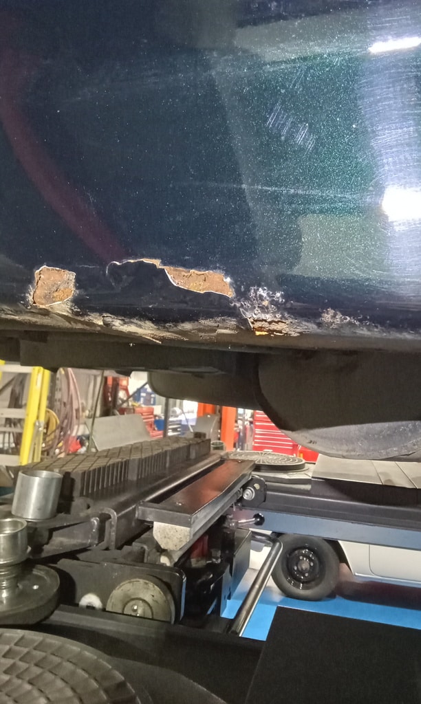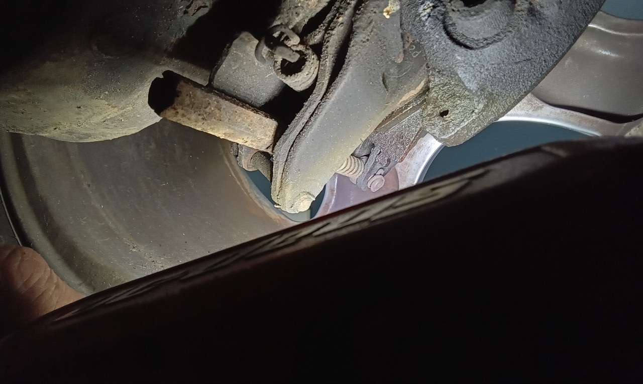 ‘Carry out appraisal. Charge battery while I inspect. Offside rear caliper looks wet and hanbrake pads possibly contaminated. Engine and gearbox sweaty but no drips on floor. Spare wheel a different type alloy but same size. Raise and remove offside rear wheel. Remove pads and found piston seals in caliper weeping. Requires new caliper. Clean pads and they look OK. Derust and repaint black.’