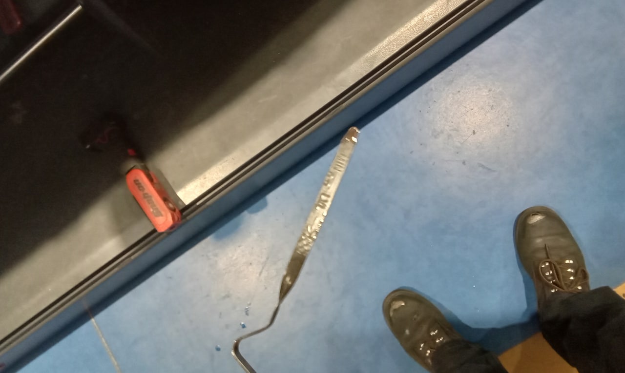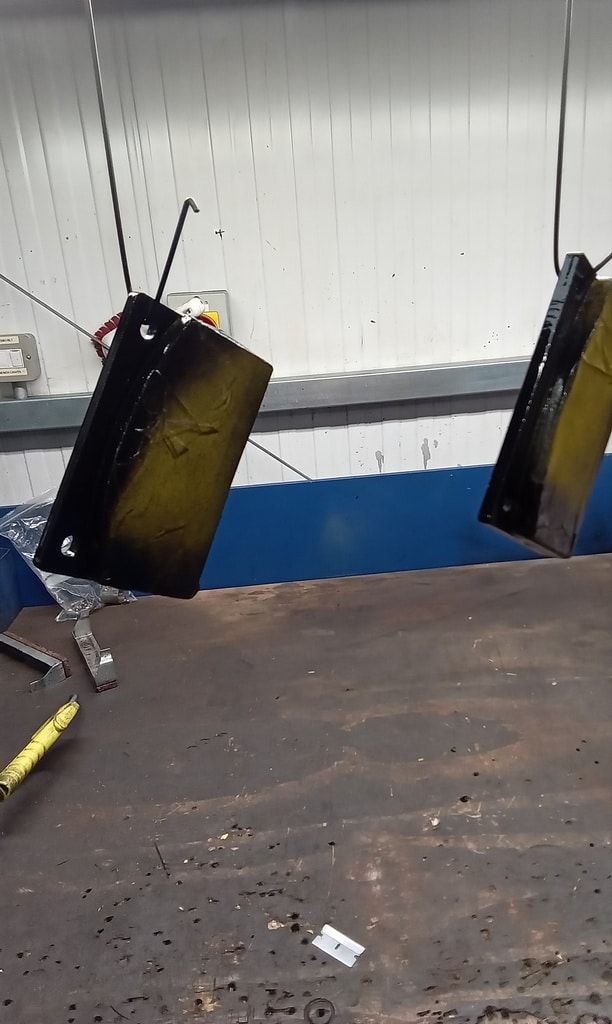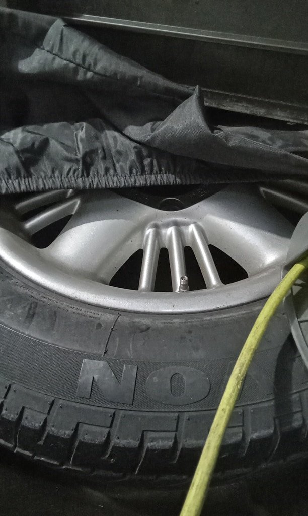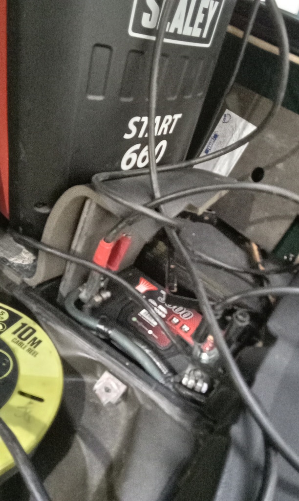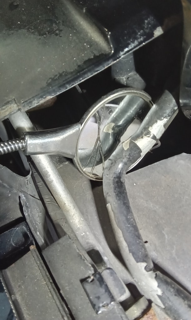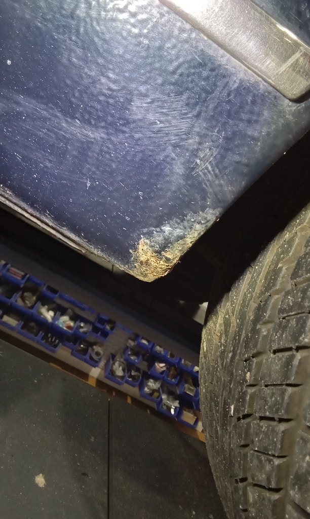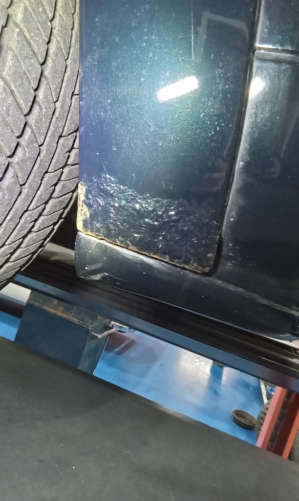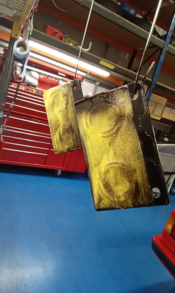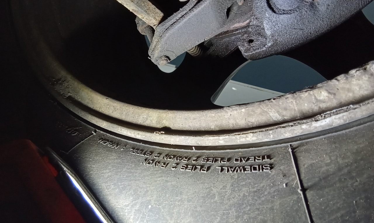 ‘Carry out appraisal. Charge battery while I inspect. Offside rear caliper looks wet and hanbrake pads possibly contaminated. Engine and gearbox sweaty but no drips on floor. Spare wheel a different type alloy but same size. Raise and remove offside rear wheel. Remove pads and found piston seals in caliper weeping. Requires new caliper. Clean pads and they look OK. Derust and repaint black.’