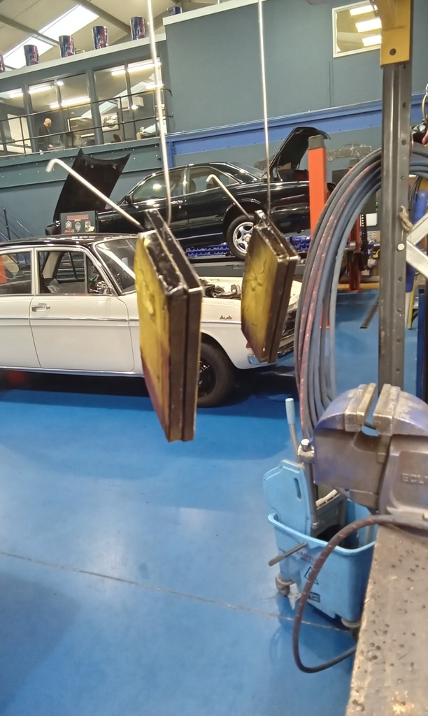 ‘Refit pads and wheel and lower to floor. Put trims in boot. Inspect front suspension as sits a little low. Look into this. It’s common and Bentley make spacers for the spring seat to raise height up to a maximum of 1 inch. If more height required new springs needed. Wait to get off ramp and suspension settles to measure ride height and check auto box level.’