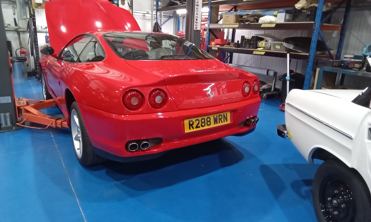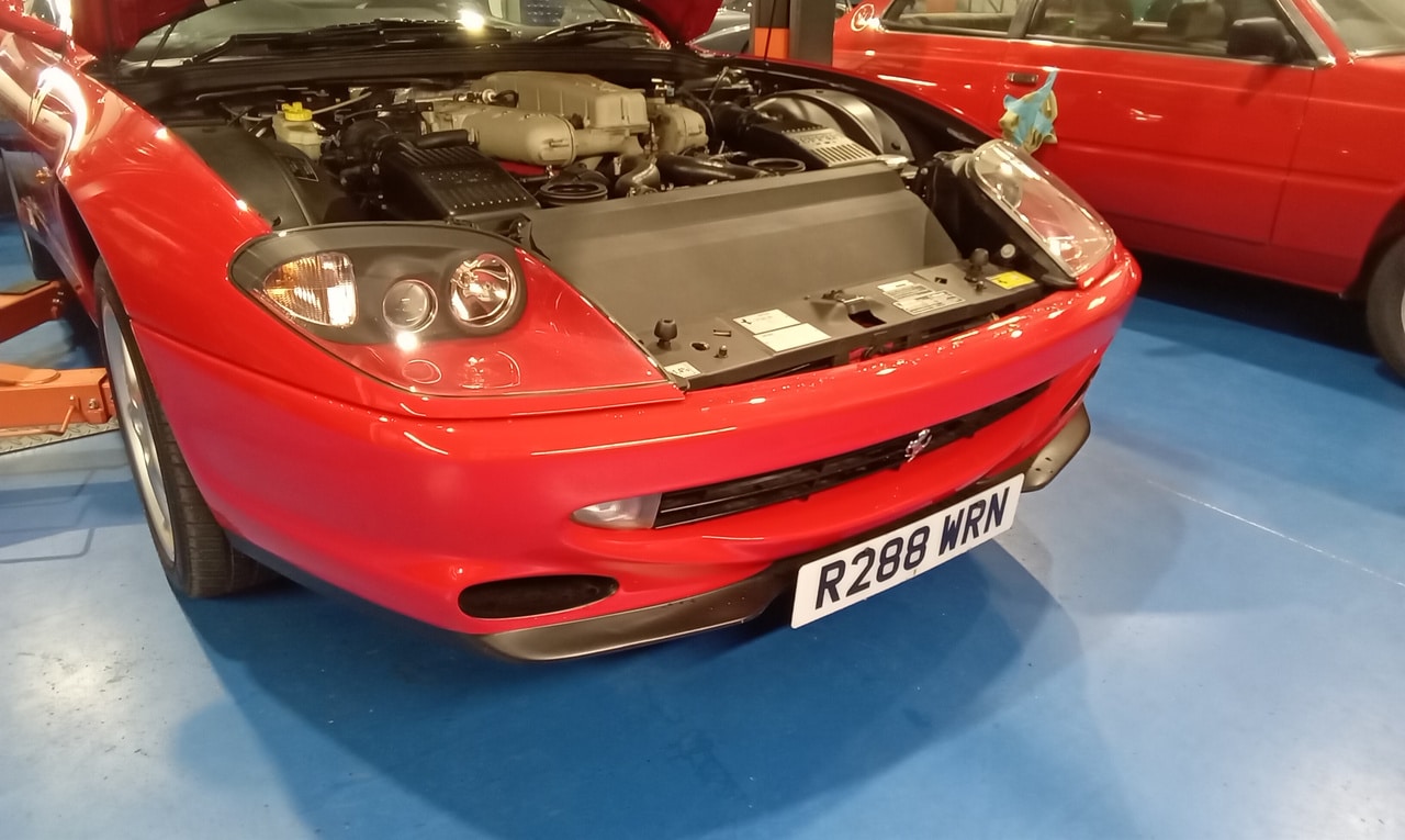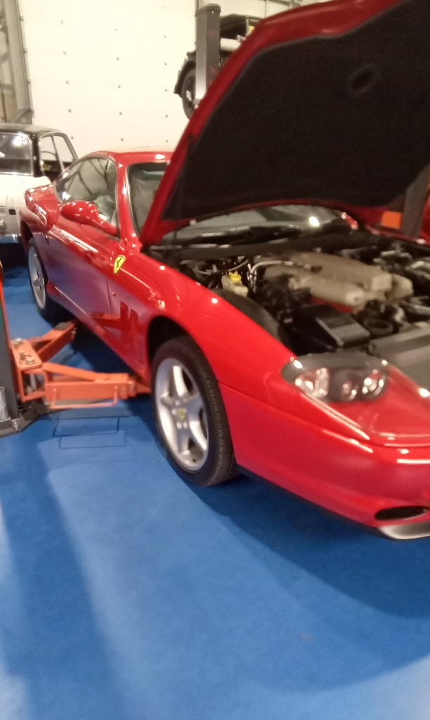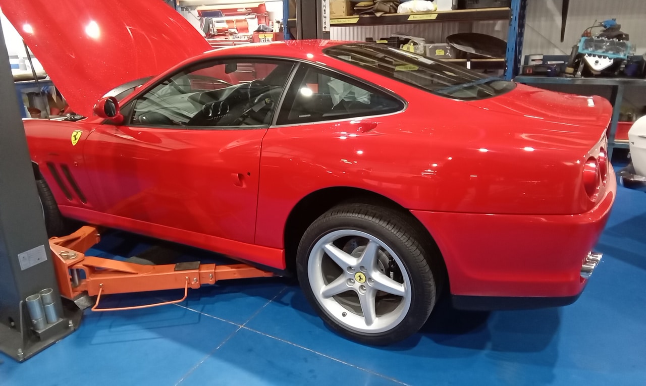 After recently arriving at the workshop, the 1998 Ferrari 500 Maranello has been in the paint shop previously but now is on the ramp in the Bridge Classic Cars HQ. Our restoration technician Jon has been carrying out a full appraisal on the modern icon which involved topping up the brake fluid tightening down the battery terminals before torquing up the wheels and inflating all of the tyres to the correct pressure.