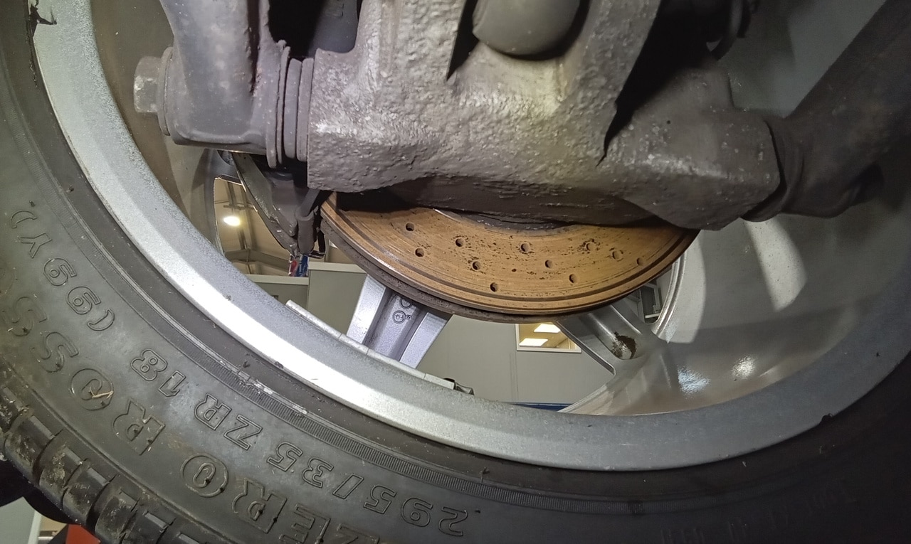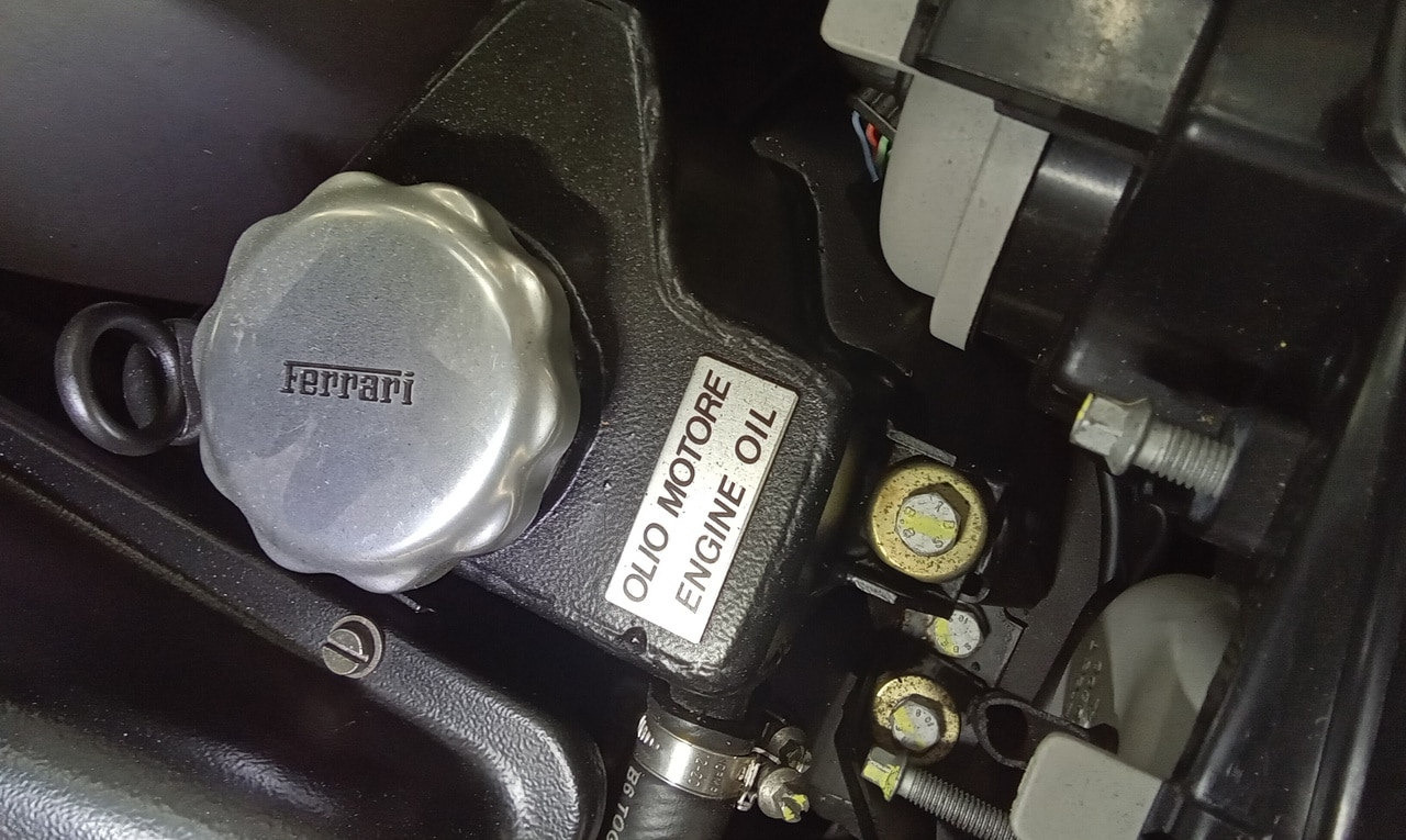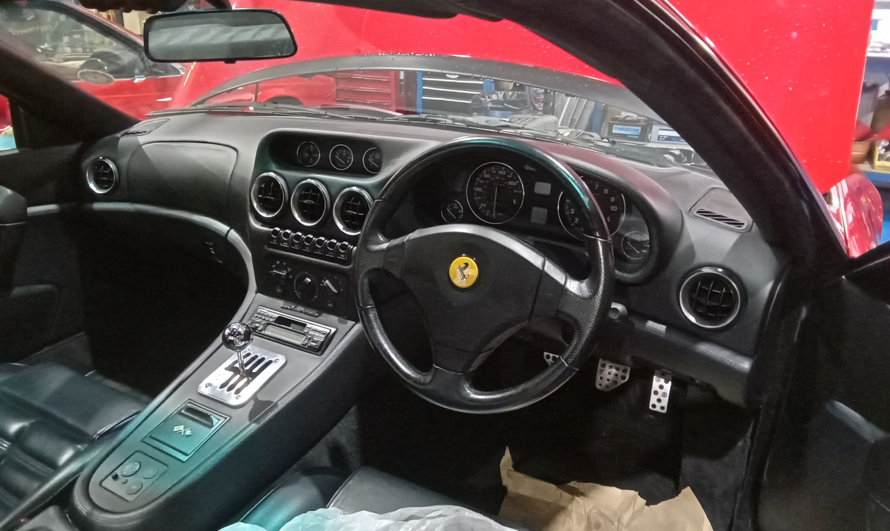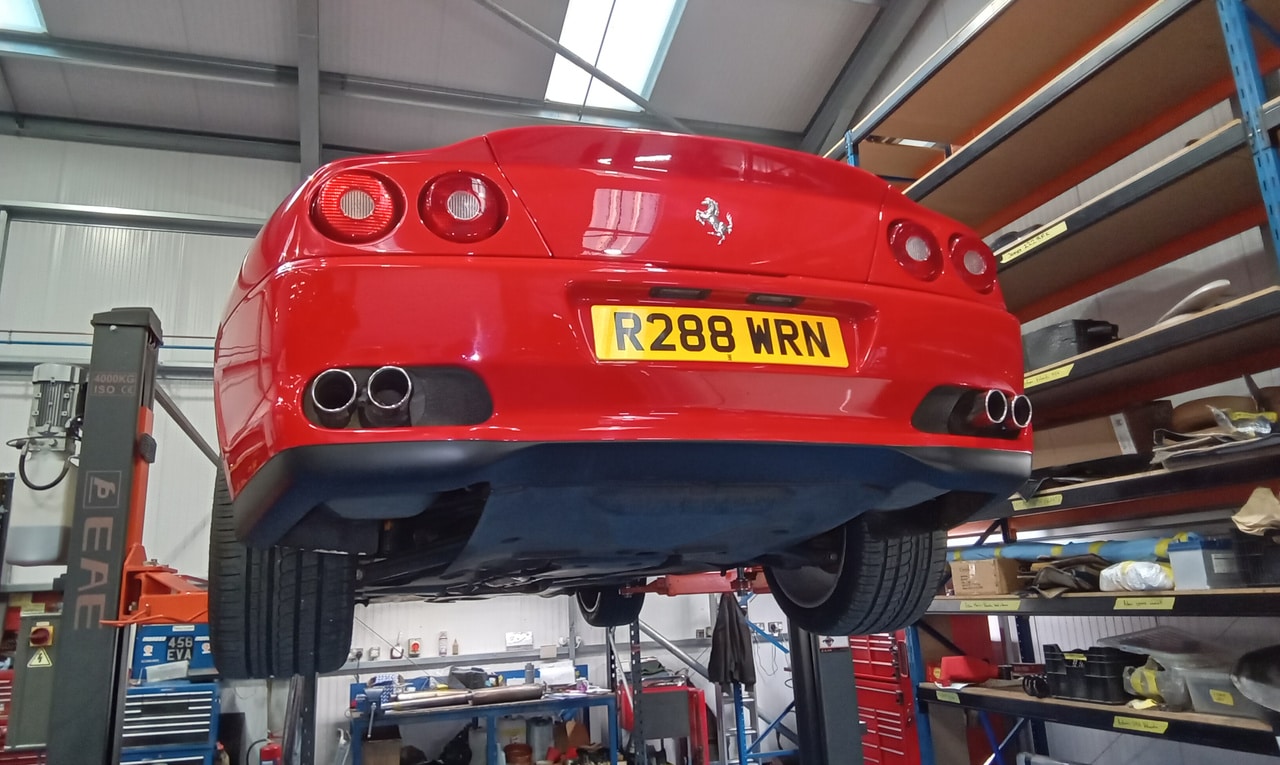 After recently arriving at the workshop, the 1998 Ferrari 500 Maranello has been in the paint shop previously but now is on the ramp in the Bridge Classic Cars HQ. Our restoration technician Jon has been carrying out a full appraisal on the modern icon which involved topping up the brake fluid tightening down the battery terminals before torquing up the wheels and inflating all of the tyres to the correct pressure.
