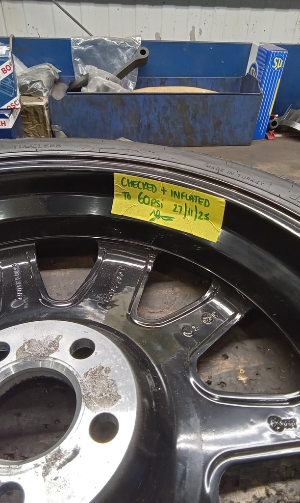”Raise in air and inspect. Visually inspect brake. Inflate tyres and torque wheels. Put locking wheel nut key back in boot. All OK.”