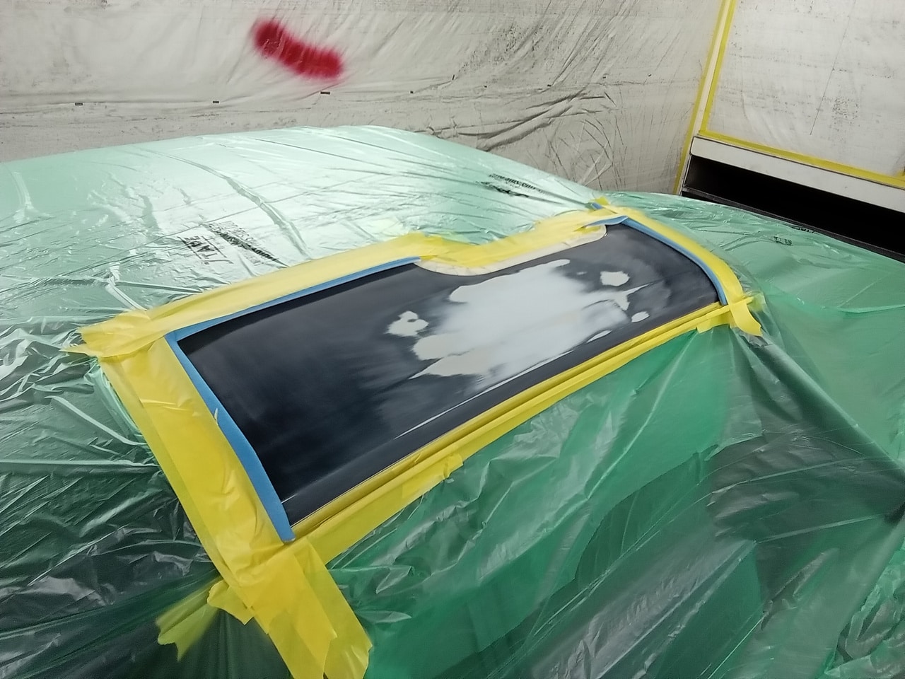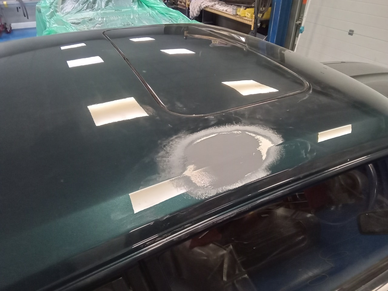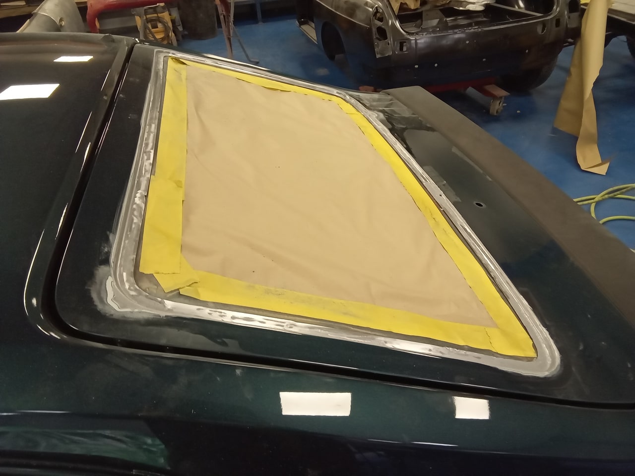 The Bridge Classic Cars team have been working on the 1987 Ford Capri fixing a couple of areas to get the classic blue oval coupe back to factory fresh. Chris, our paint and body manager, has work on full the dent out of the roof panel before levelling it as well as treating some areas of corrosion on the rear window before then priming all the effected areas ready to be colour matched.