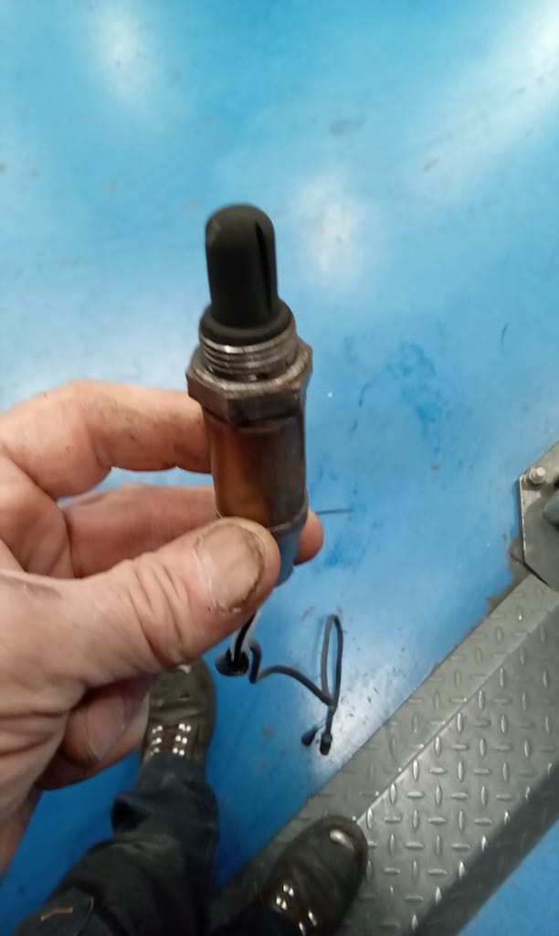 ‘Remove air filter offside. Access wiring to oxygen sensor and disconnect. Remove old sensor and fit new. Feed wiring away from exhaust and secure. Connect. Refit air filter. Take outside and warm up. Carry out road test. Drives OK but fault code still present. Return to workshop and disconnect battery. Reconnect battery and test. Fault code now gone.’