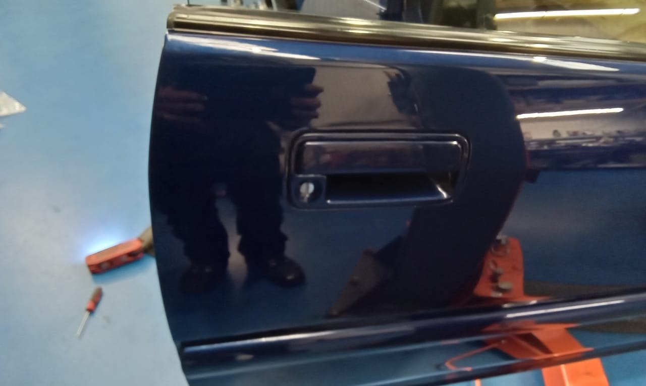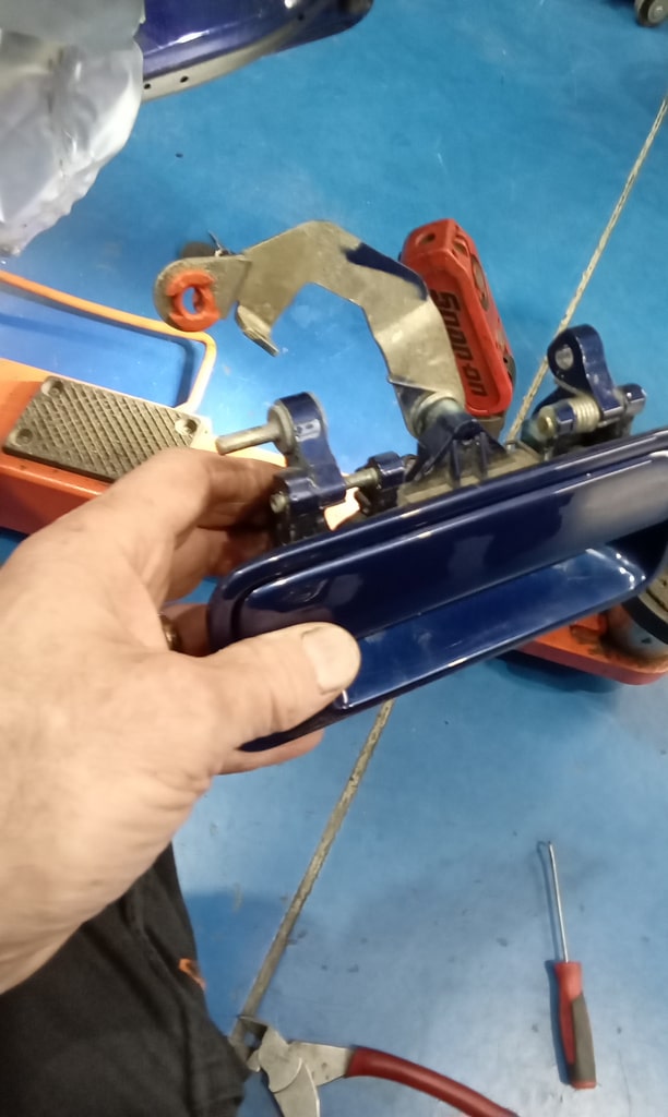 On further inspection, Jon found the outside handle itself was broken, so he removed it from the door. To repair it, he made a small plate to hold the handle together, drilled and screwed it in place, and also applied adhesive for additional strength. Once complete, he refitted the handle, adjusted the actuator arm, and tested it again, confirming everything was working properly. He then refitted the door panel and carried out a final check of all functions.