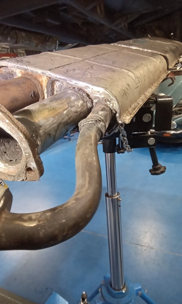 Jon began by fitting up new front brake pads into the calipers before turning his attention underneath the car. On inspection, Jon noted that there was a very slight blow coming from the exhaust so with that Jon and Pete removed the centre section to inspect it fully and try to find where this blow could be coming from.