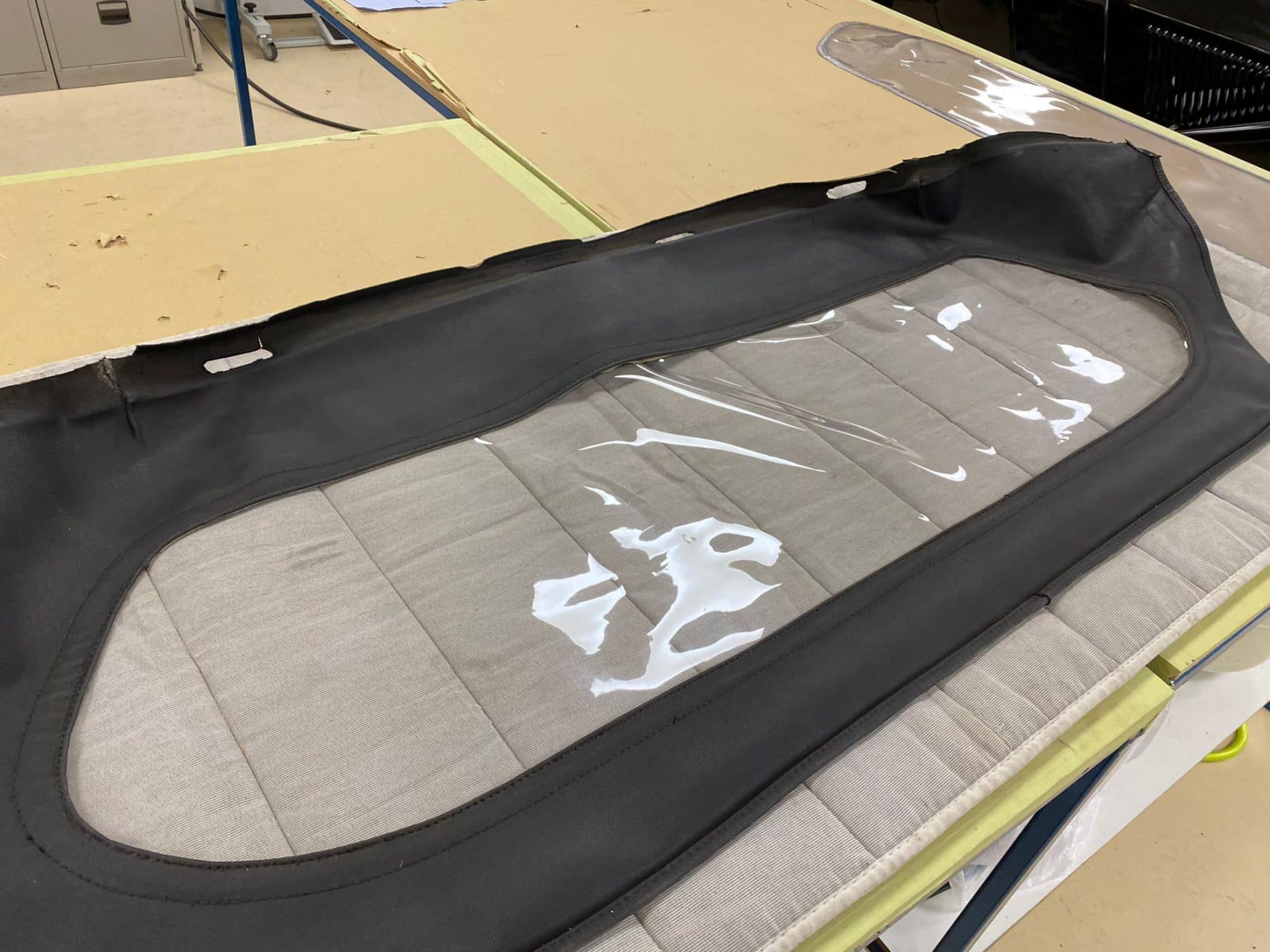 Kath has now finished repairing the hood on the 1989 TVR SII 2.9 V6. In the last blog post, we heard about how she was removing the old PVC window out of the hood, because of it becoming delaminated and coming out of the seam at the corners. She used the original as a pattern to mark out around and cut out on a sheet of new clear PVC. Once cut out, Kath applied contact adhesive to the outside edge of the PVC and slotted it in between the layers of hood fabric at the seam edge and left it to dry. She could then sew down the same lines where the previous stitching was to fully secure the window into place. New leather strips were sewn onto the corners. The hood could then be glued to its frame. The vertical bars on the hood frame that is attached to the car had flaking black paint on them. So these were sanded down and then re-painted. The pieces that hold the hood in place at the front and where the front roof panels slot into it, had flaking paint on them too, so these got re-painted in the same manner. The hood could then be attached to the car again. Kath also reglued various pieces of fabric that were coming away around the inside of the TVR.