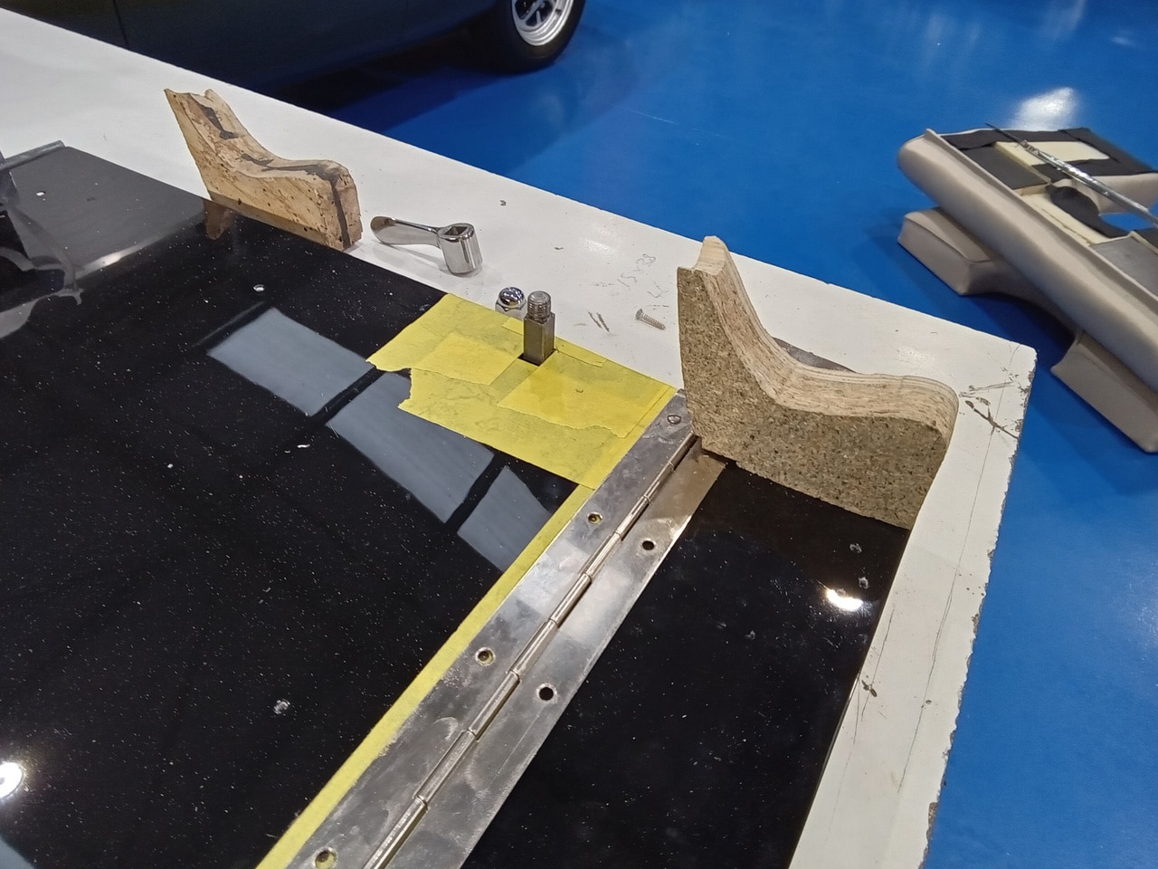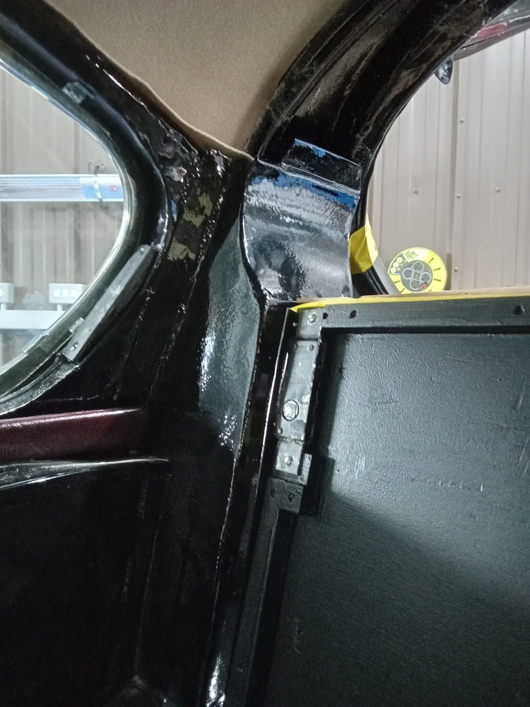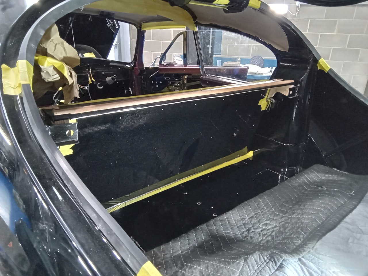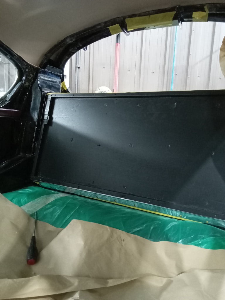 Once the windows were installed in the front doors, Ben could begin work on the rear seat. The original blocks for the rear seat had dried and rotted over all these years, so using the original as a template, he cut new blocks. Also during the test fit, Ben has begun to work out the packing to make the trims fit square.