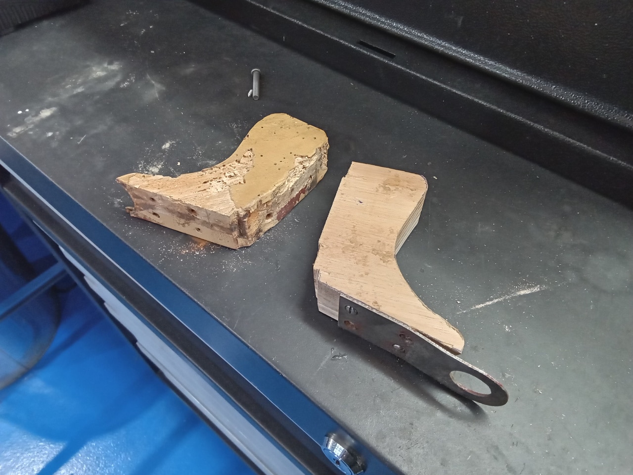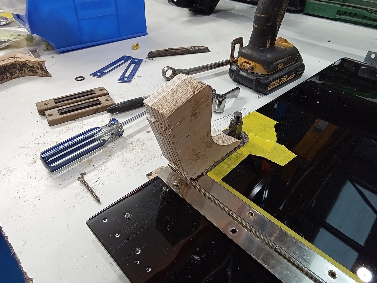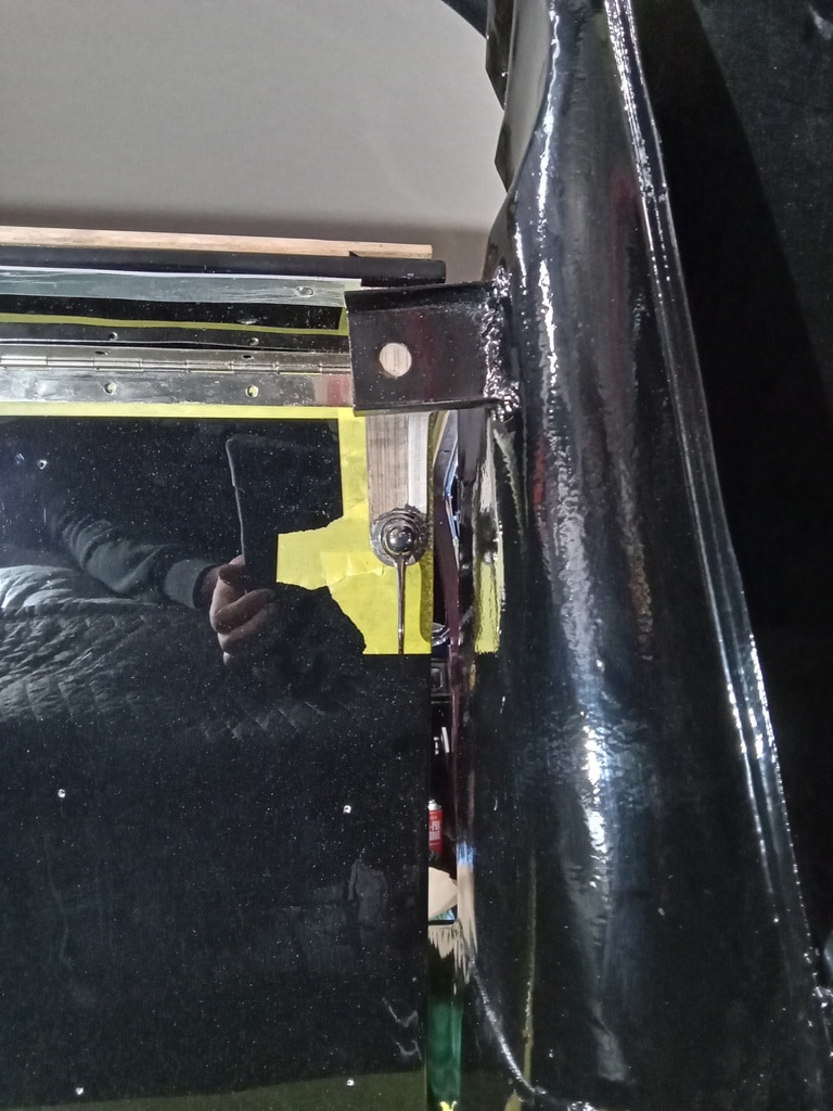 Once the windows were installed in the front doors, Ben could begin work on the rear seat. The original blocks for the rear seat had dried and rotted over all these years, so using the original as a template, he cut new blocks. Also during the test fit, Ben has begun to work out the packing to make the trims fit square.