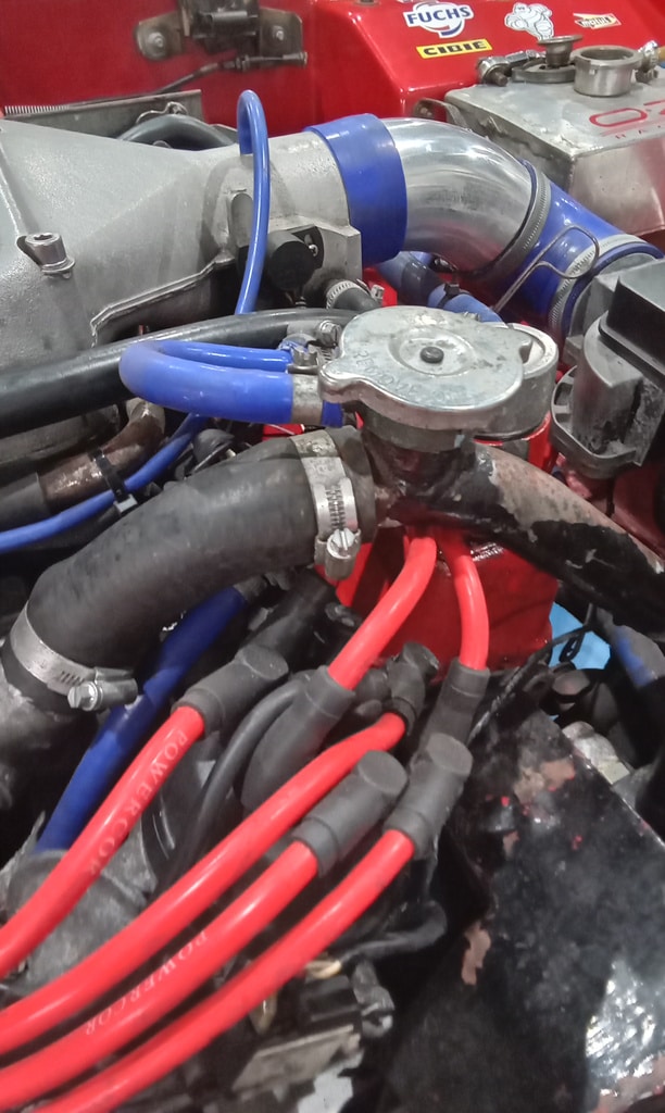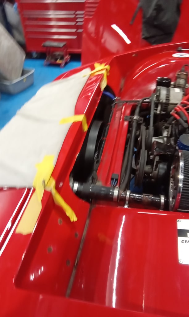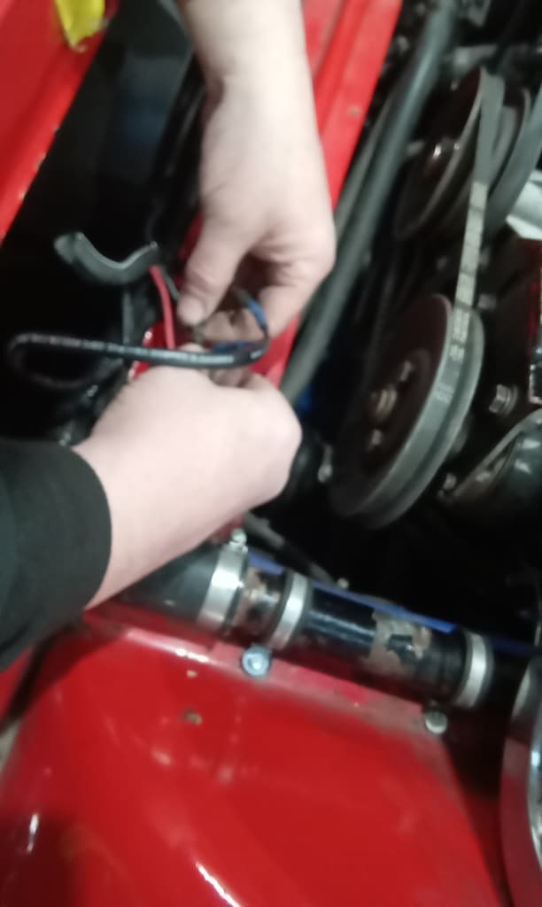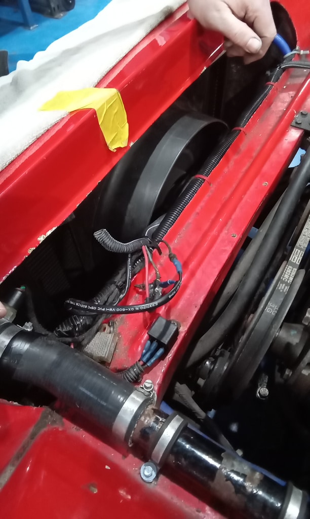 ”Refill cooling system with vacuum tool. Run up and check for leaks. Replace cap with old one from stock. Fan not working. Check wiring. Found bad terminals and connections. John rewire fo me. Shrink wrap and secure. Fan over ride switch under column now functions OK and Fan runs when required. Fit bonnet. Clean car and wipe over. Carry out road test. All seems OK. No leaks. ”