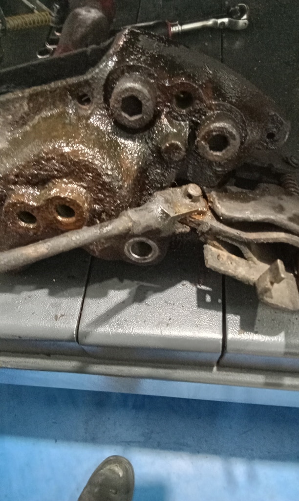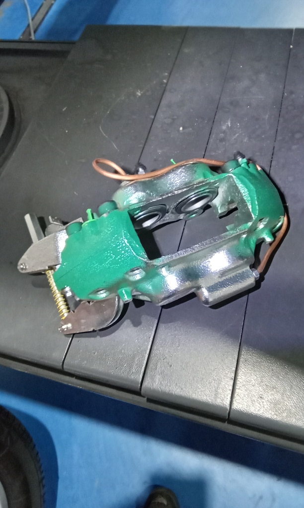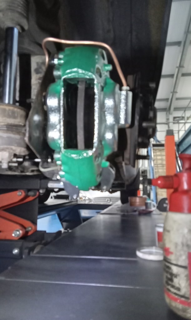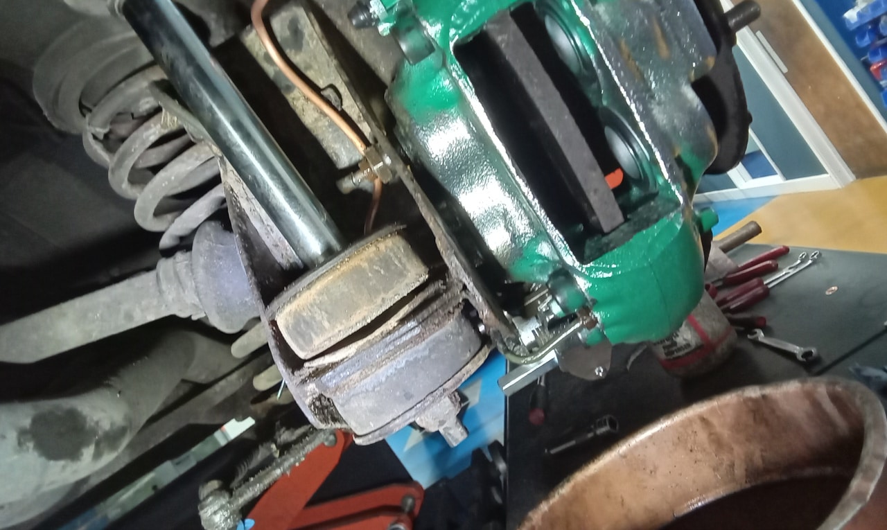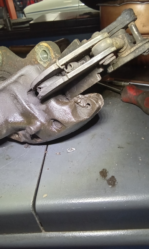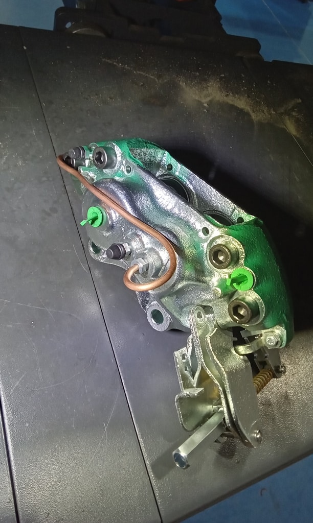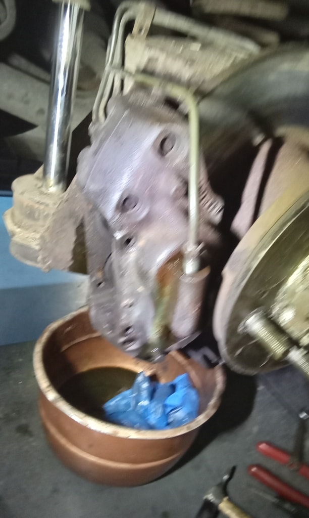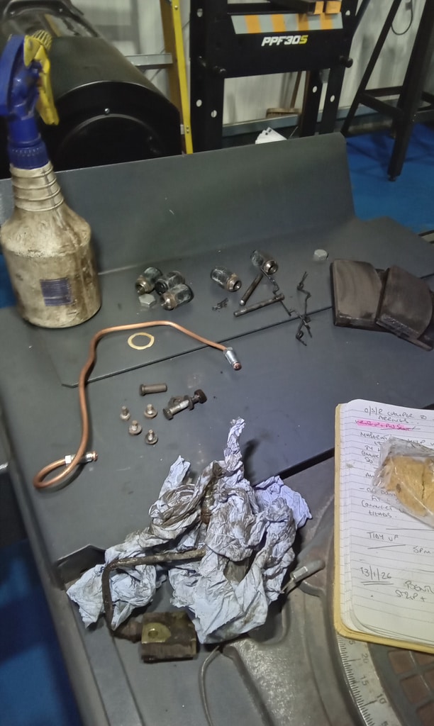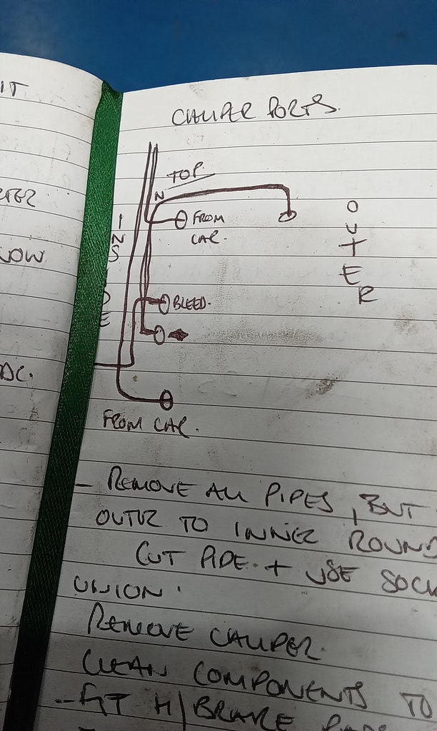 ‘Rear caliper arrived, so jack up and remove offside rear wheel. Caliper has 6 ports so draw diagram for reference. Strip and remove handbrake arm at inner end as clevis seized at caliper end. Remove all pipes. Pipe from inside to outside riu ded off and unable to access easily. Cut pipe and remove caliper. Strip and remove handbrake pads and clean. Lube and fit to new caliper. Clean all bolts etc.’