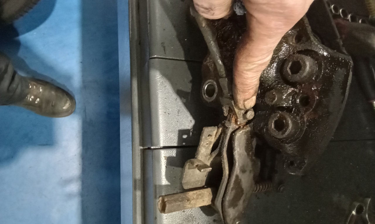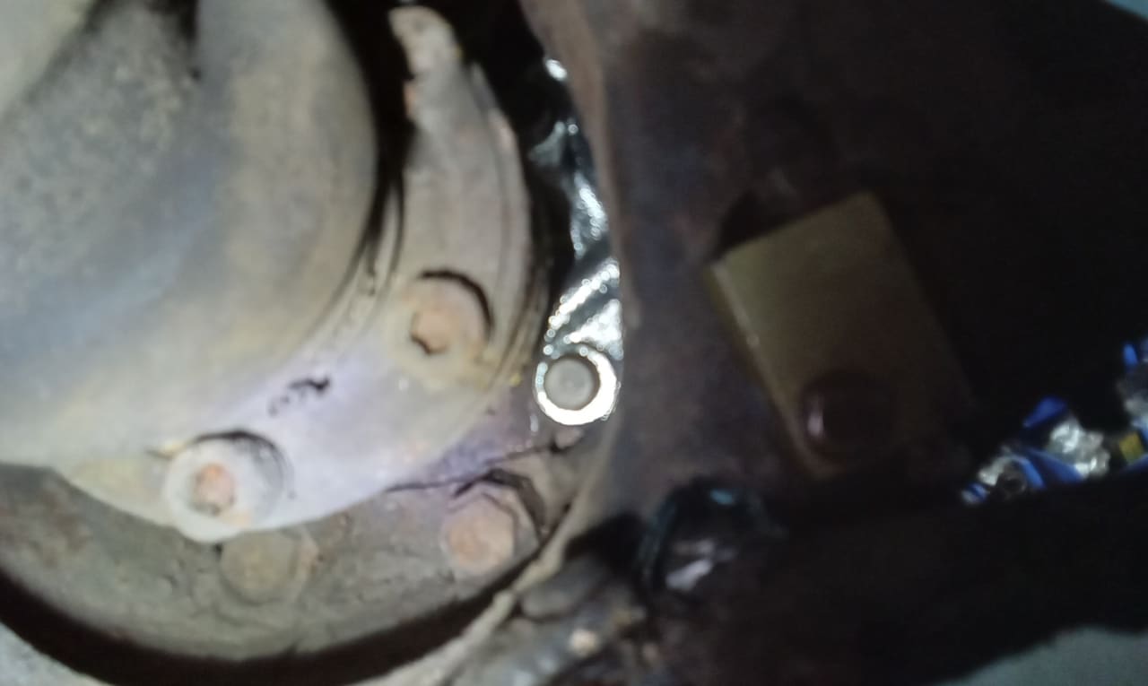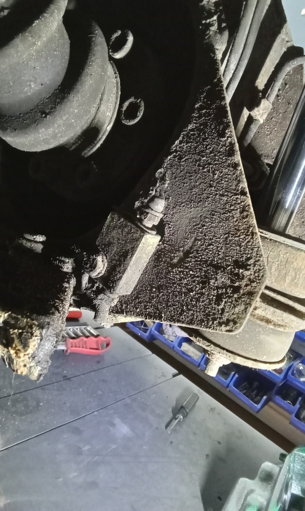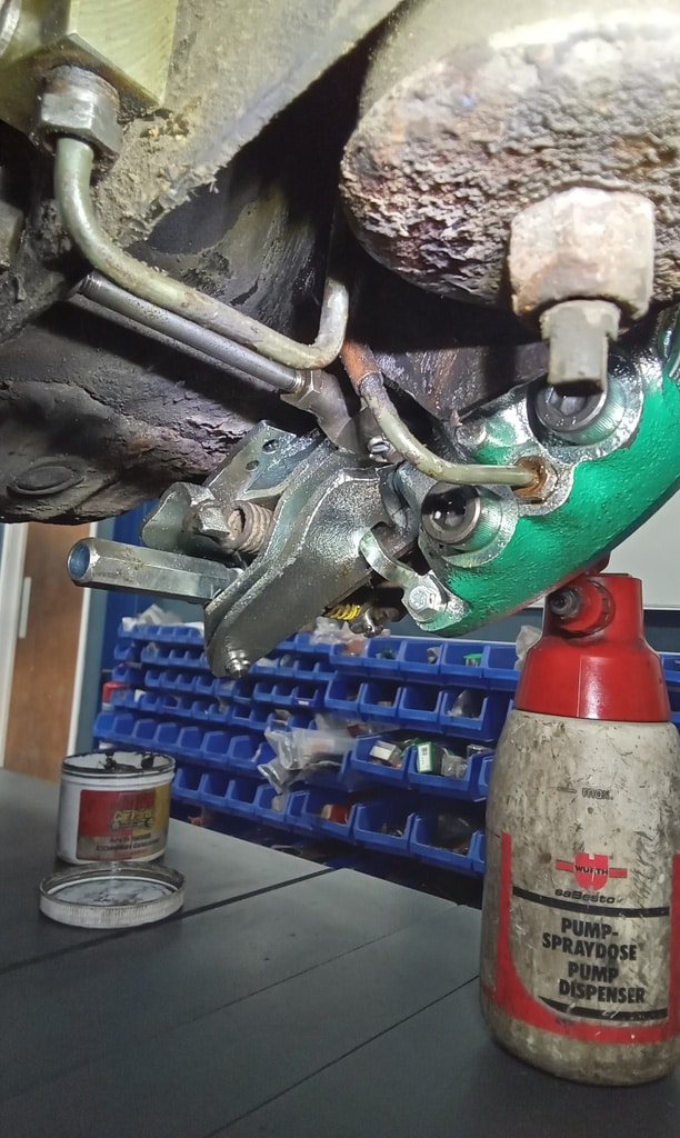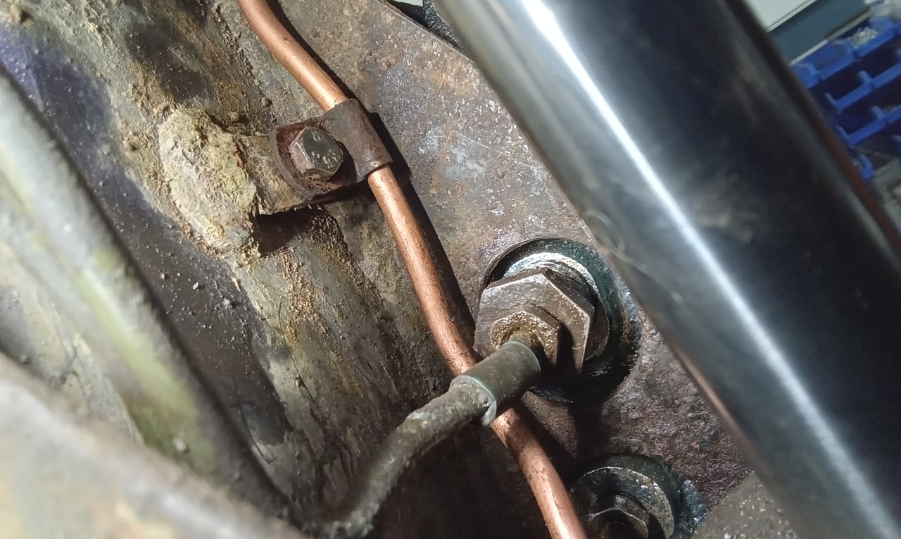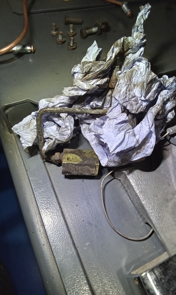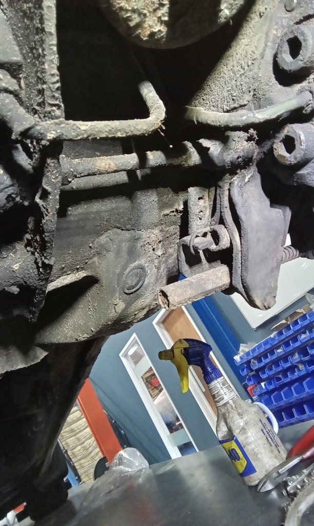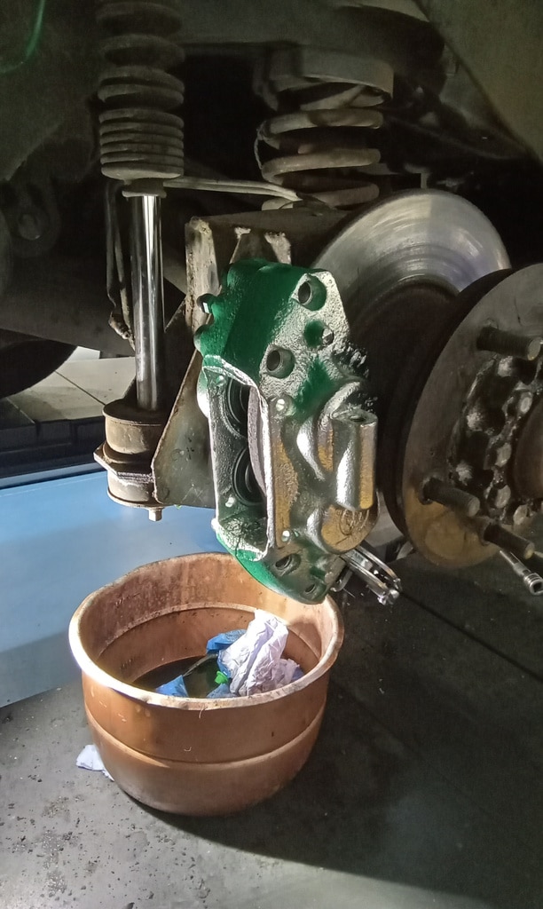 ‘Rear caliper arrived, so jack up and remove offside rear wheel. Caliper has 6 ports so draw diagram for reference. Strip and remove handbrake arm at inner end as clevis seized at caliper end. Remove all pipes. Pipe from inside to outside riu ded off and unable to access easily. Cut pipe and remove caliper. Strip and remove handbrake pads and clean. Lube and fit to new caliper. Clean all bolts etc.’