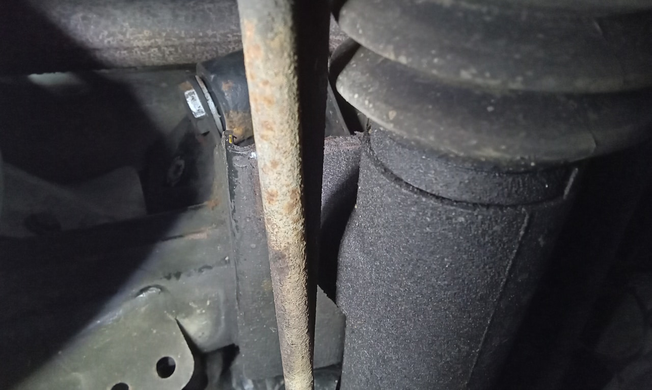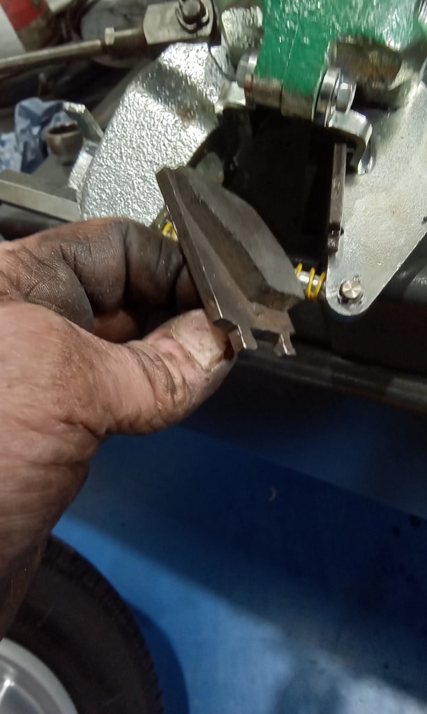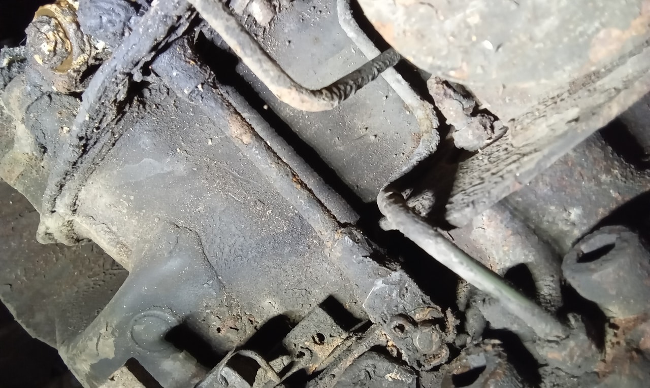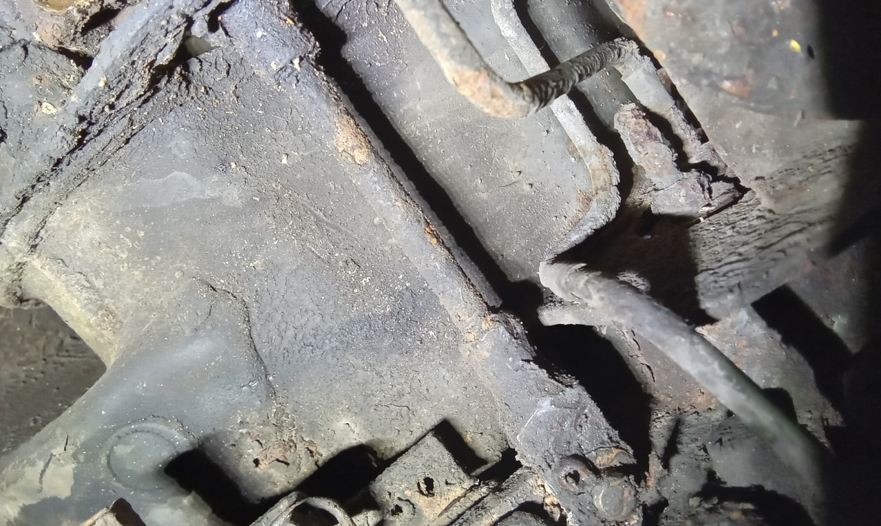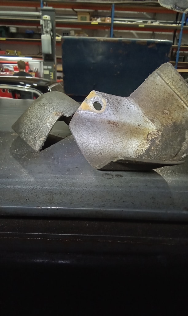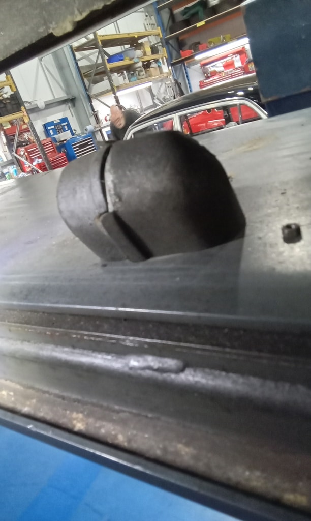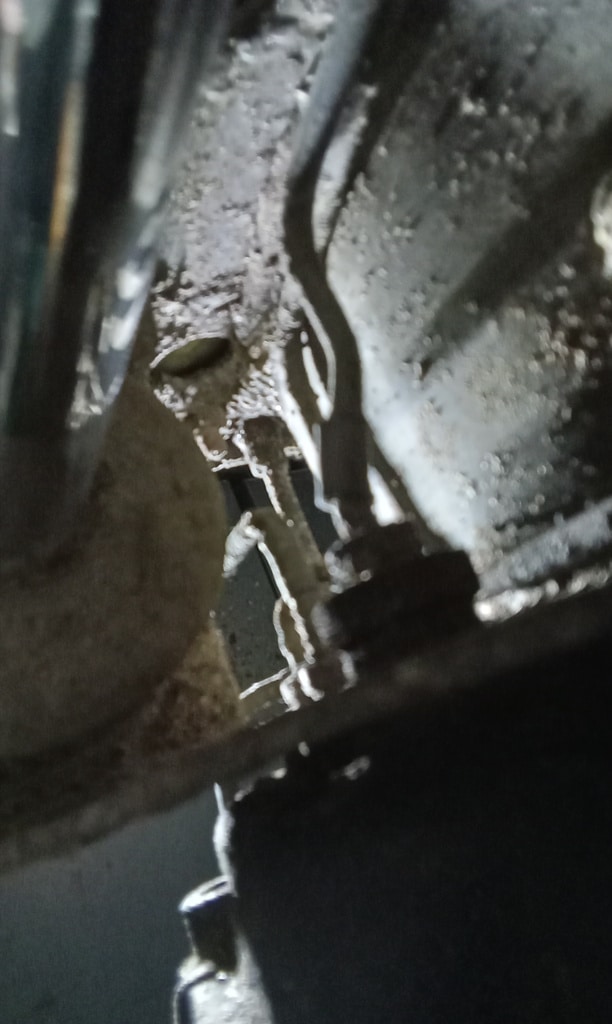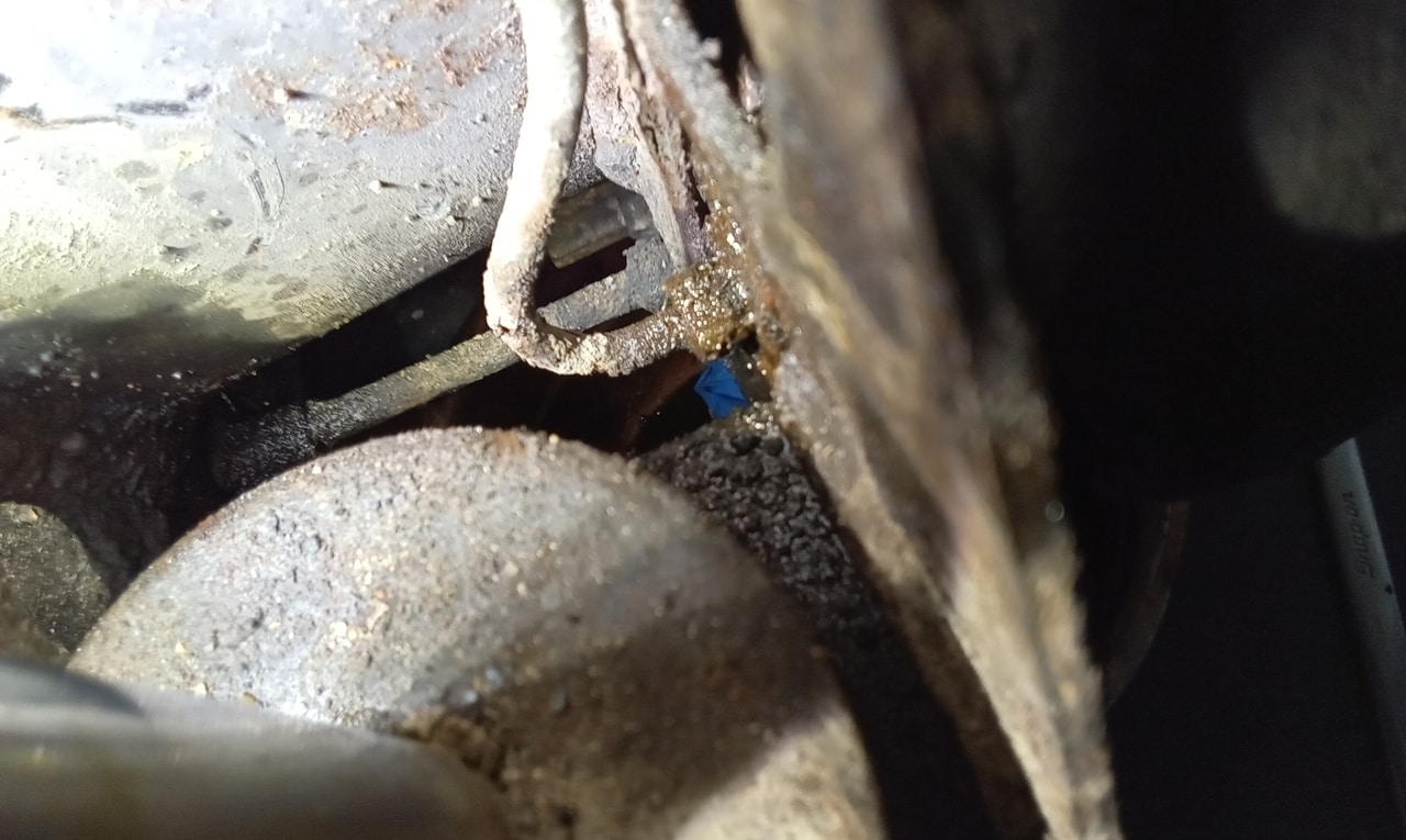 ‘Rear caliper arrived, so jack up and remove offside rear wheel. Caliper has 6 ports so draw diagram for reference. Strip and remove handbrake arm at inner end as clevis seized at caliper end. Remove all pipes. Pipe from inside to outside riu ded off and unable to access easily. Cut pipe and remove caliper. Strip and remove handbrake pads and clean. Lube and fit to new caliper. Clean all bolts etc.’