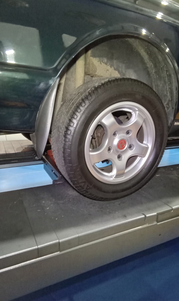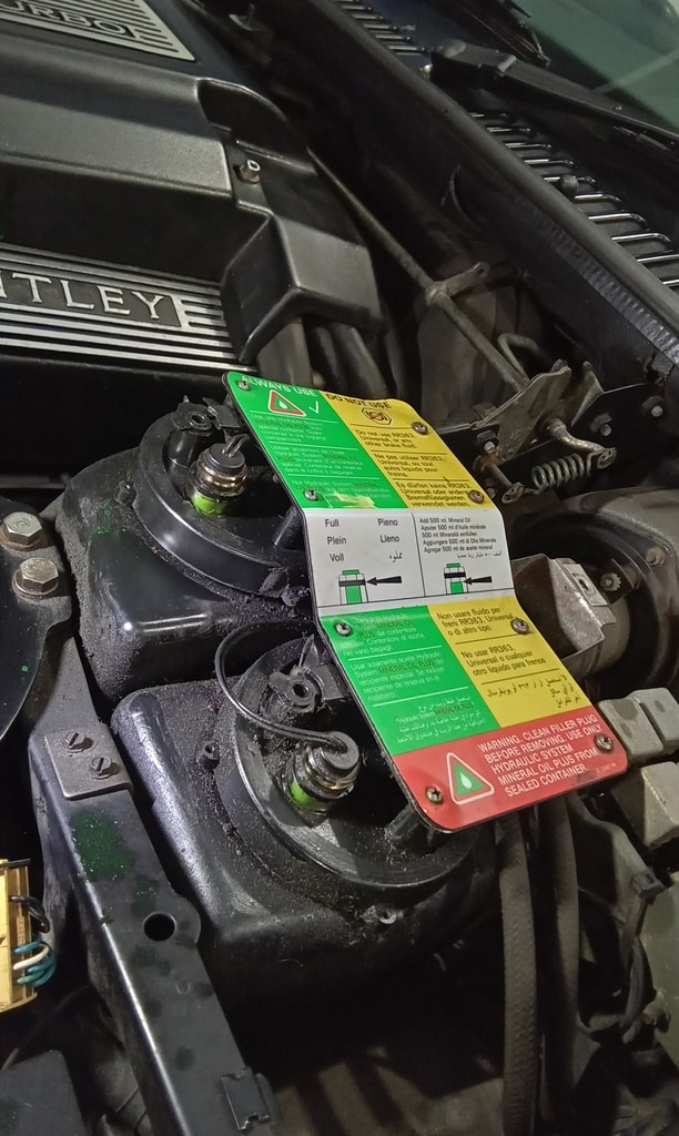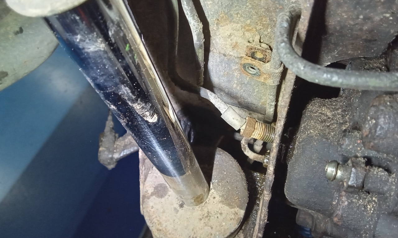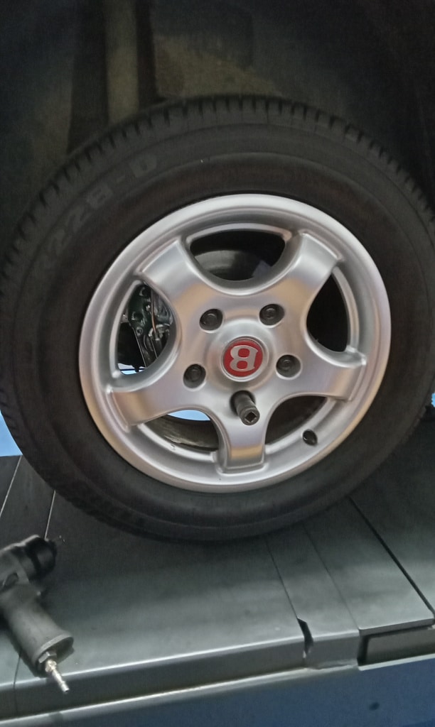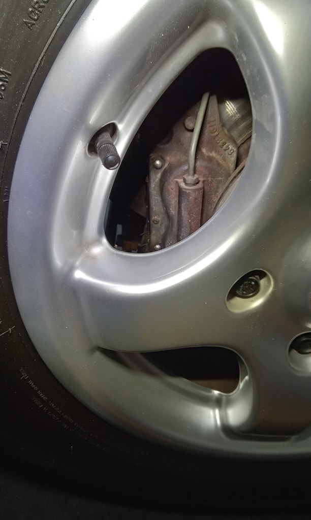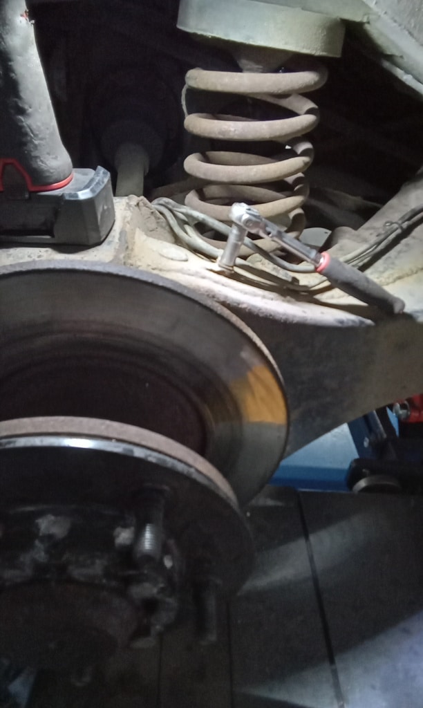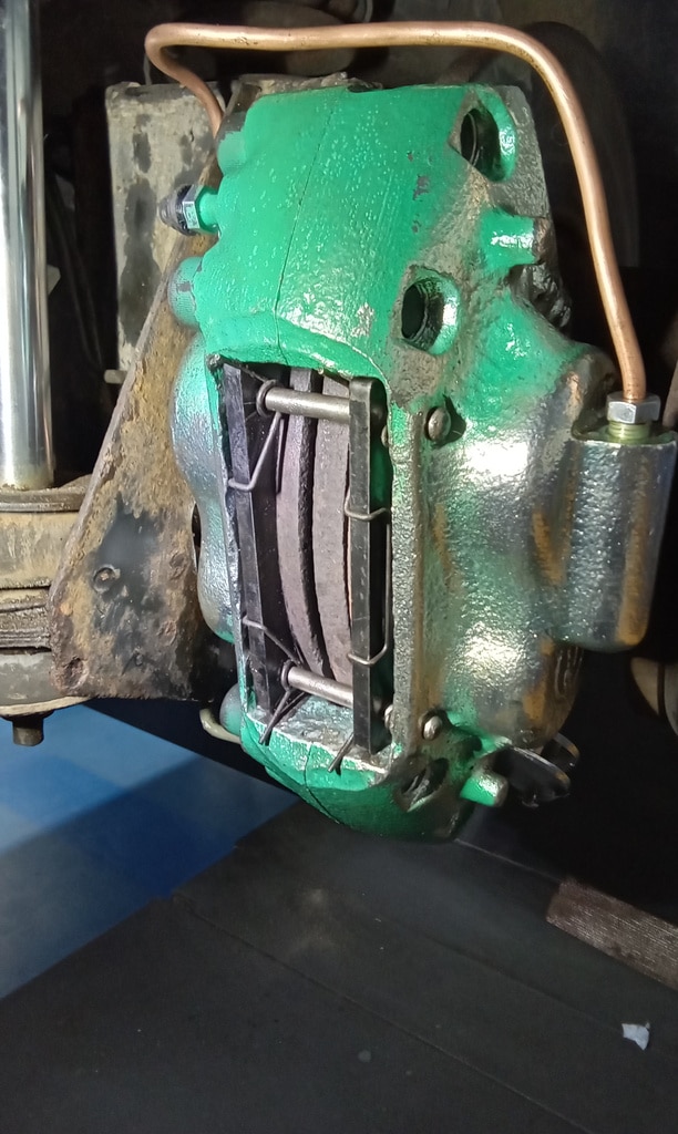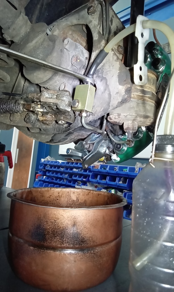 ‘Fit caliper and secure. Refit brake pads. Resecure pipes and cable tie abs wire to pipes. Adjust handbrake links. Tidy area and check LHM level in tanks under bonnet. Prep for bleding but lower remote nopple seized in block on rear shock mount. Remove and free off. Bleed brake with Johns help. Refit wheel and torque up tight. Check for leaks under pressure, all looks OK.’
