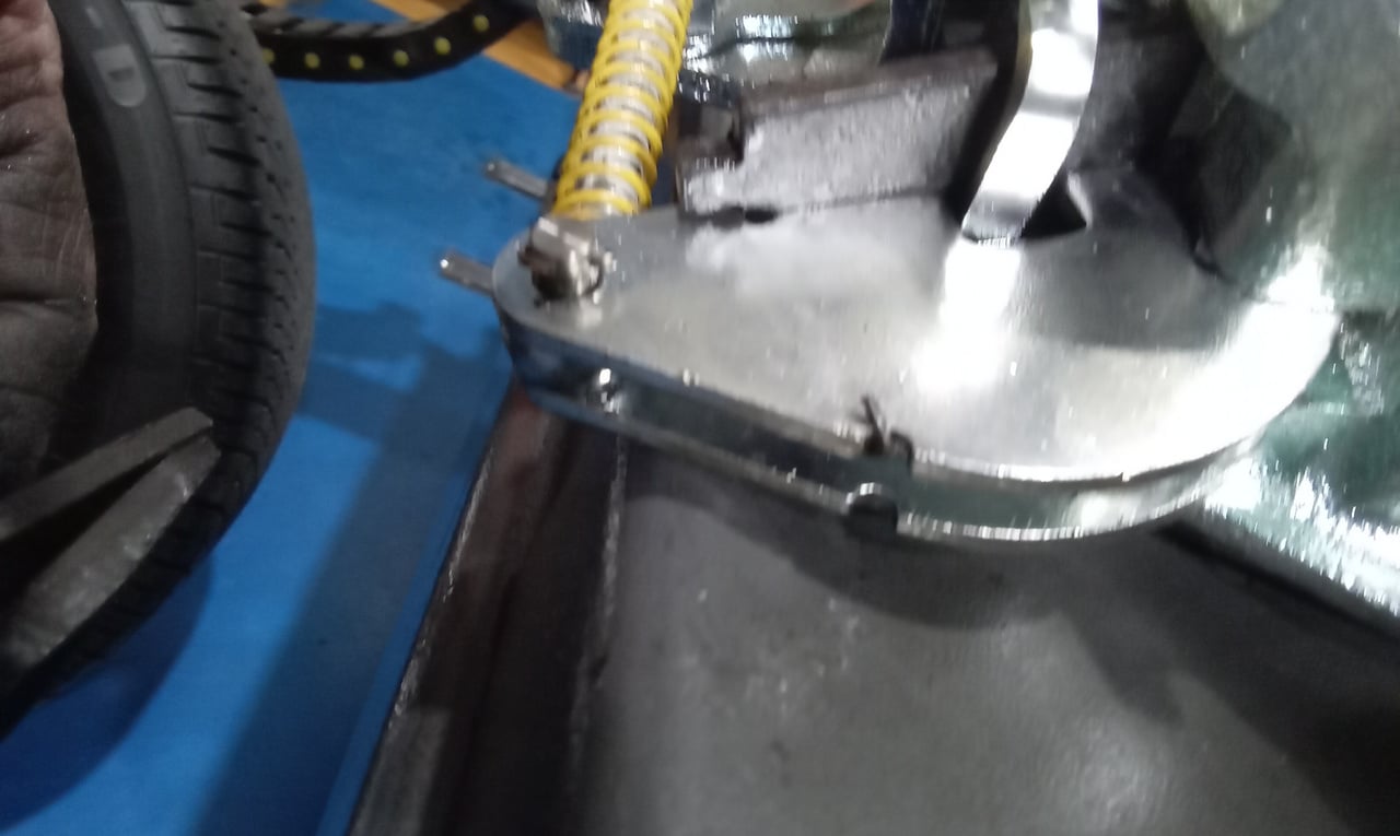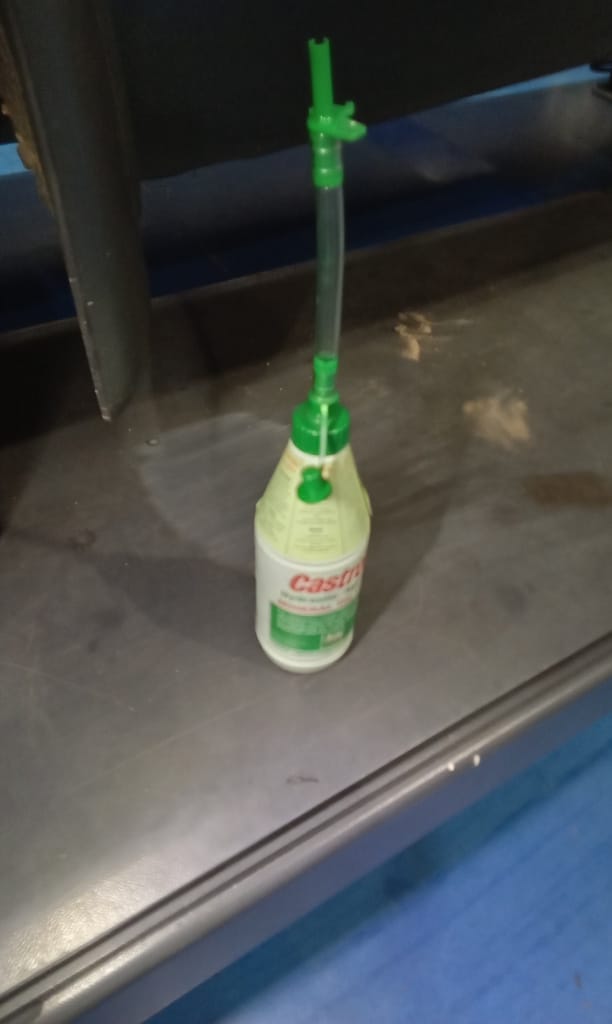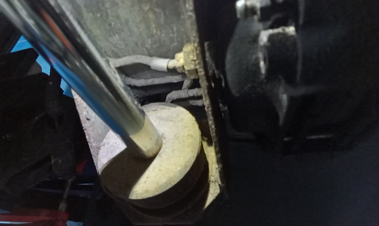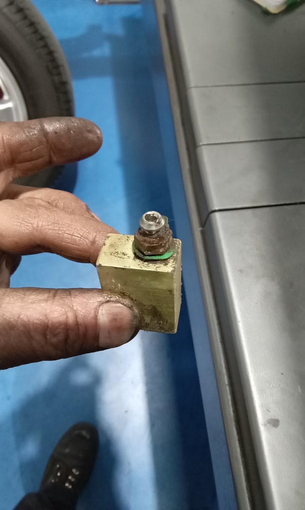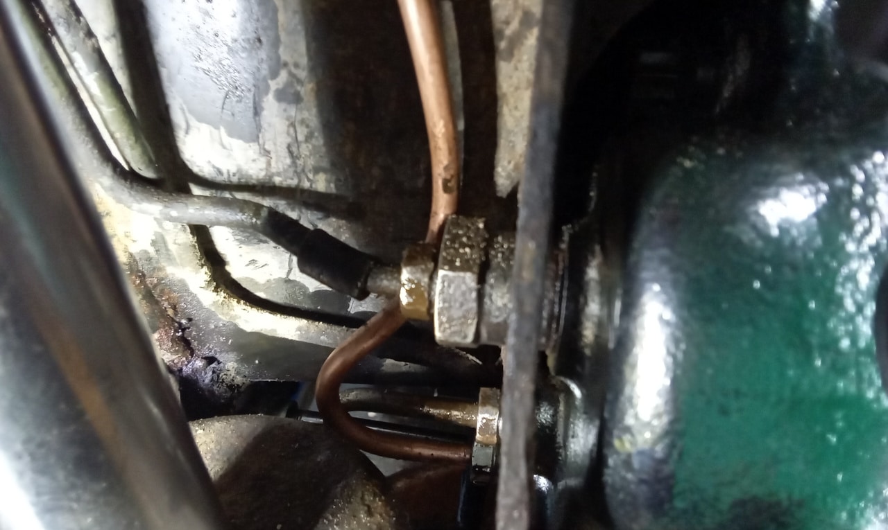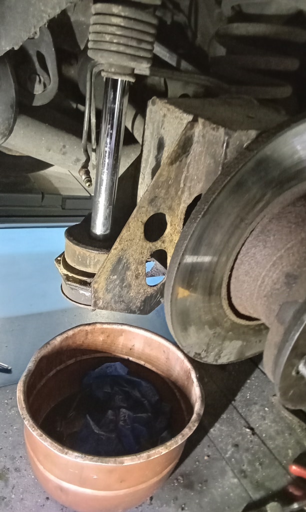 ‘Fit caliper and secure. Refit brake pads. Resecure pipes and cable tie abs wire to pipes. Adjust handbrake links. Tidy area and check LHM level in tanks under bonnet. Prep for bleding but lower remote nopple seized in block on rear shock mount. Remove and free off. Bleed brake with Johns help. Refit wheel and torque up tight. Check for leaks under pressure, all looks OK.’