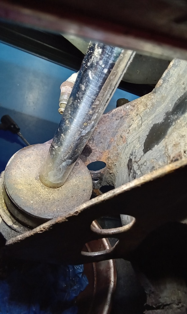 ‘Remove cover over top bolt and emove nut. Found camber washers behind nut. Fit camber guage to wheel and adjust camber positive direction until maximum adjustment reached. Approx -0.75 degrees. Much better than the -2.5 degrees it was. Tighten top bolt and refit cover.’