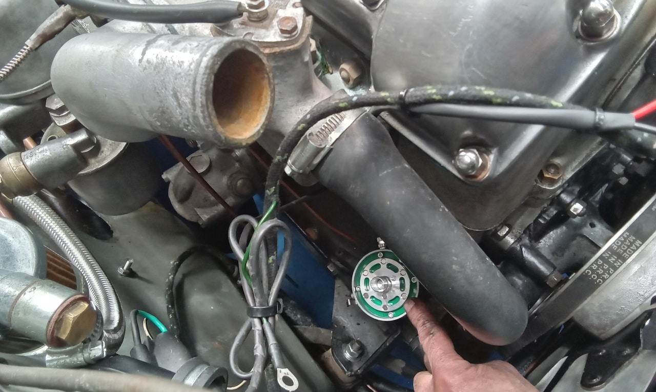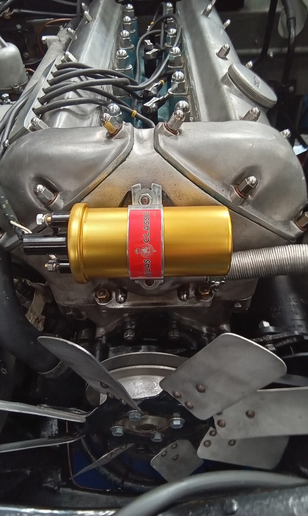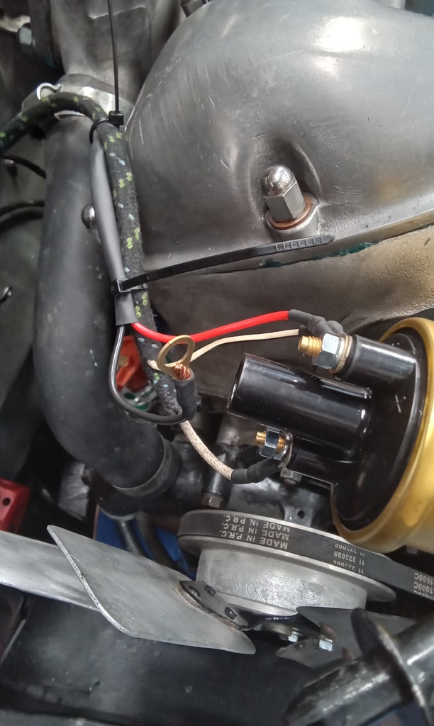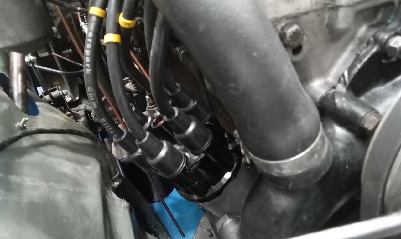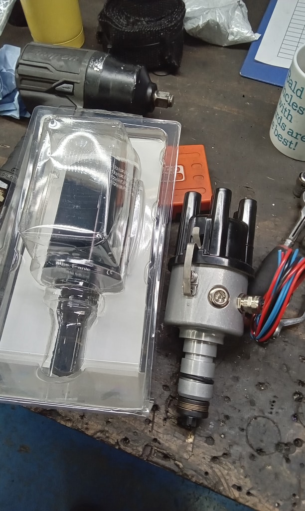 ‘Adjust distributor torquecurve setting and refit cap. Remove clamp from old dizzy and mount to engine. Swap seal and fit dizzy. Move to a position that wires and vacuum port accessible. Route wiring to coil and crimp on ring terminal. Find ignition live and connect wire. Tape up and secure to inner wing.’