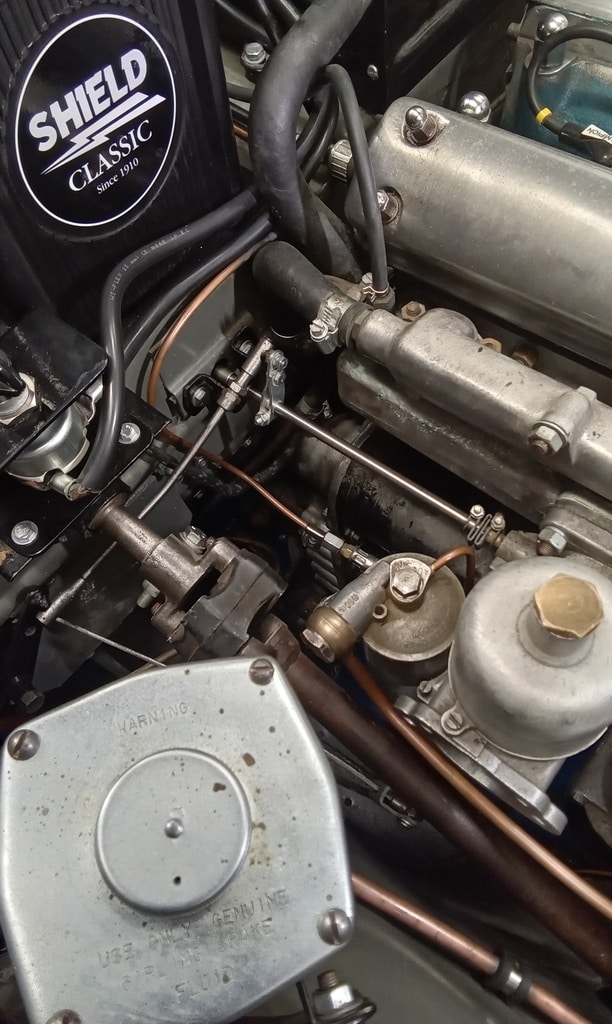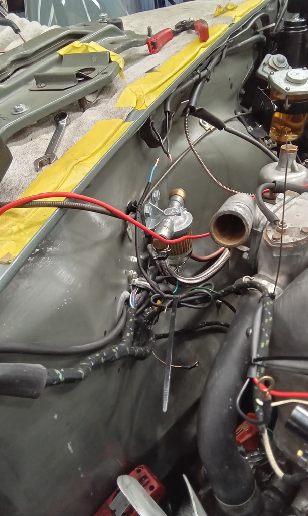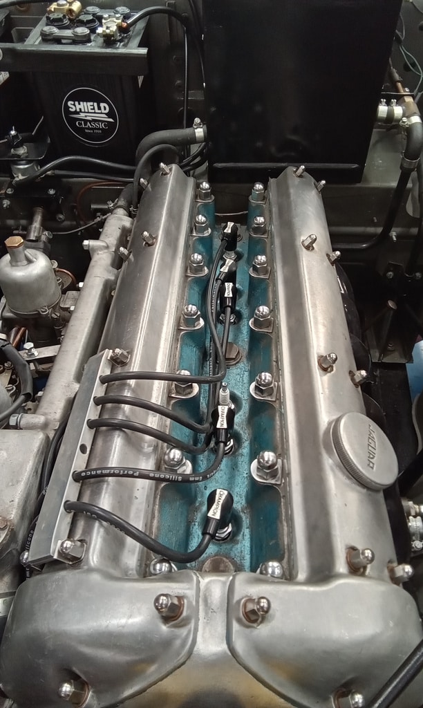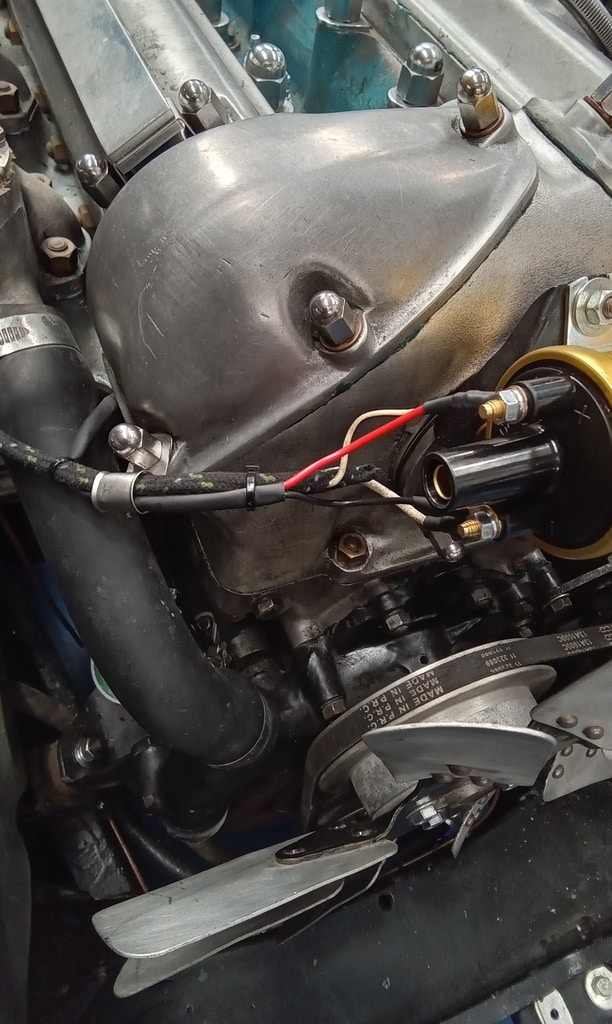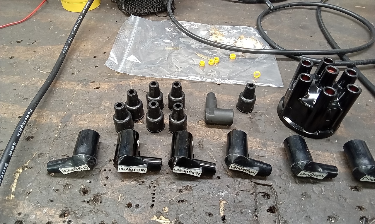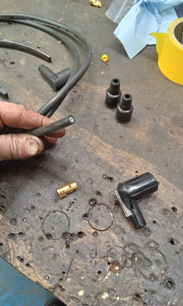 ‘Tidy and secure wiring and now dizzy set crimp ring terminal to black wire and connect to coil. Fit P clip to hold loom near coil. Start making new Ht leads. Measure and cut cable to length starting at cylinder 1 nearest bulkhead. Finish making leads. Finally make new coil lead and connect. Turn on ignition and Crank over briefly and switch off. Check for fuel leaks at carbs and pipes. Tighten float bowl top nuts and unions to carbs. Clean up.’