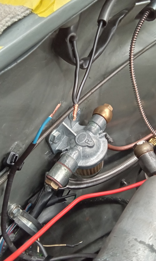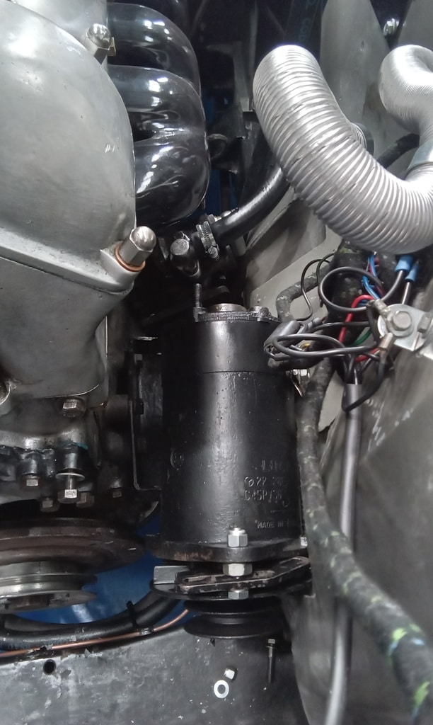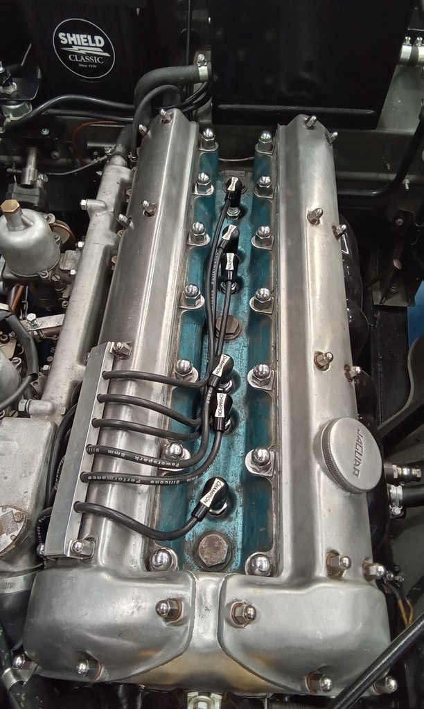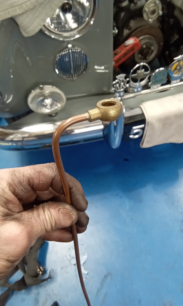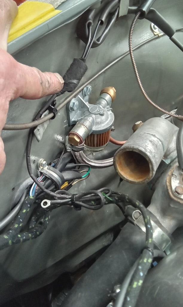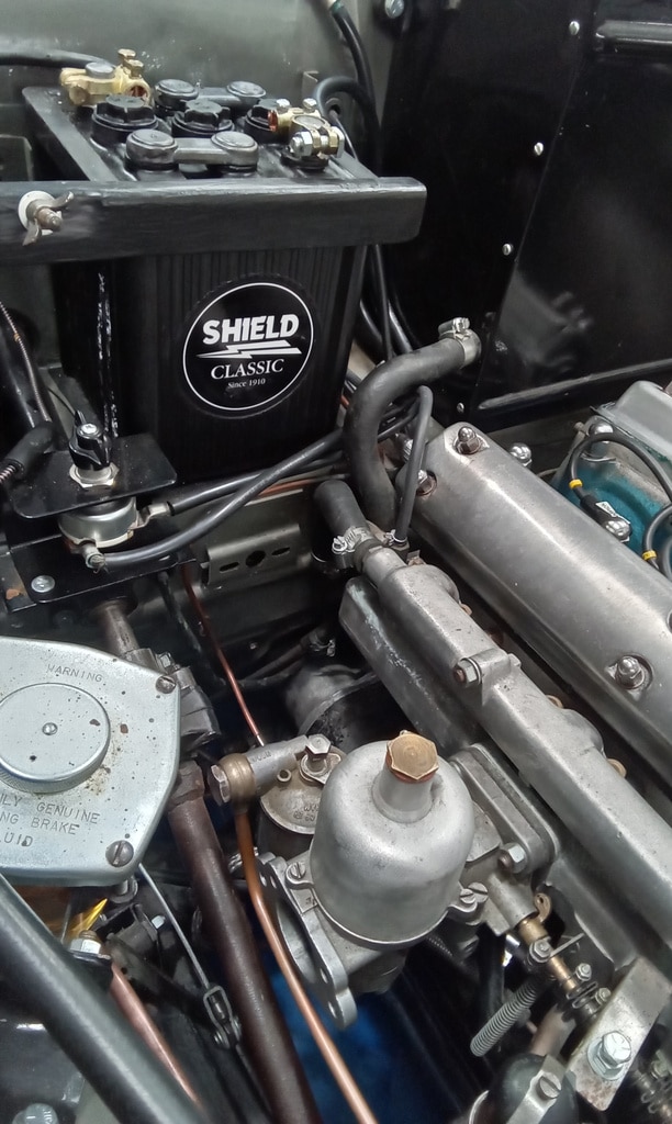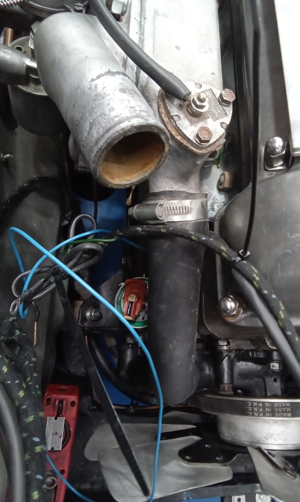 ‘Tidy and secure wiring and now dizzy set crimp ring terminal to black wire and connect to coil. Fit P clip to hold loom near coil. Start making new Ht leads. Measure and cut cable to length starting at cylinder 1 nearest bulkhead. Finish making leads. Finally make new coil lead and connect. Turn on ignition and Crank over briefly and switch off. Check for fuel leaks at carbs and pipes. Tighten float bowl top nuts and unions to carbs. Clean up.’