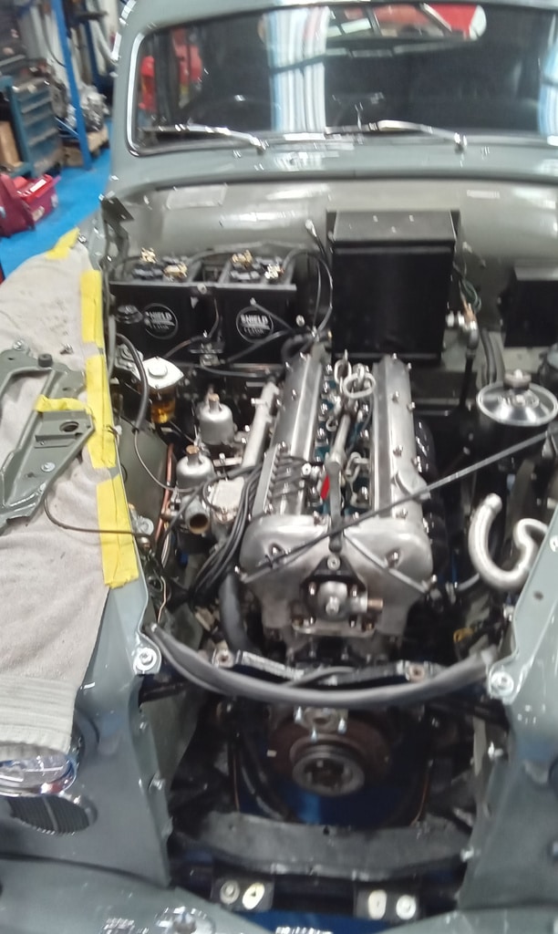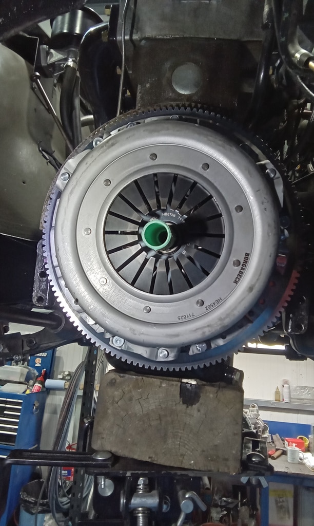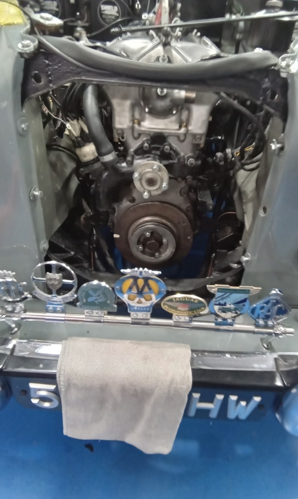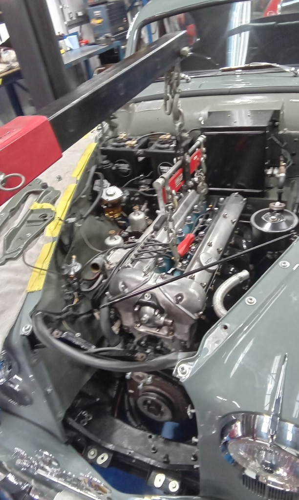 Once the correct clutch arrived at the workshop, Jon could get the engine back into the car. Using the engine crane, Jon (with the help of Rob) got it safely into the engine back of the classic Jaguar along with the new gearbox. Once in the car, the team seperated the gearbox from the engine block to fit up the new clutch unit (including the pressure plate). Whilst the engine was put into place, Jon could change over some of the older engine mounts for new units, but once all in place Jon could fit up the starter motor and exhuast.