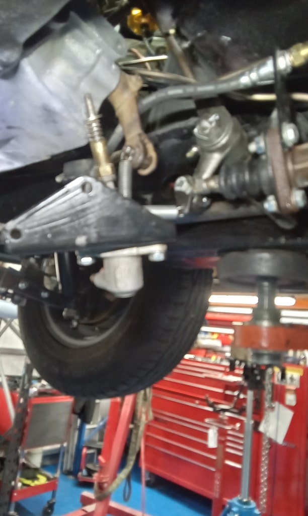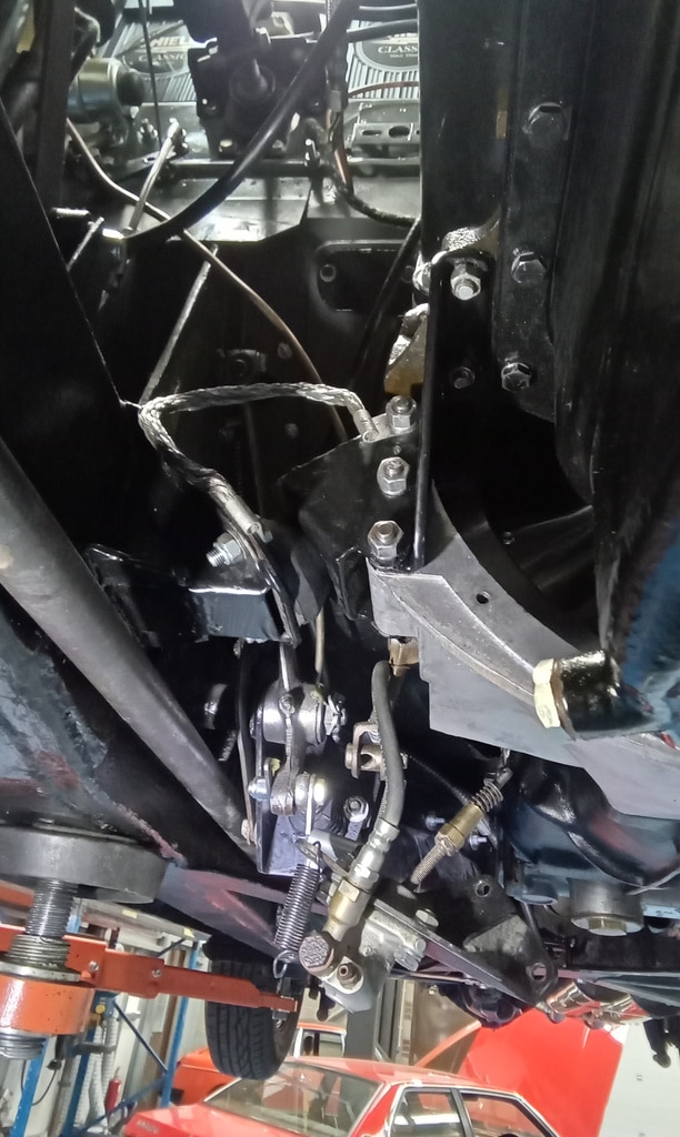 Once the engine and gearbox were securely in their mounts, Jon could remove the engine crane and put the car higher up on the ramp in order to fit the new clutch save cylinder as well as rerouting the speedometer cable. Once everything was safely in place, Jon could refit the prop shaft and bolt it in at the yoke and then lower back onto the workshop floor so he could begin fitting the dynamo and power steering pump to the back of the unit along with the belt, fan and pulley. Carefully, Jon got the car back to its TDC timing marks and refitted the throttle linkage.