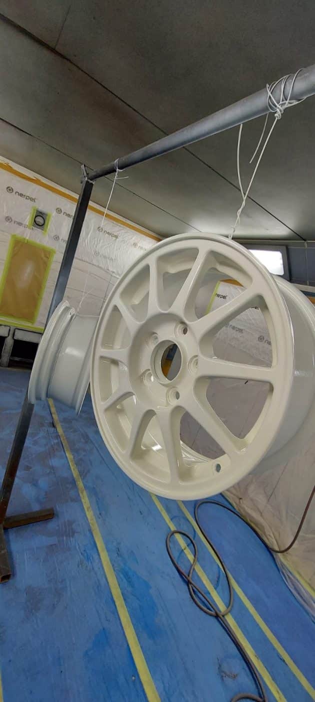 Chris has been hard at work getting the correct colour and finish on the classic wheels to exactly match the white they needed to be. The wheels themselves have been refurbished so the colour was the final step of the process.