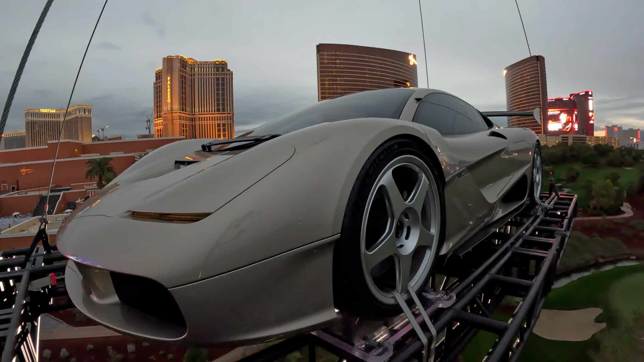 The auction took place during the amfAR Gala, hosted alongside the Las Vegas Formula One Grand Prix. In something of a fitting entrance for the location, S1 LM made an interesting entrance, suspended beneath a helicopter and lowered into the Wynn hotel venue. Normally, this would be a bit much, but as GMSV call the car “The Special One”, the entrance does make sense.