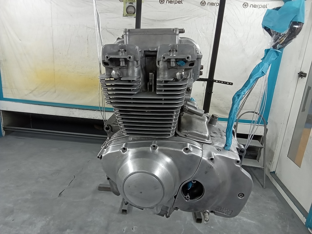 The engine of our 1984 Suzuki GSX400T has been with Mauro in the Bridge Classic Cars paintshop.