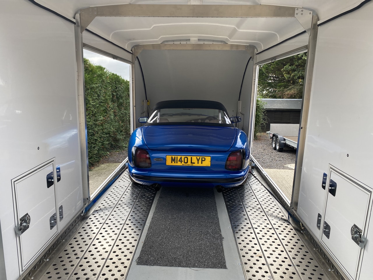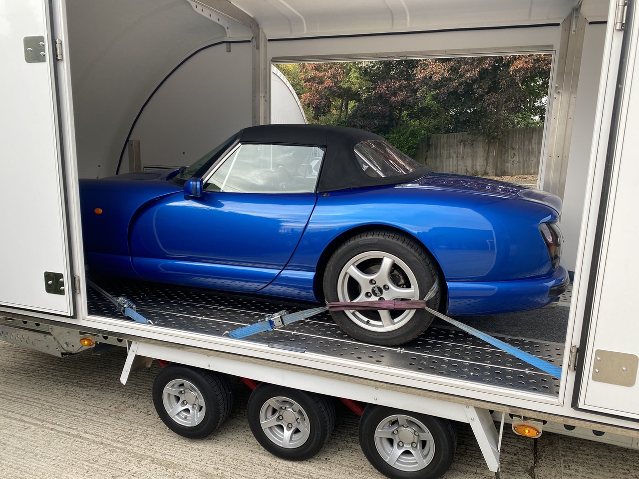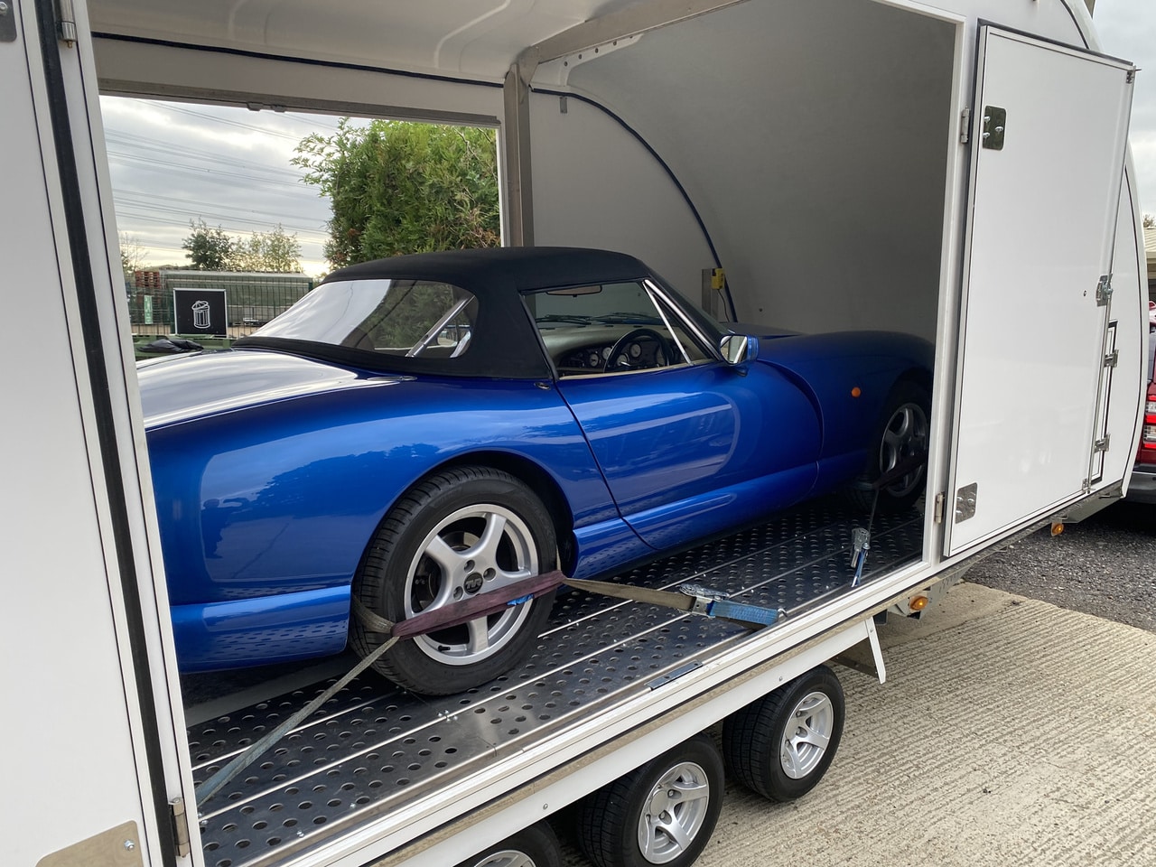The 1994 TVR Chimaera has been loaded up into our enclosed trailer to make its way home after being at the Bridge Classic Cars restoration workshops for some TLC and work having been done on it.