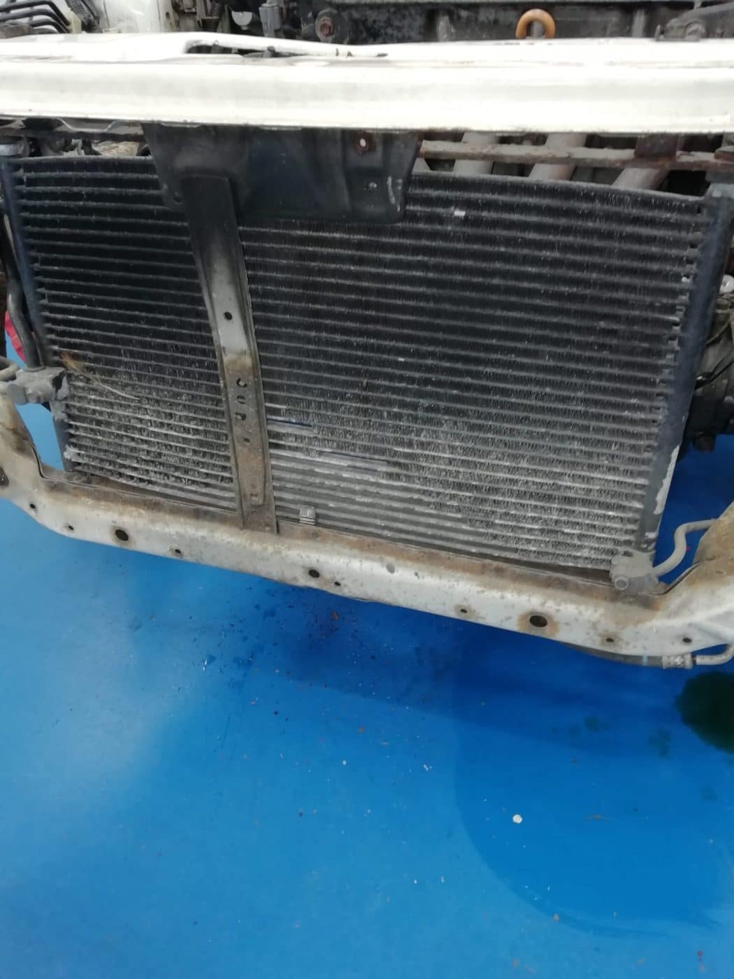 As you can see, the radiator and air conditioning condenser are in desperate need of repair so these will be overhauled prior to being refitted.