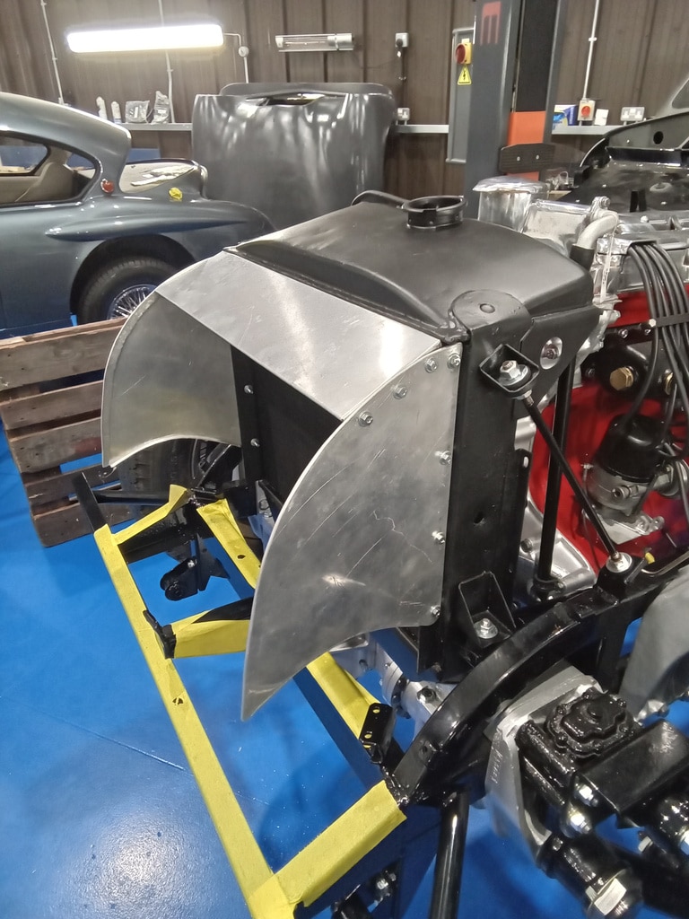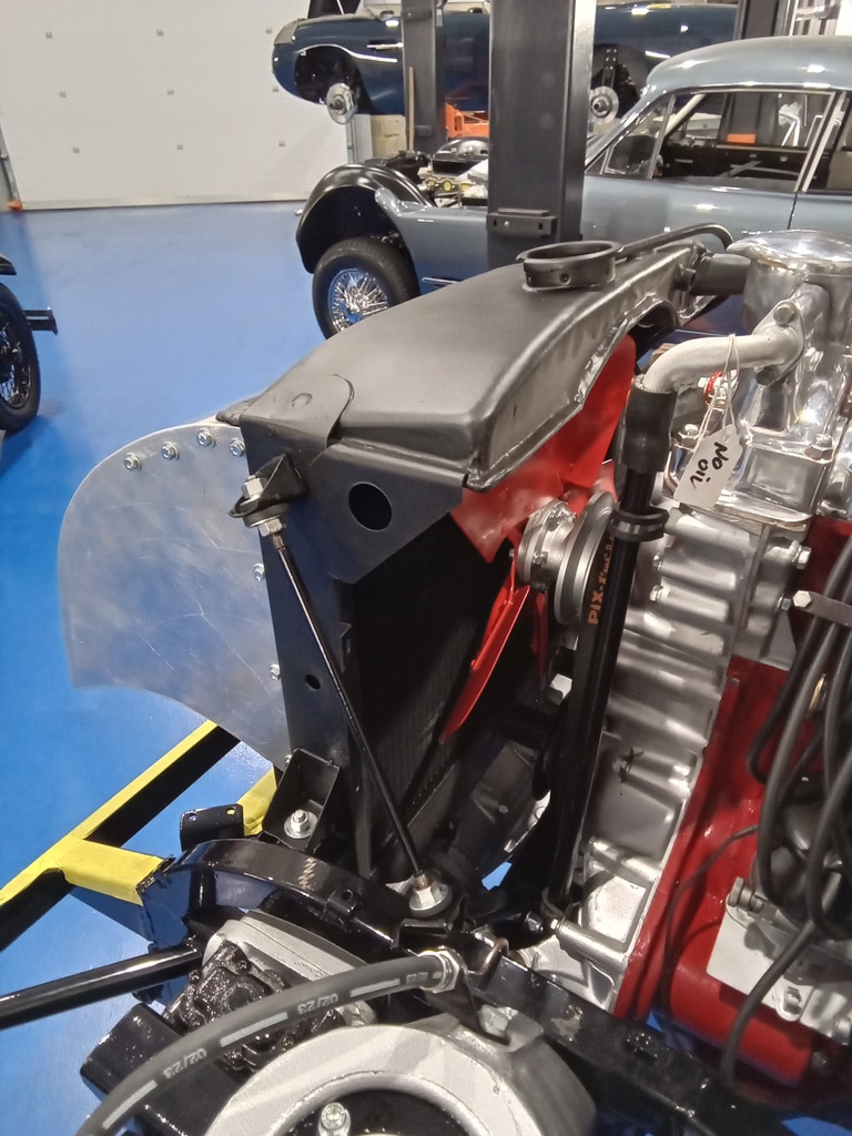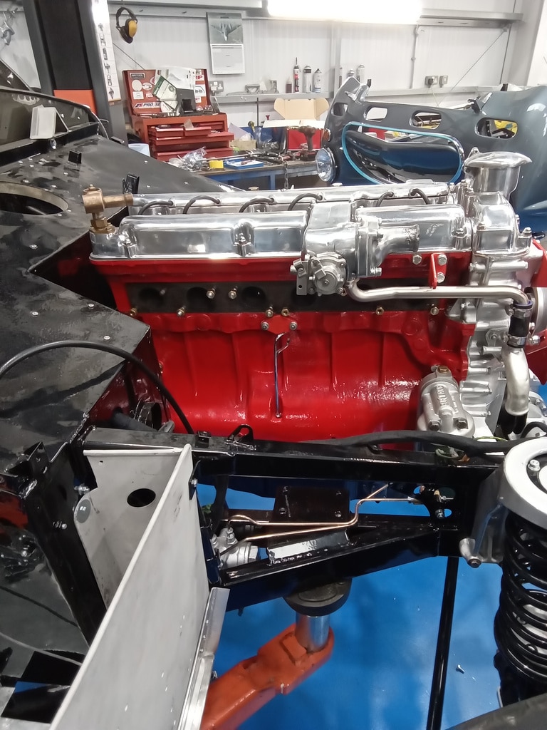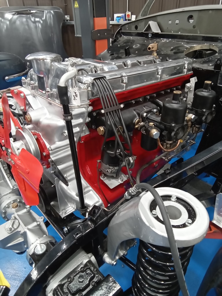 The freshly rebuilt straight-six and manual gearbox arrived back recently at our restoration workshop ready to go into the refurbished chassis. Our technician Rob, who has been heading up this project, carefully lowered the engine block and gearbox into the chassis before then test fitting the radiator, radiator braces aswell as the custom made cowel panels.