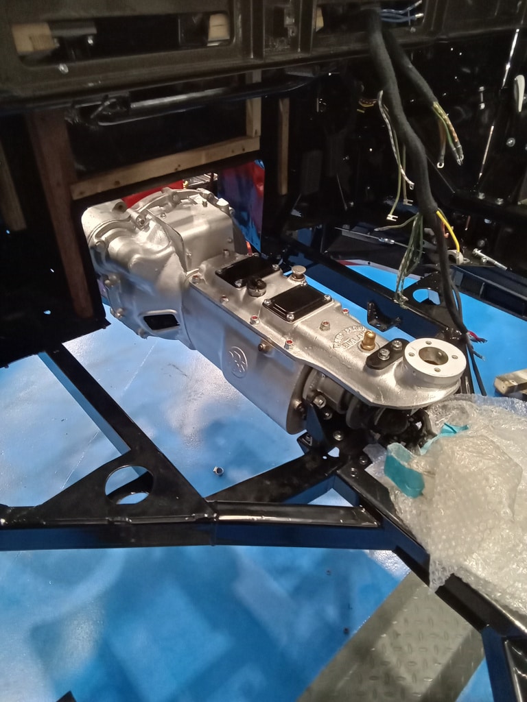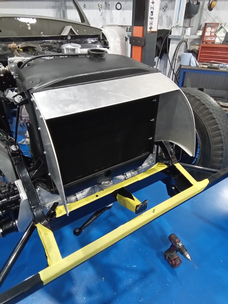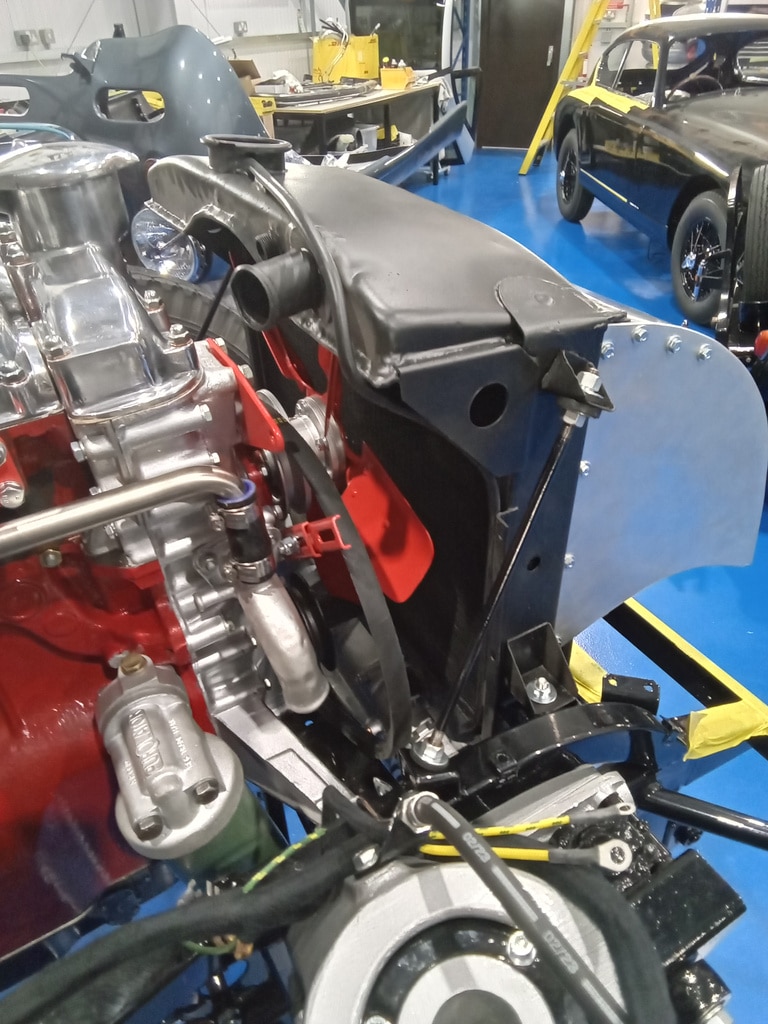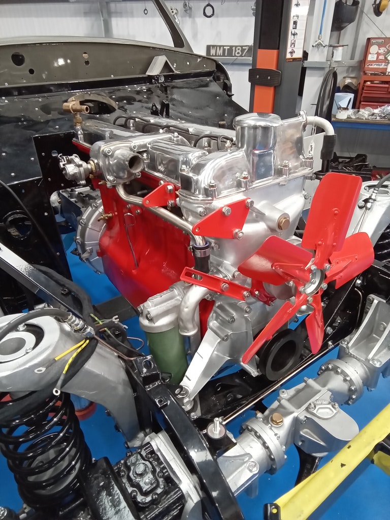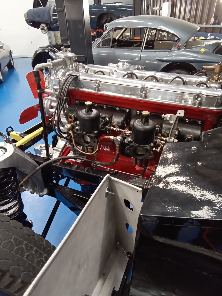 The freshly rebuilt straight-six and manual gearbox arrived back recently at our restoration workshop ready to go into the refurbished chassis. Our technician Rob, who has been heading up this project, carefully lowered the engine block and gearbox into the chassis before then test fitting the radiator, radiator braces aswell as the custom made cowel panels.