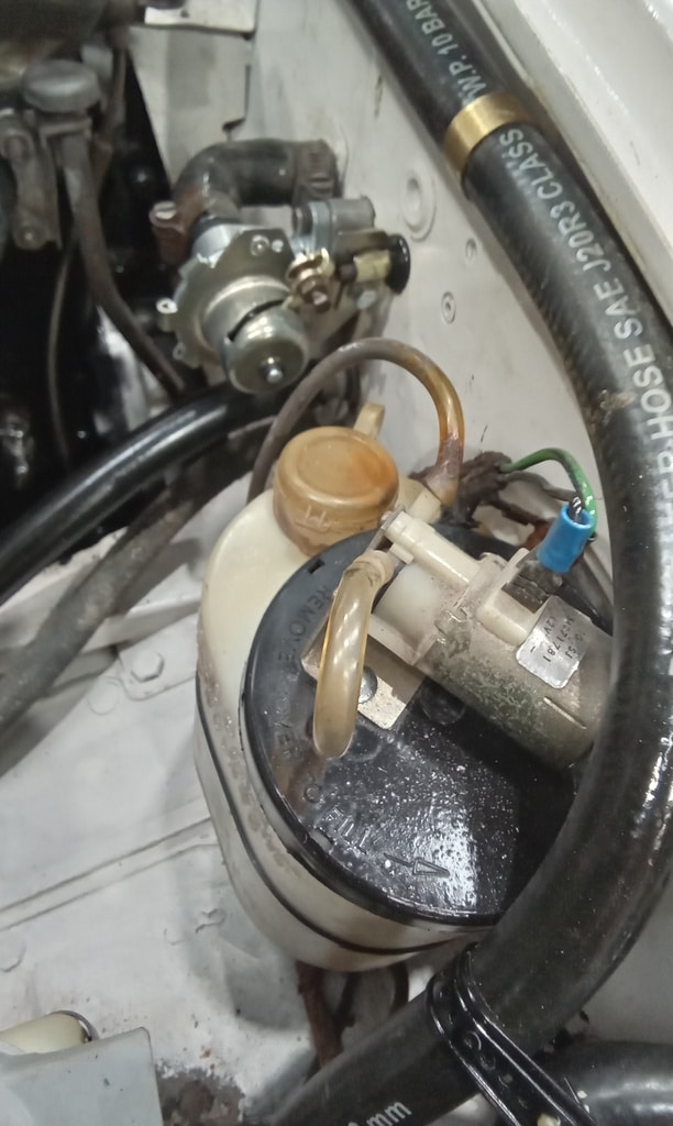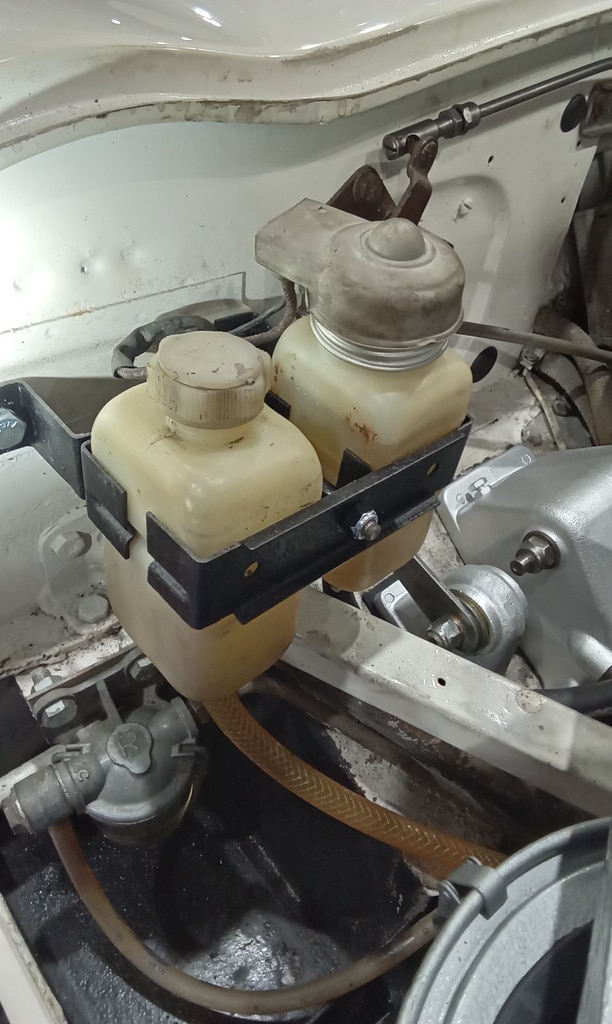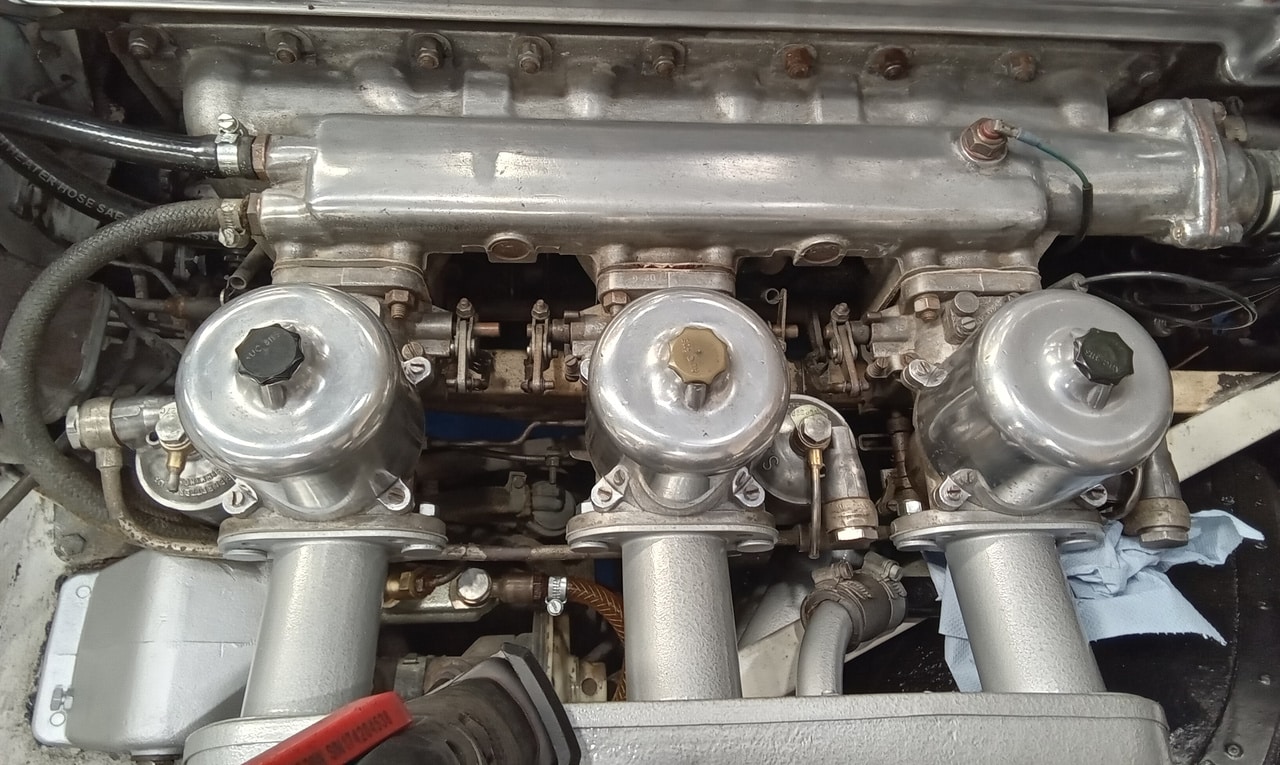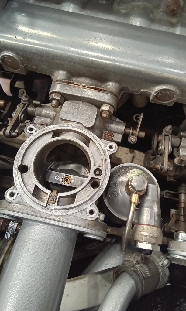 ”Fit new fuse for main beam test and refit panel. Set each carb jet depth to approx 2mm and refit chambers. Adjust throttle linkages so all carbs act together. Bleed clutch. Seems ok but needs testing outside. Bleed brakes. Again feel OK but ned testing. Find keys to fit door locks.”