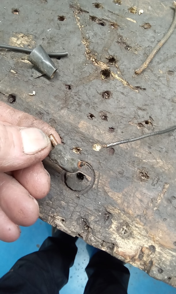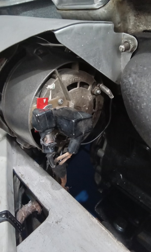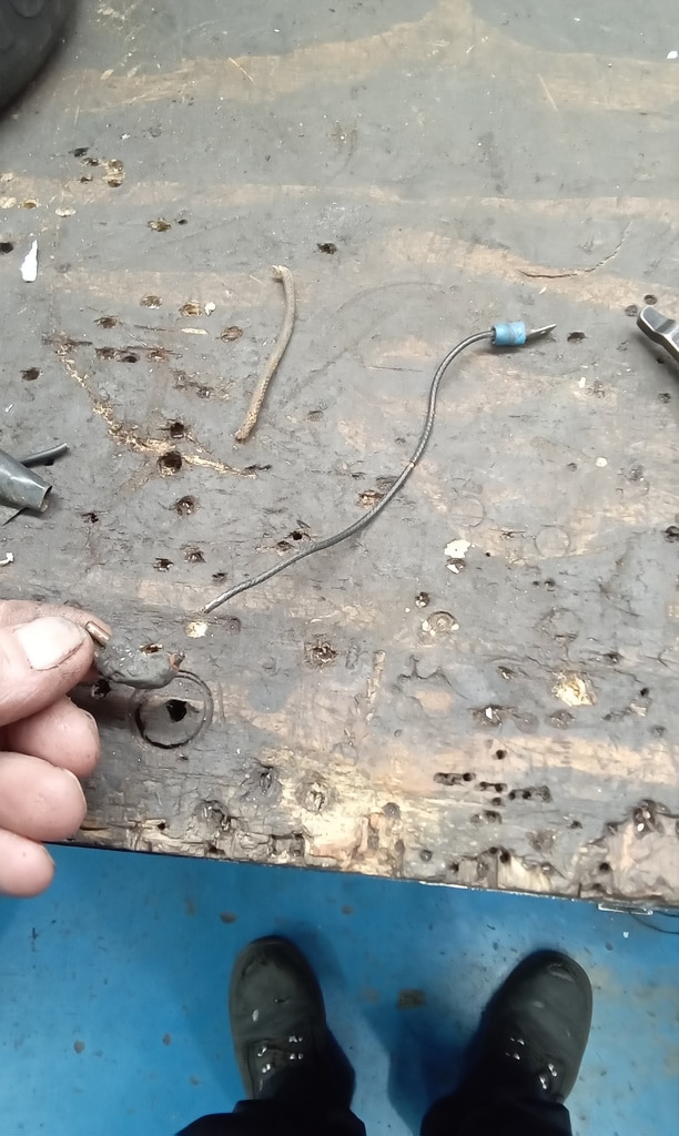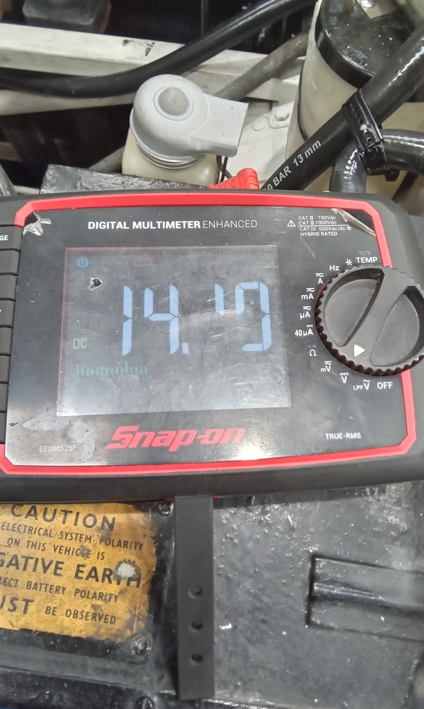 ”Carry out check over/pdi. Start repairs. Inflate tyres and knock up wheels. Grease all points. Check charging, OK 13.4v. Check wiring to alternator as ignition light will not extinguish. Found bad wire at alternator. Make new wire and fit. Still the same. Clean connectors at regulator and recheck. 14.2v but light still on. Disconnect relay and light goes out so suspect faulty relay. Washers not working properly. Fill bottle. Reconnect pipe and test. Both jets facing wrong way so adjust. Nearside works butfound offside off jet behind dash frame. Fit screw to pipe and leave as is. As unable to reach jet without stripping dash. Tighten connections to offside front side light. Remove passengers seat and remove outer runner as captive nut pulled through and seat insecure. Straighten runner and clean. Fit repair washer behind split and refit runner and secure. Refit seat.”