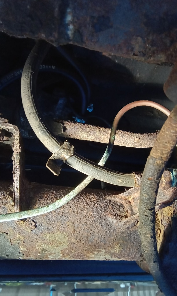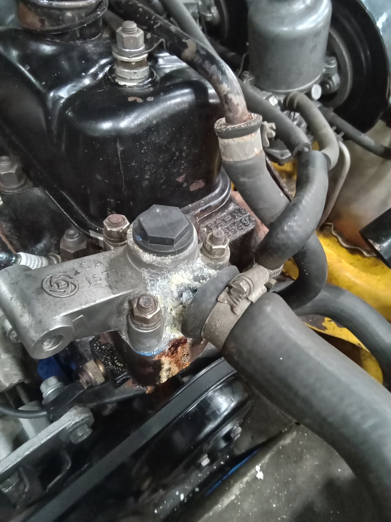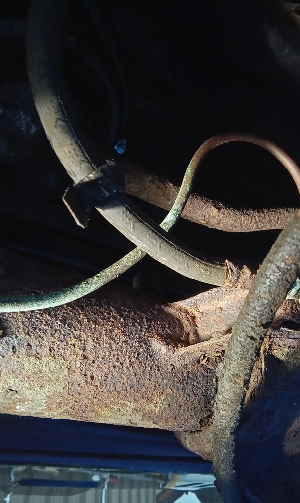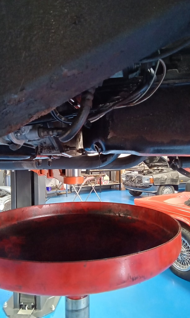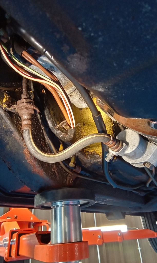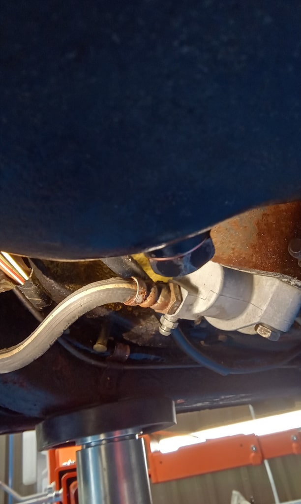 ”A few issues flagged up such as the perished clutch flexi hose which has a bulge restricting flow hence the pedal being slow to return. The rear brake flexi is cracked. Coolant hose from rad top is leaking onto the thermostat housing. The heater valve is leaking also.