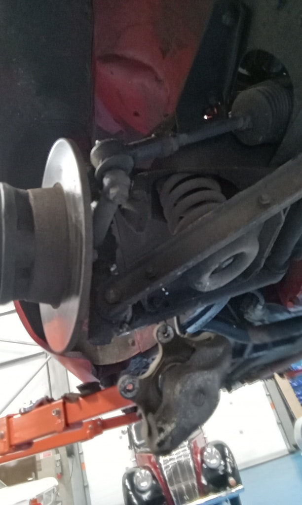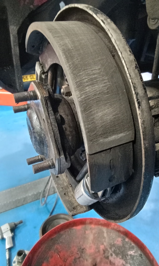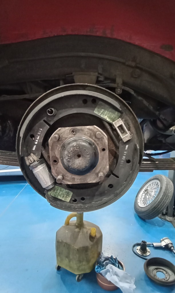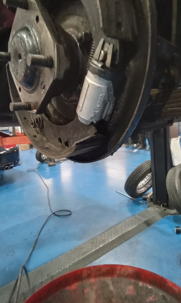 ”Begin inspection go through underneath of car, remove drums and clean up shoes on both sides remove calipers, make note of anything that needs sorting. Continue inspection deglazebrake pads and clean up, refit calipers, continue going through inside of car and boot, make a note of anything not working. Continue inspection go through engine bay, run car rup to temperature to check everything, full grease up of car, have a look at loose mirror and remove bolts.”