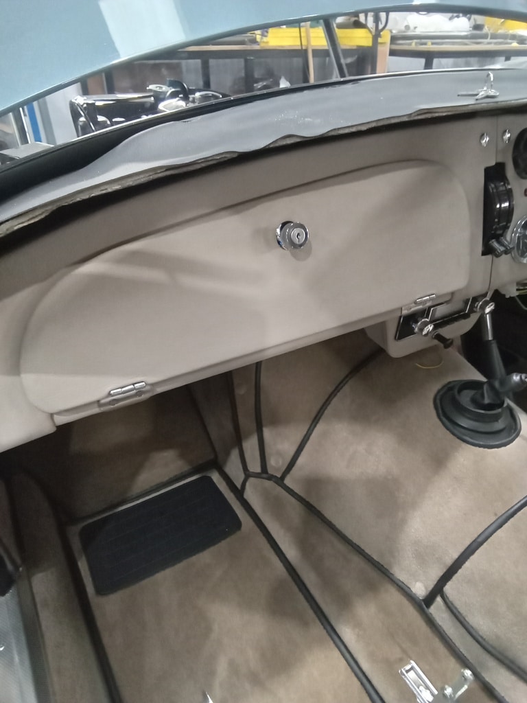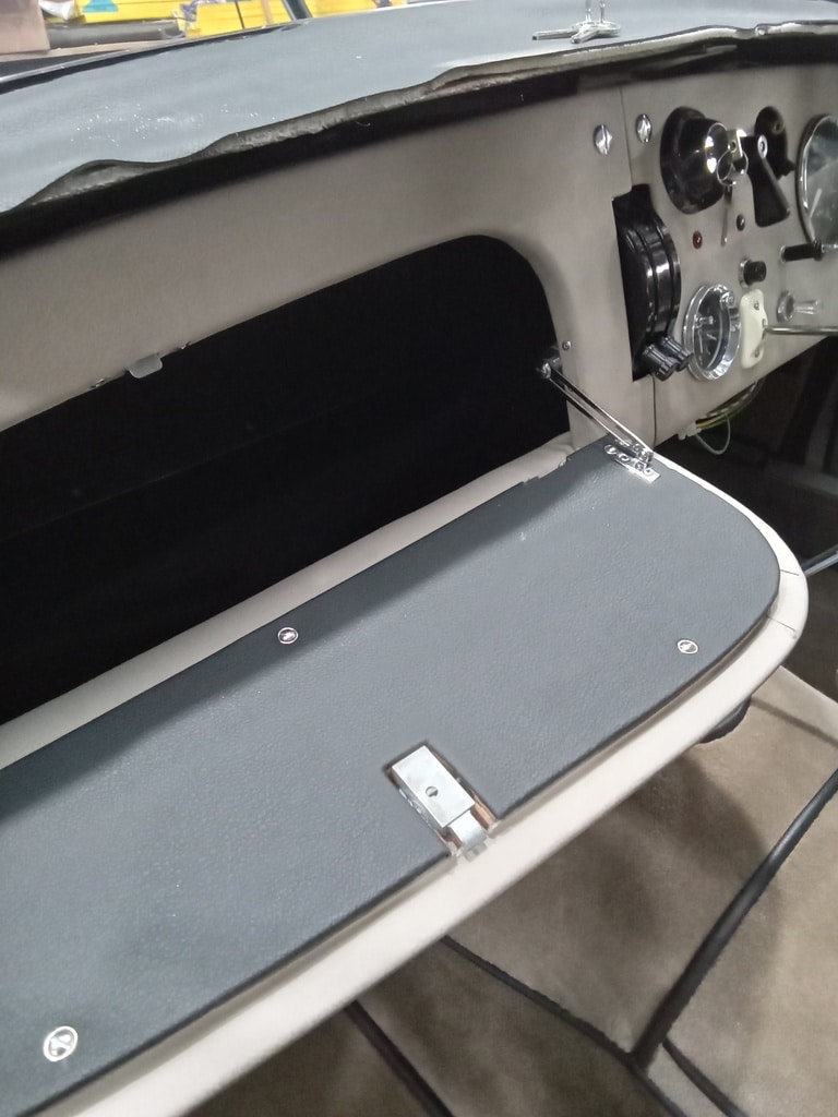 The restoration team at the Bridge Classic Cars HQ have been working on the 1960 Jensen 541R restoration project, but this time focusing in the cabin. Our trim team have made the glovebox for this particular car, matching the cars colour scheme.