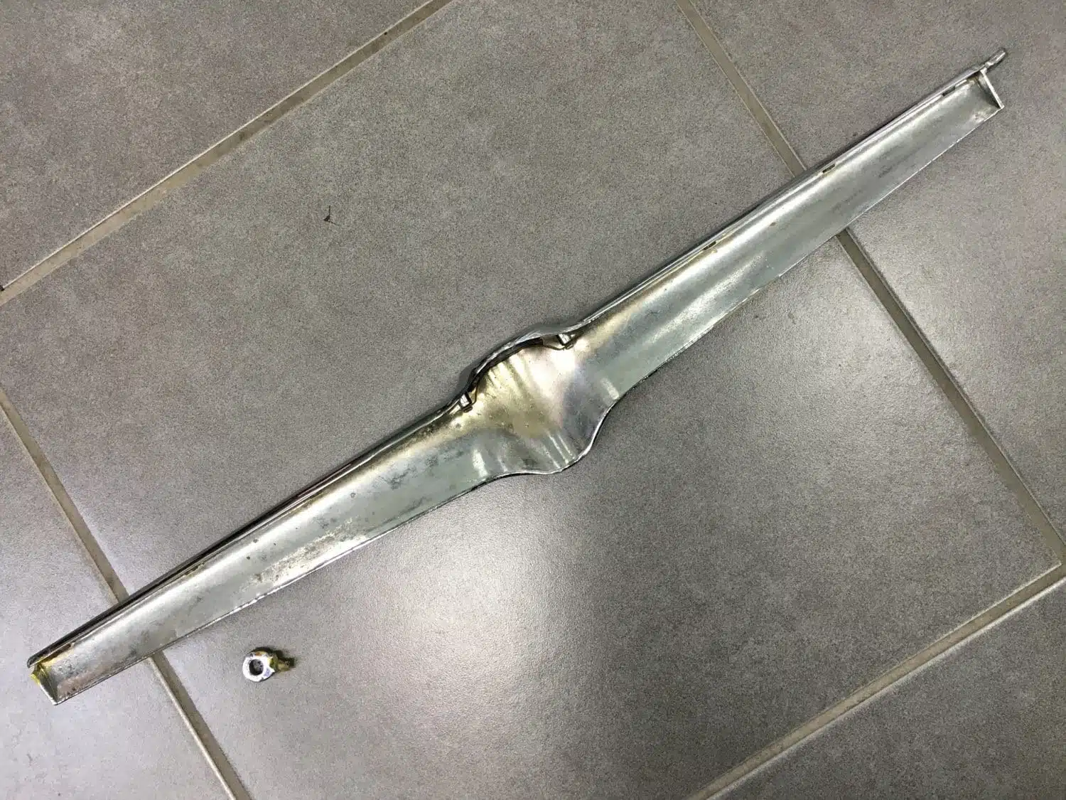 [vc_row][vc_column][vc_column_text]As we start to strip our 1965 jaguar E-Type of it’s components ready for the bodywork to be prepared we noticed that someone has made a makeshift repair on the front badge bar.