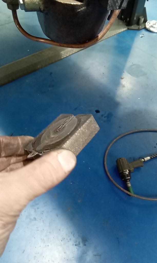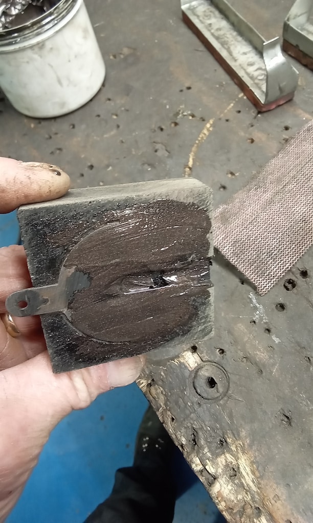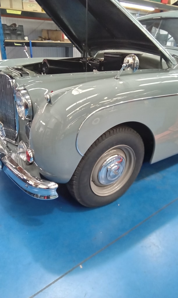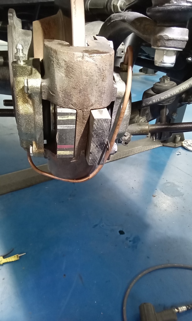 Picking up where he had left off, Jon continued working through the braking system on our 1959 Jaguar MKIX, focusing first on the front assemblies. He cleaned the components thoroughly, carefully sanding the edges of the pads before applying lubrication where needed, and ensured that the pistons were pushing back squarely into their housings. Once satisfied with their movement, he refitted the pads and pumped the system up, noting an immediate improvement as the wheel could now be turned by hand.