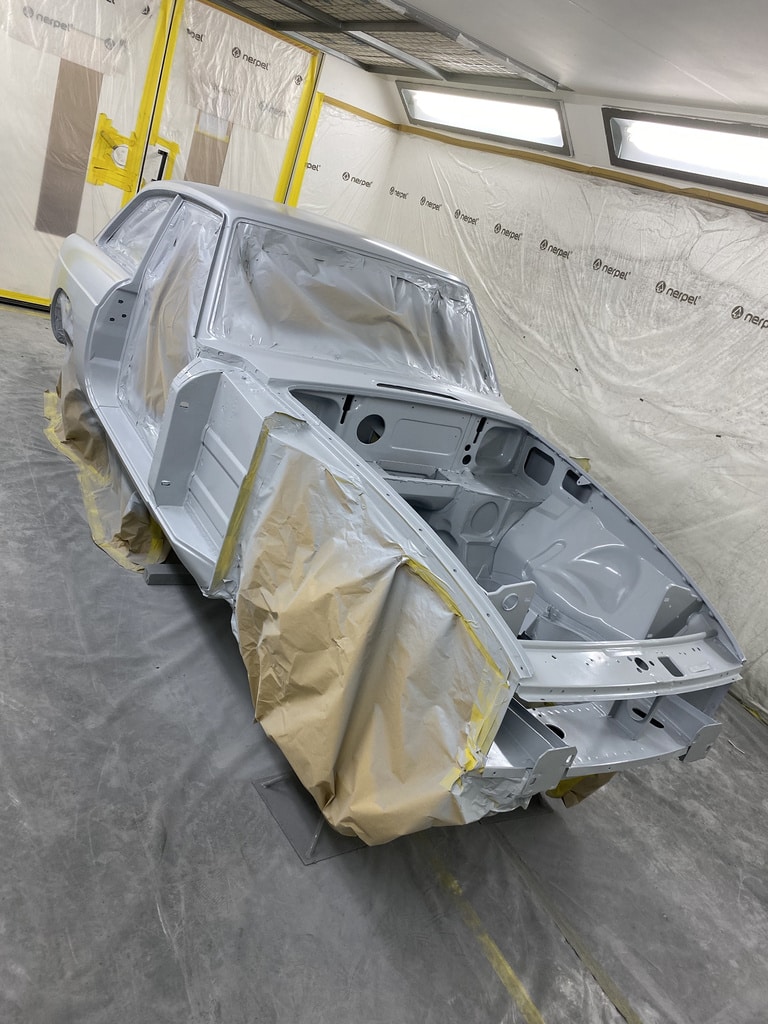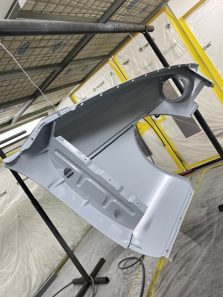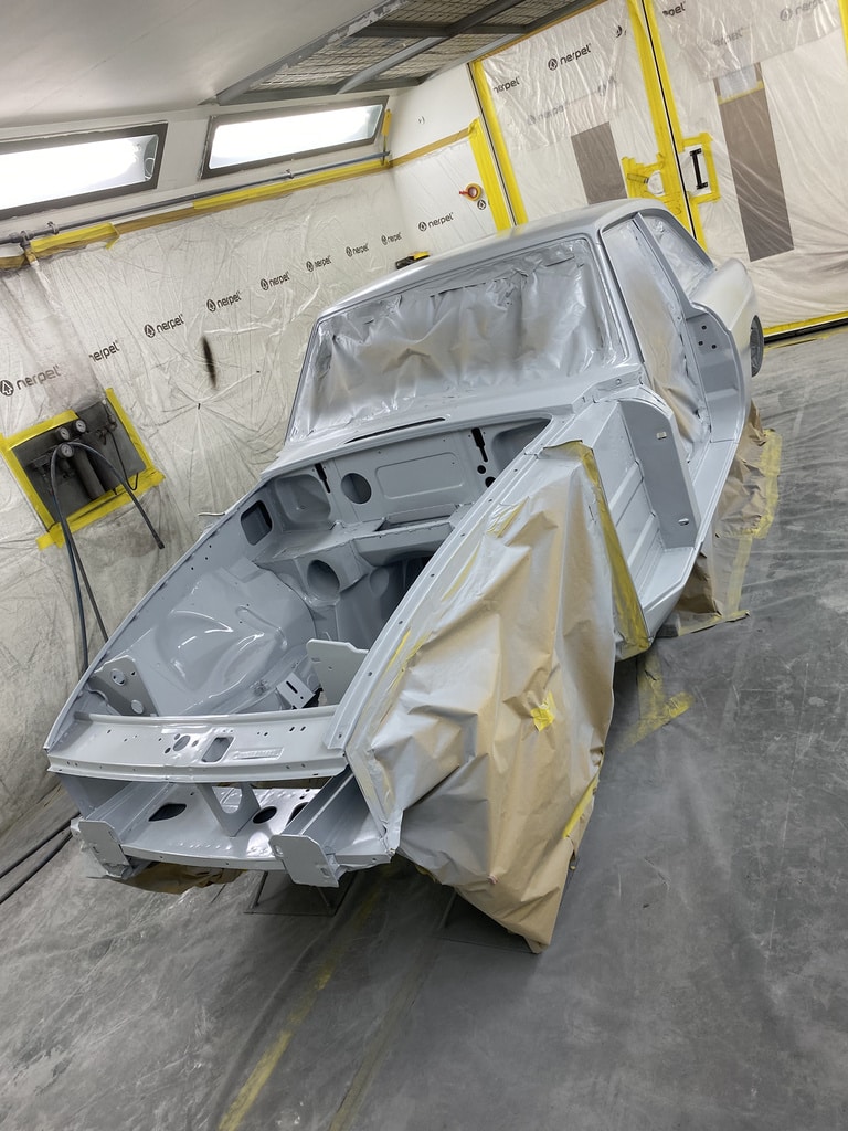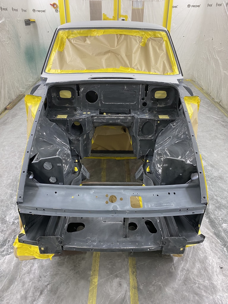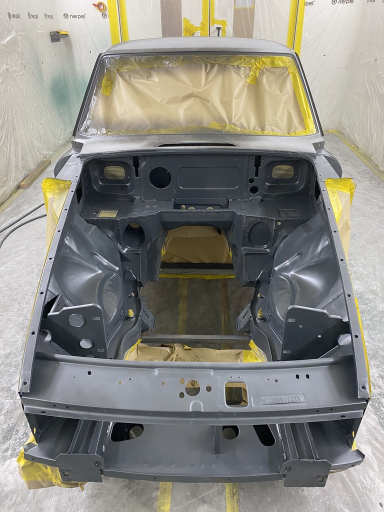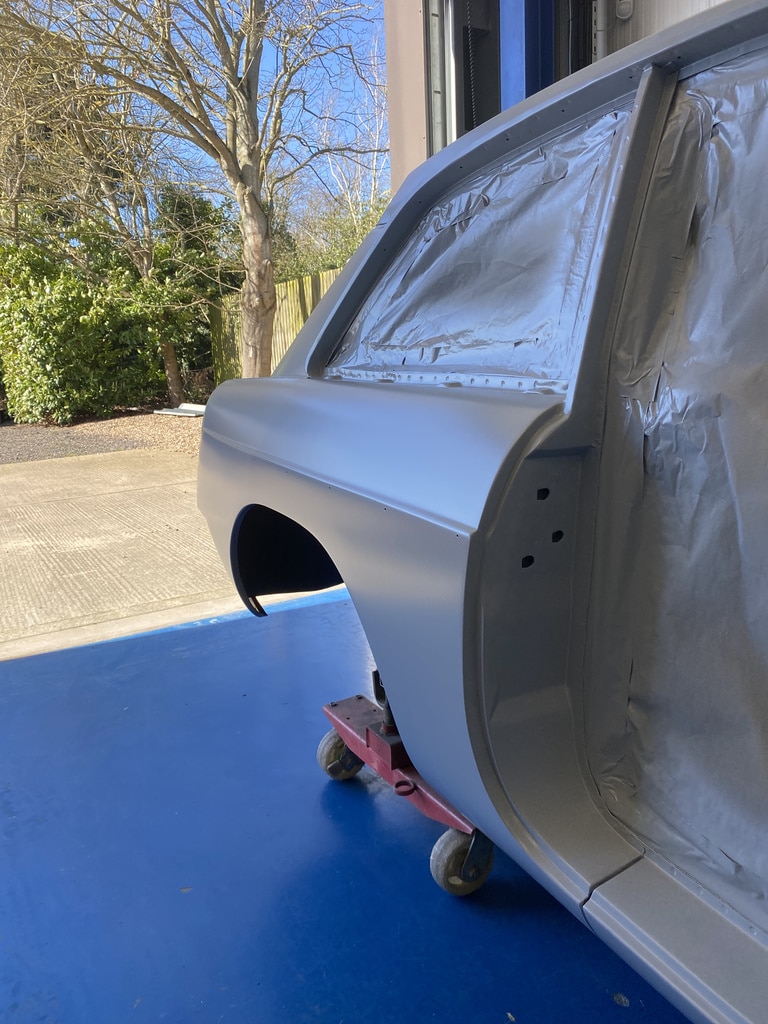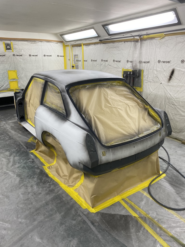 All of the parts, panels and bodyshell have had their final layers of primer sprayed so that Adam can carry out the final stages of sanding before the colour is laid down.