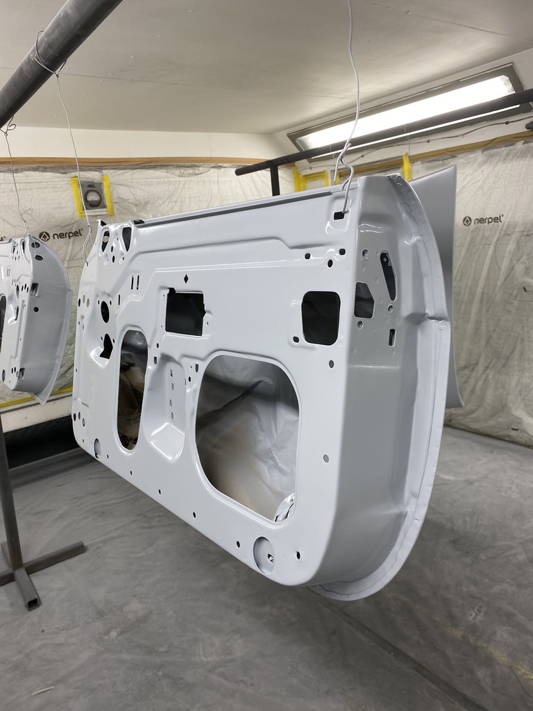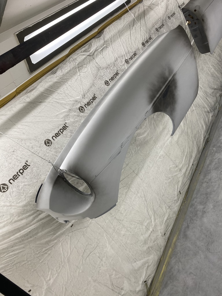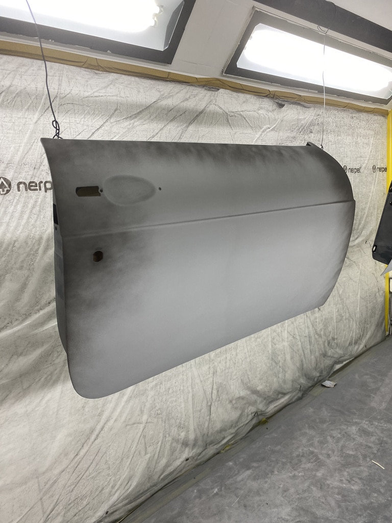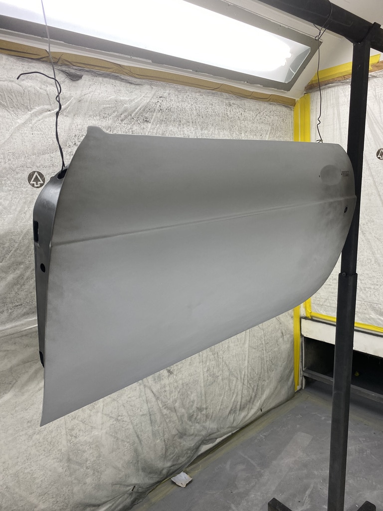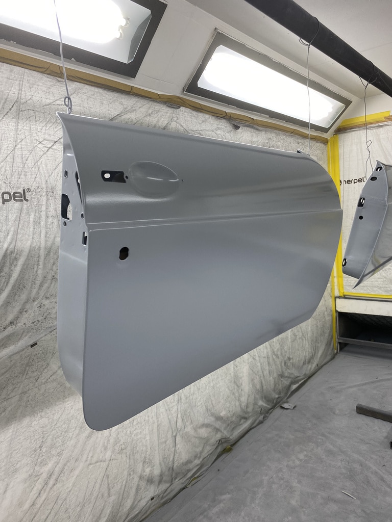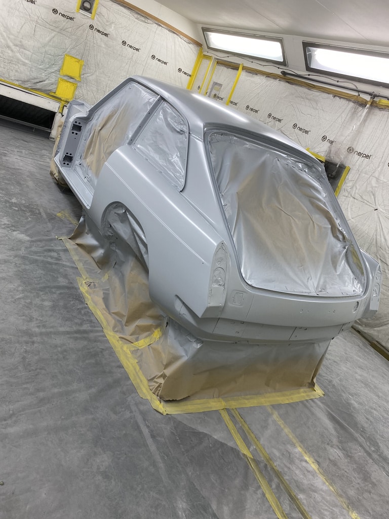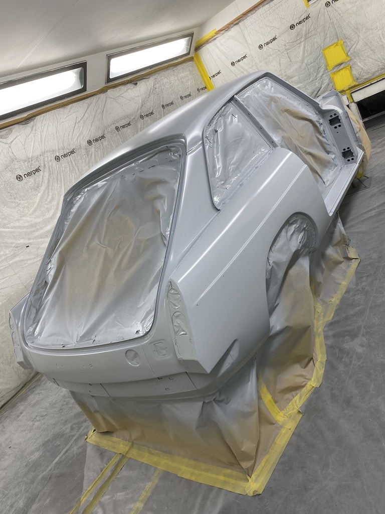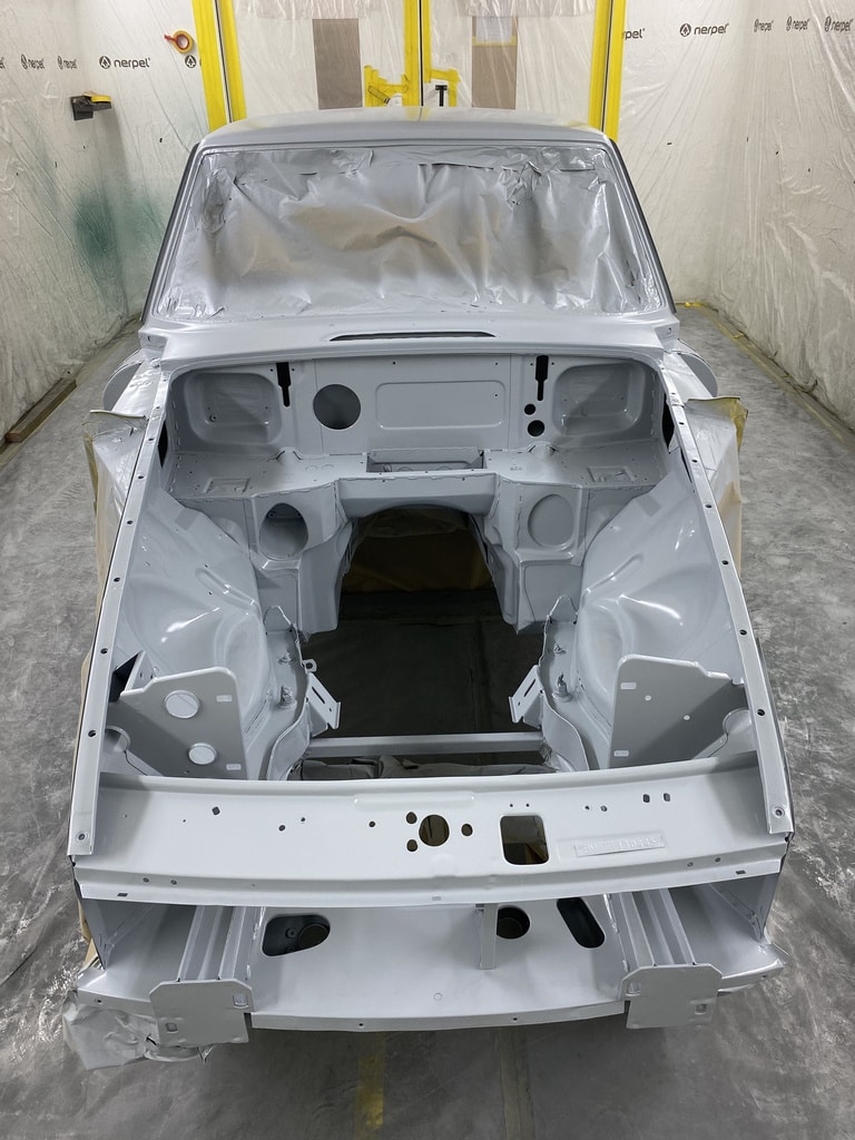 All of the parts, panels and bodyshell have had their final layers of primer sprayed so that Adam can carry out the final stages of sanding before the colour is laid down.