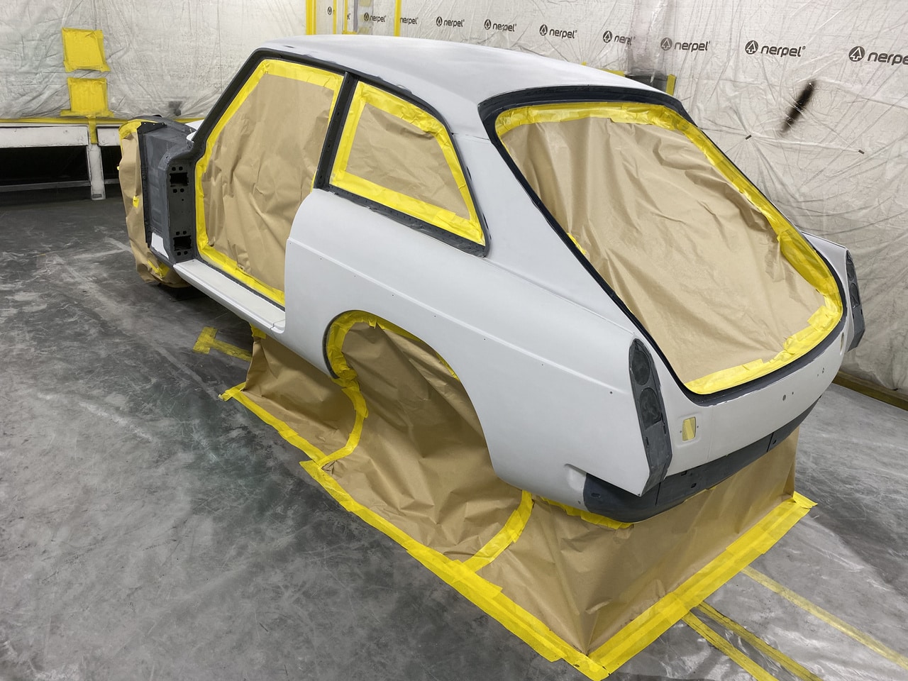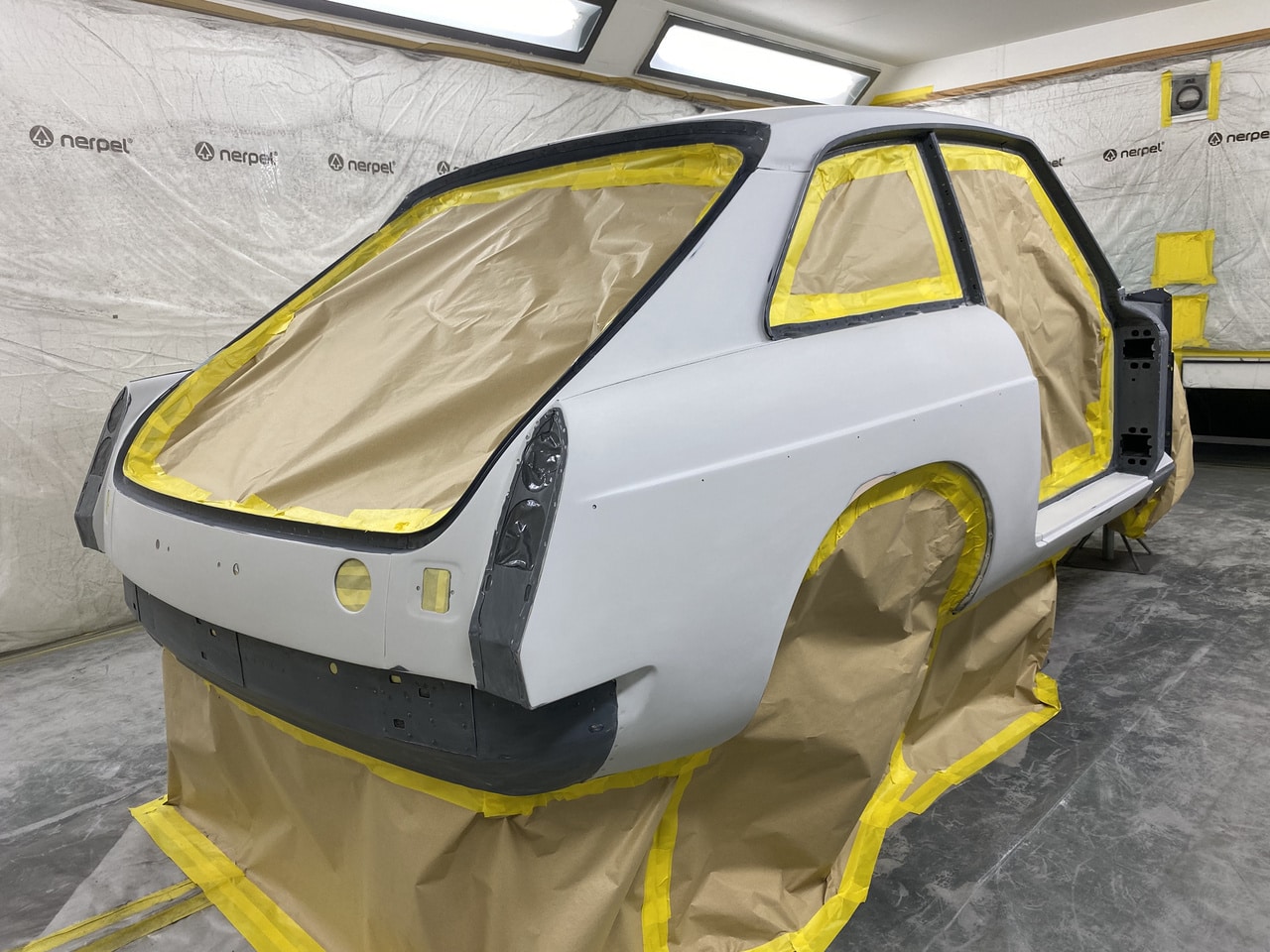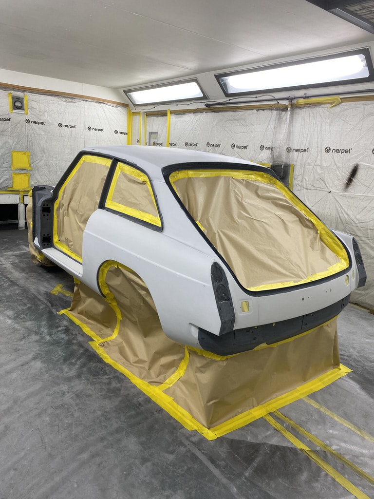 The paint and body team at the Bridge Classic Cars workshops are charging ahead with the build of the 1975 MGB GT V8. Our paint and body technician Adam has been preparing and finessing the bodywork of the classic V8 GT car to get it ever closer to colour.