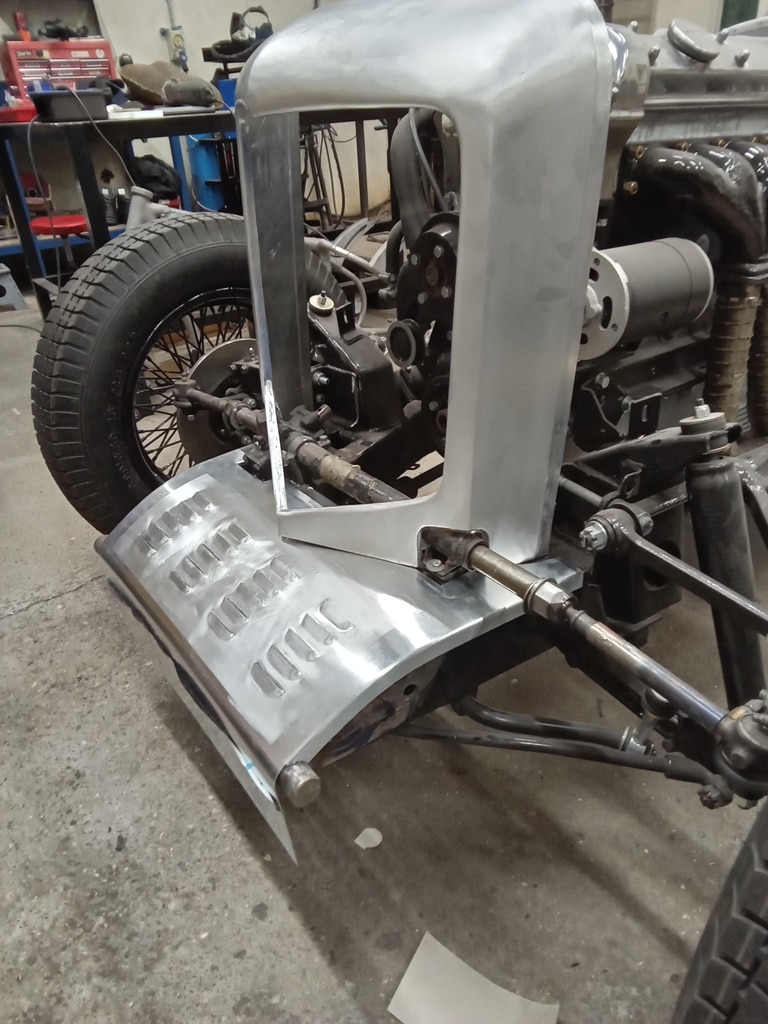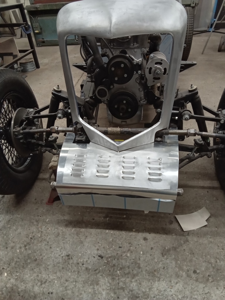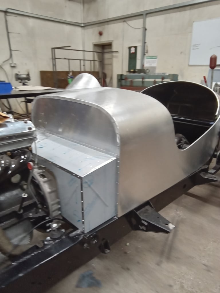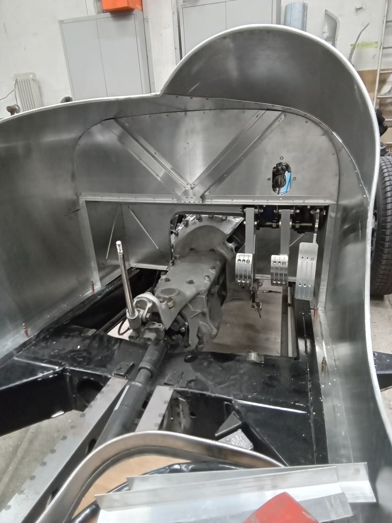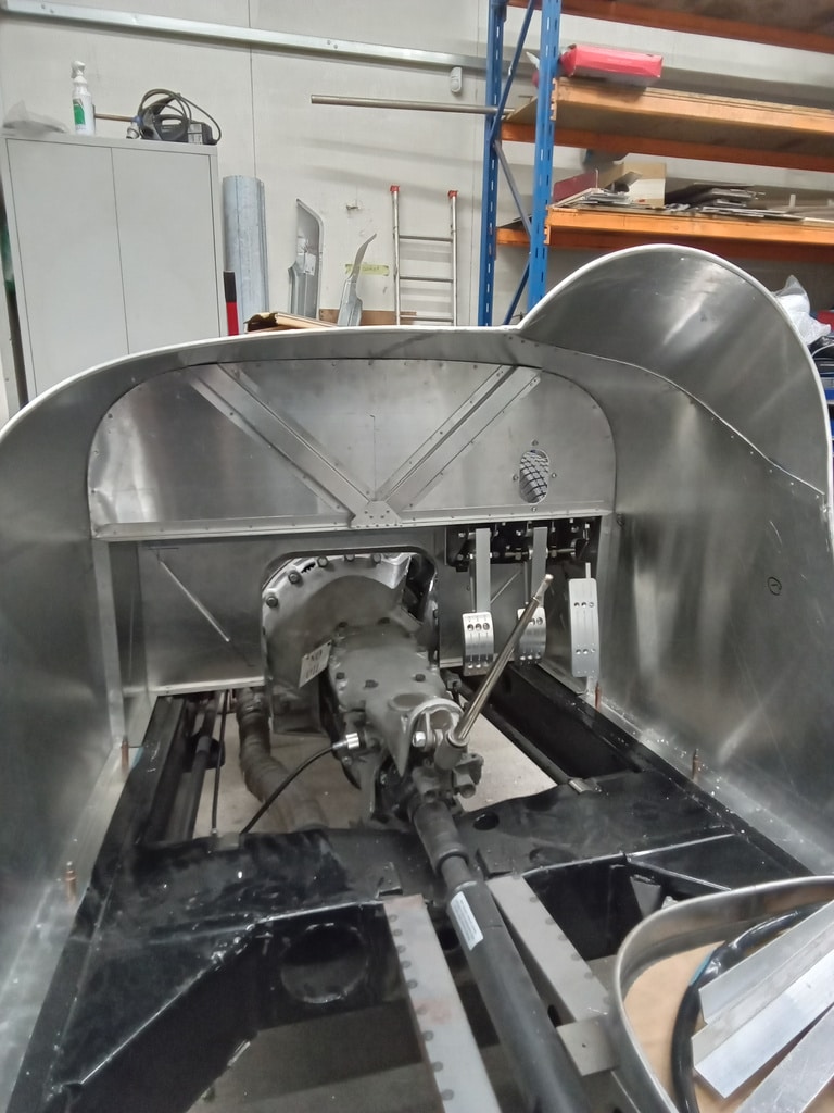 With the rest of the body nearly at its finished shape, Clinton has been working on the all-important grille surround. This part, much like the rest of the car, has been entirely handformed and most especially to fit the car. Clinton has also got most of the firewall built and shaped for the car, with the pedal box now in place following the seat placing.