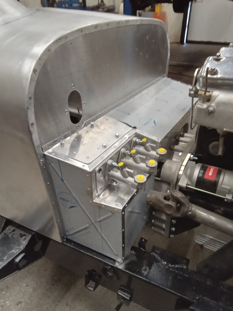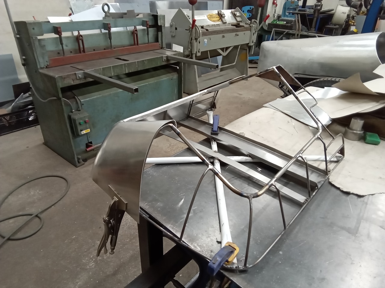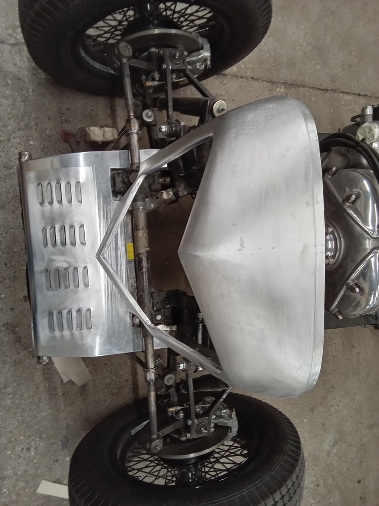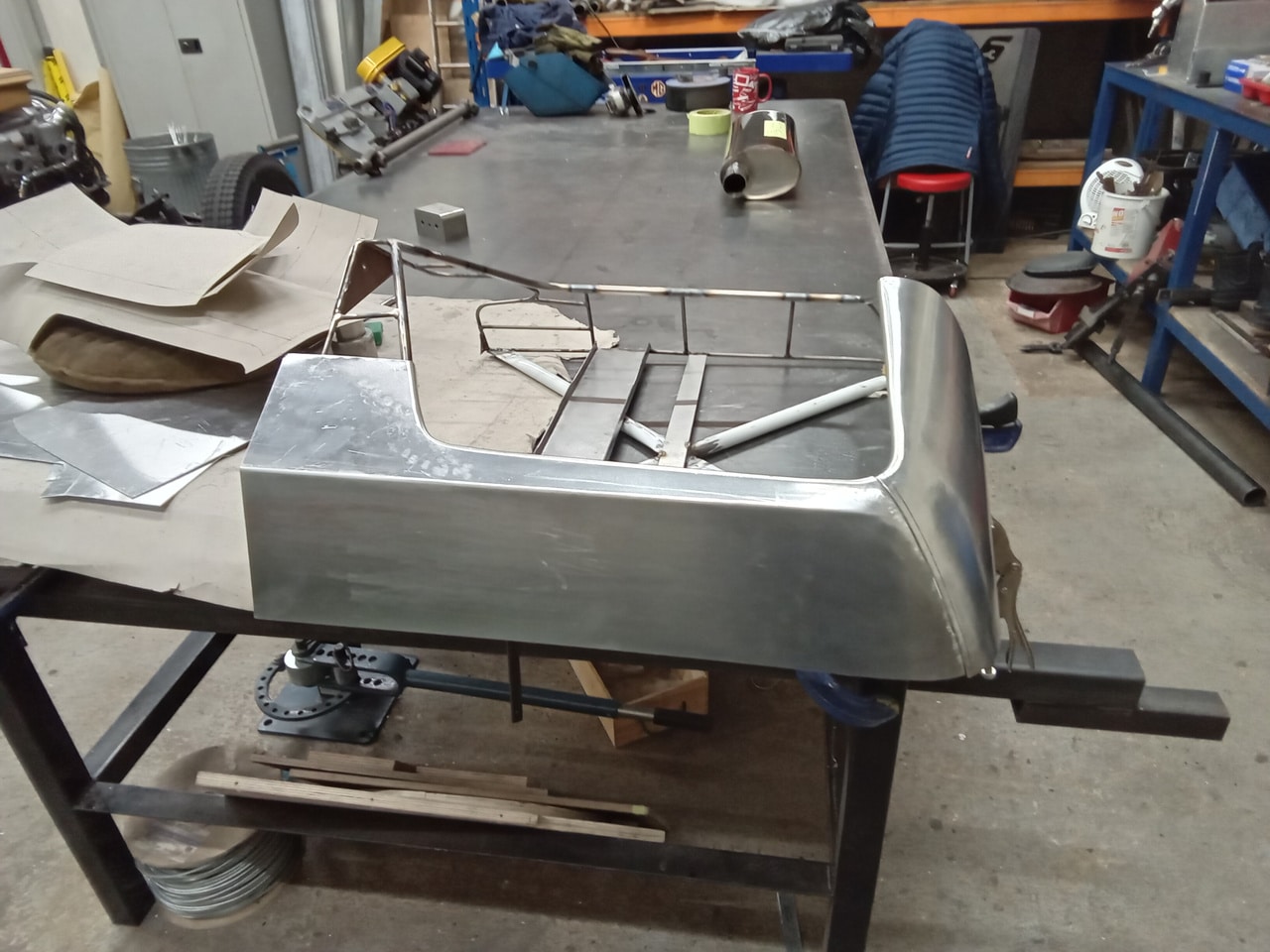 With the rest of the body nearly at its finished shape, Clinton has been working on the all-important grille surround. This part, much like the rest of the car, has been entirely handformed and most especially to fit the car. Clinton has also got most of the firewall built and shaped for the car, with the pedal box now in place following the seat placing.