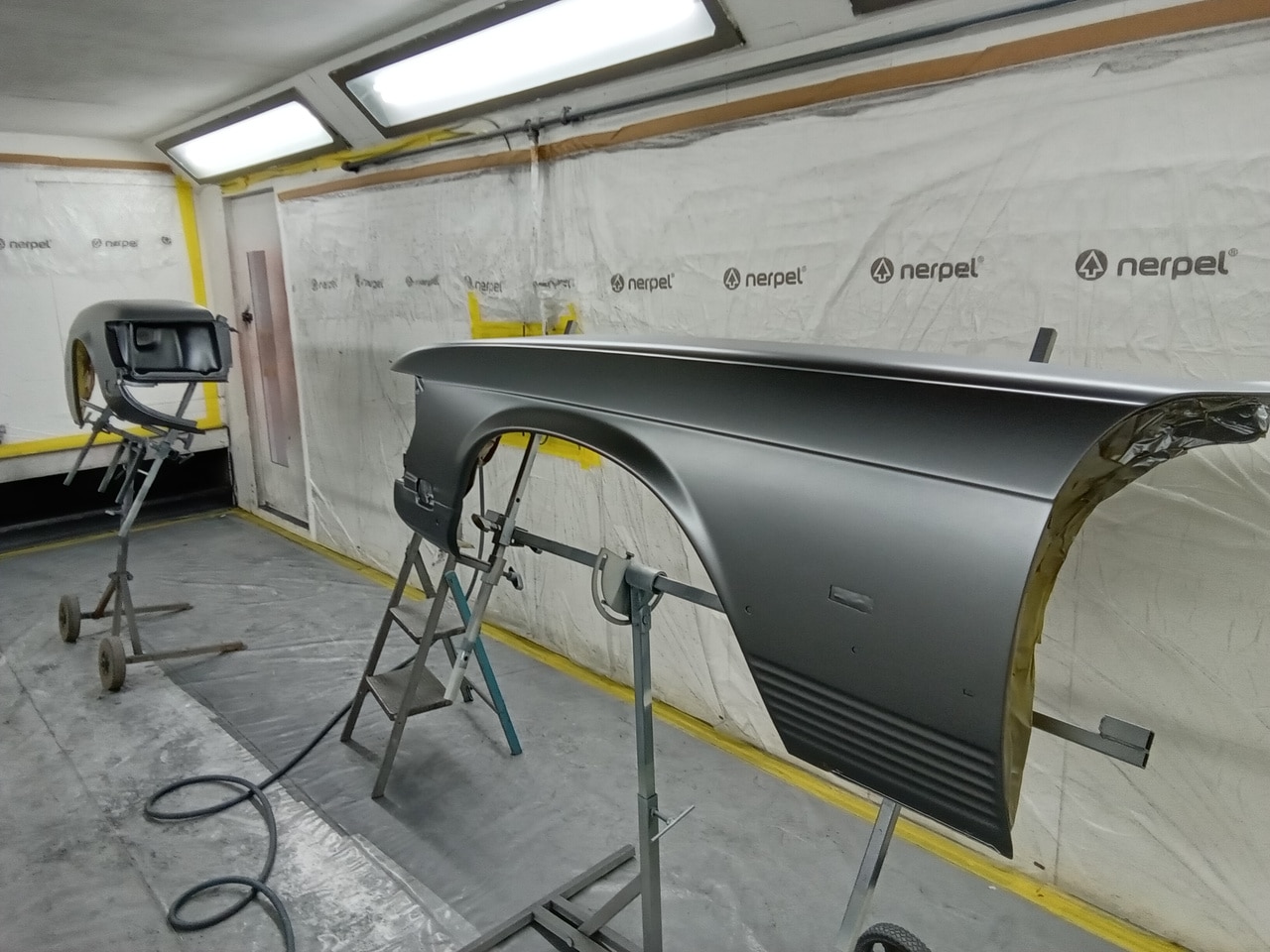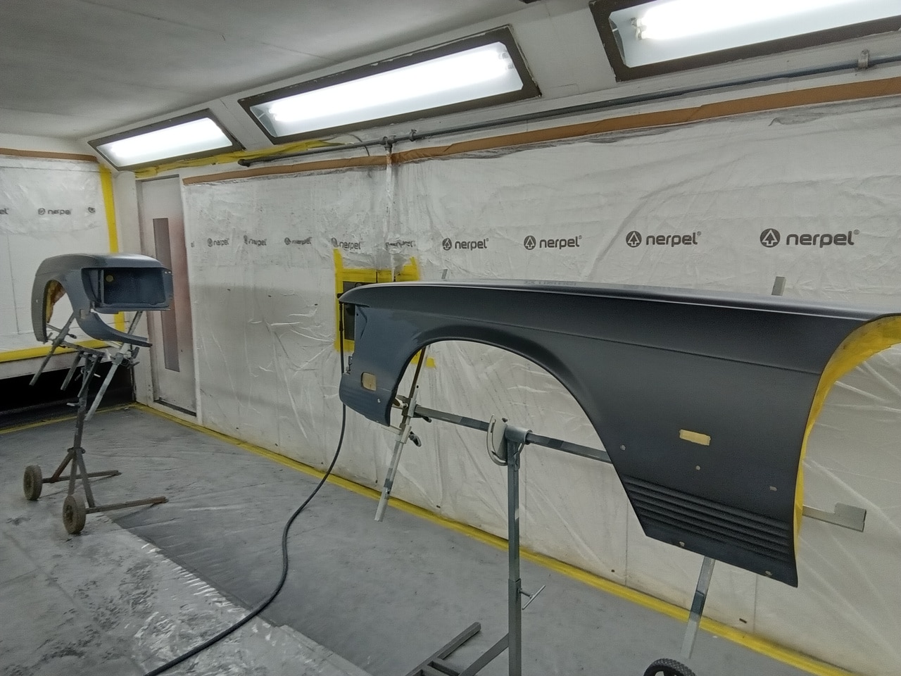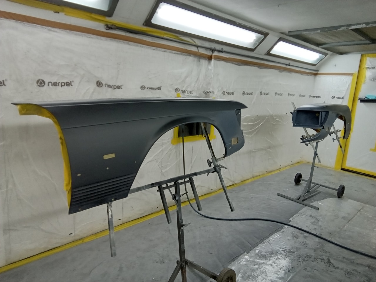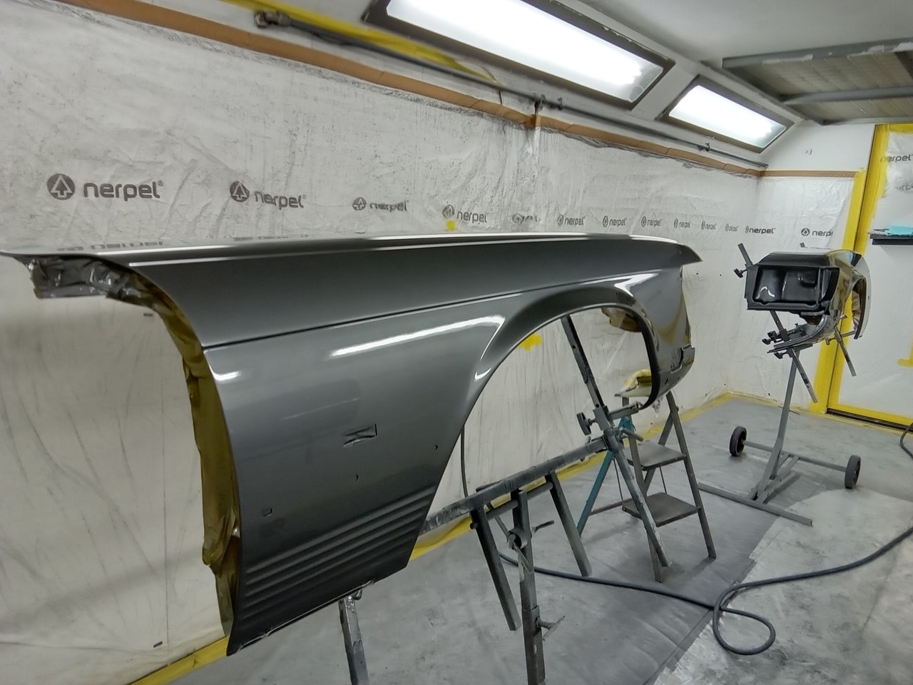Our paint and body technician Mauro has been working his way through the various parts and panels for our 1987 Mercedes 500SL. With the body shell having been painted in the stunning, glossy Slate Grey last week, Mauro has prepped all of the other pieces to go into the booth to be matched up the shells paintwork, and the results are truly stunning.