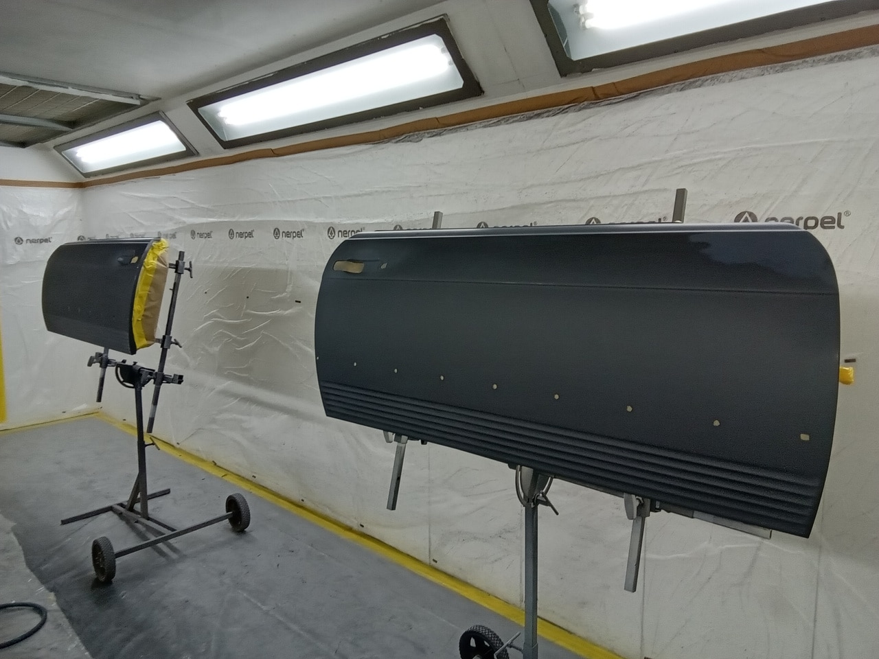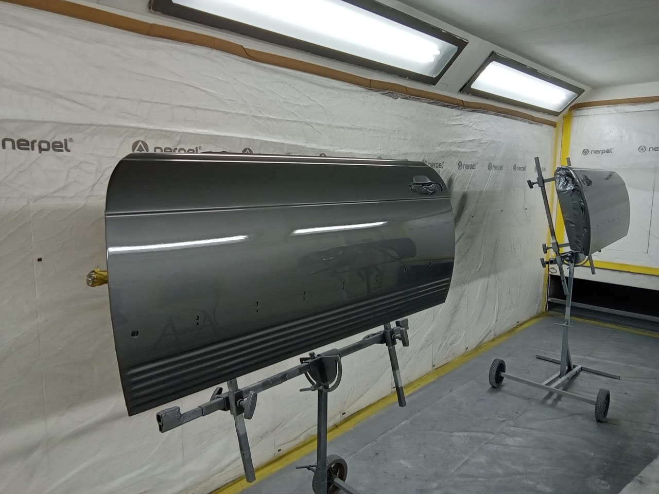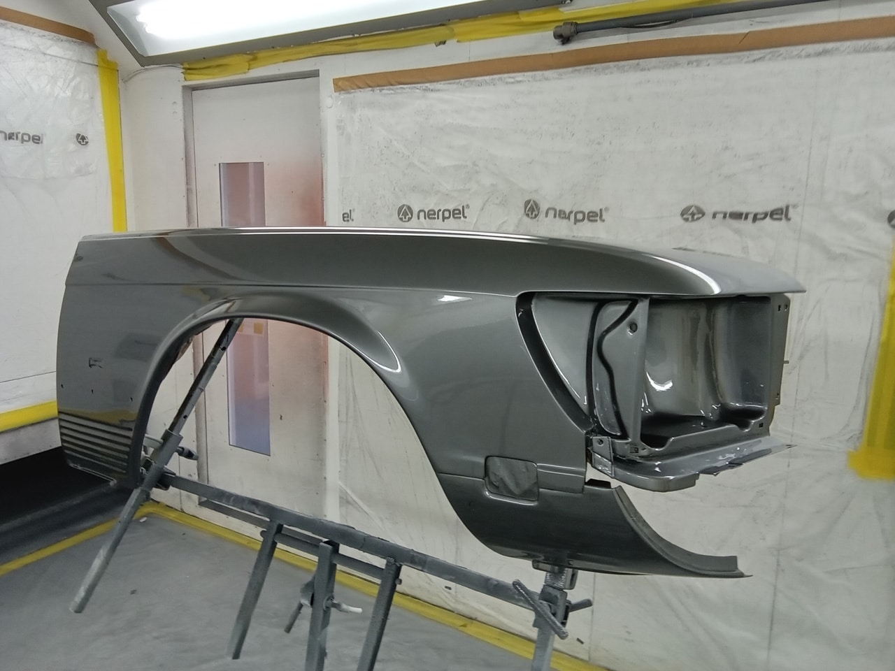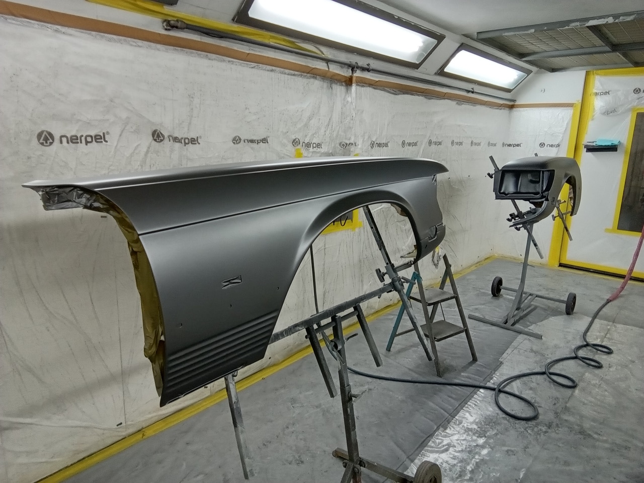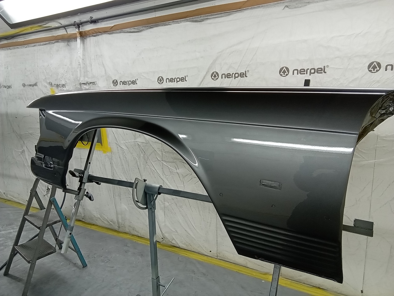 Our paint and body technician Mauro has been working his way through the various parts and panels for our 1987 Mercedes 500SL. With the body shell having been painted in the stunning, glossy Slate Grey last week, Mauro has prepped all of the other pieces to go into the booth to be matched up the shells paintwork, and the results are truly stunning.