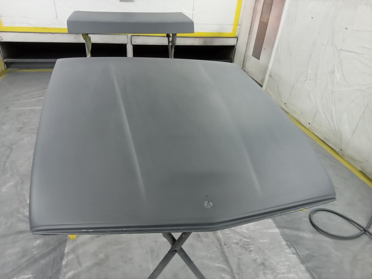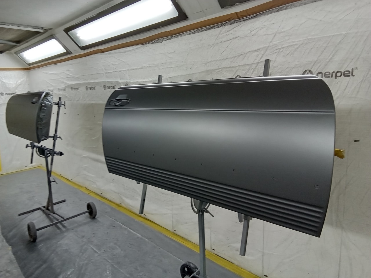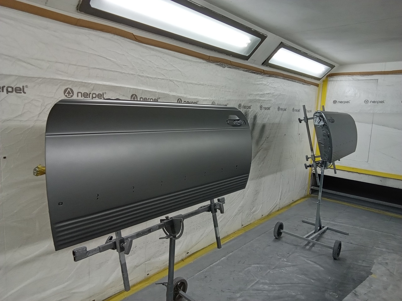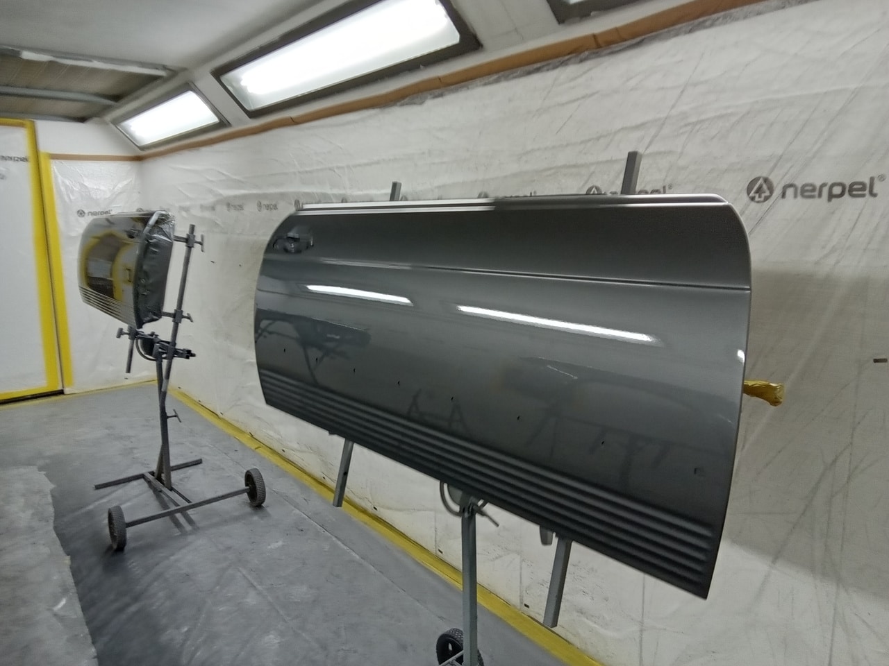 Our paint and body technician Mauro has been working his way through the various parts and panels for our 1987 Mercedes 500SL. With the body shell having been painted in the stunning, glossy Slate Grey last week, Mauro has prepped all of the other pieces to go into the booth to be matched up the shells paintwork, and the results are truly stunning.