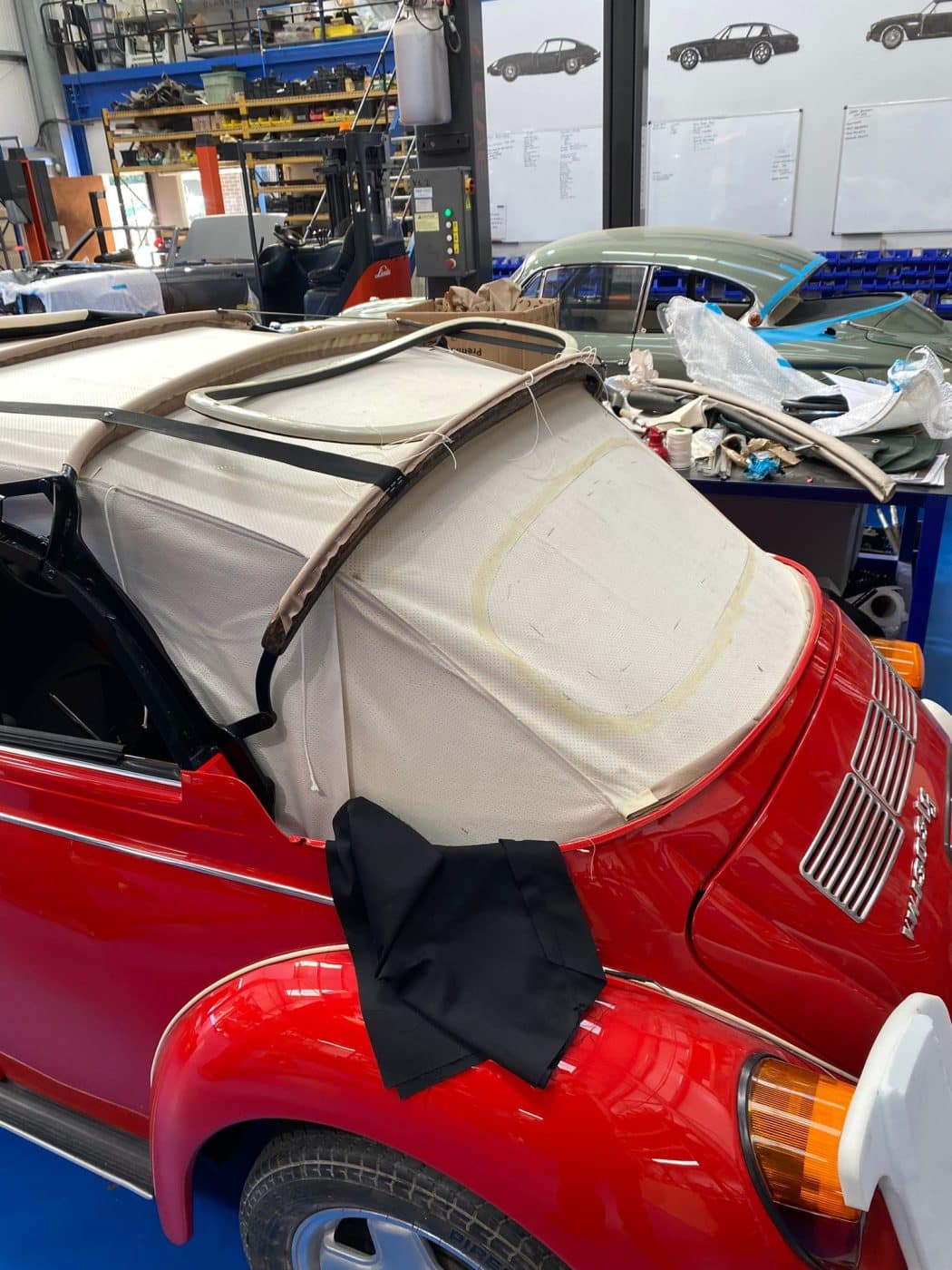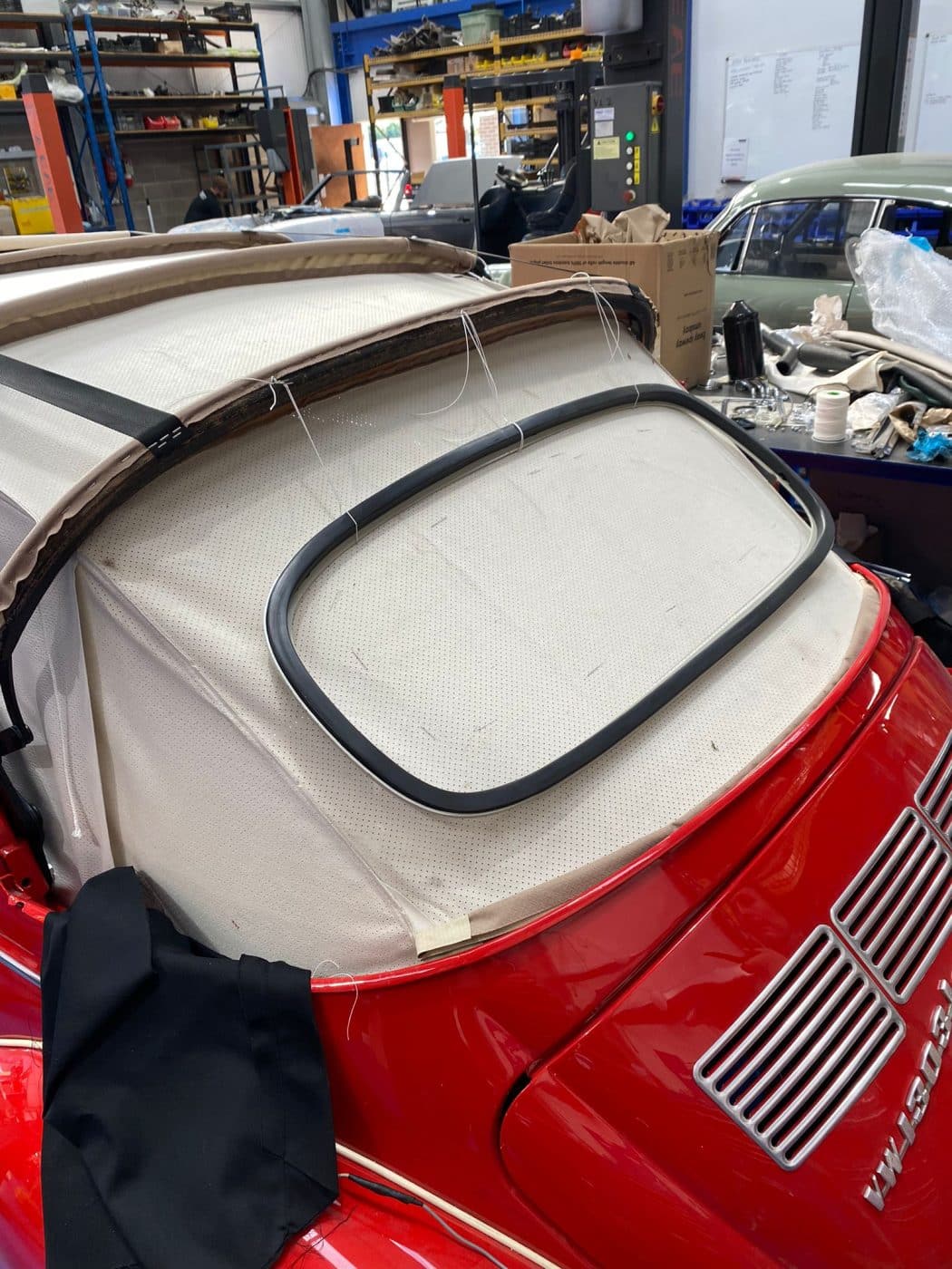 Brian has continued his work on the headliner of our 1974 Volkswagen Beetle. After fitting the plastic trims to cover the roof hinges, the front edge of the roof inner pad was fitted to the frame.