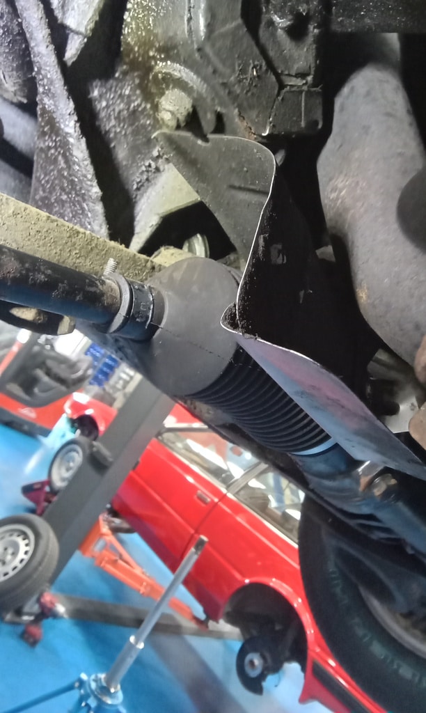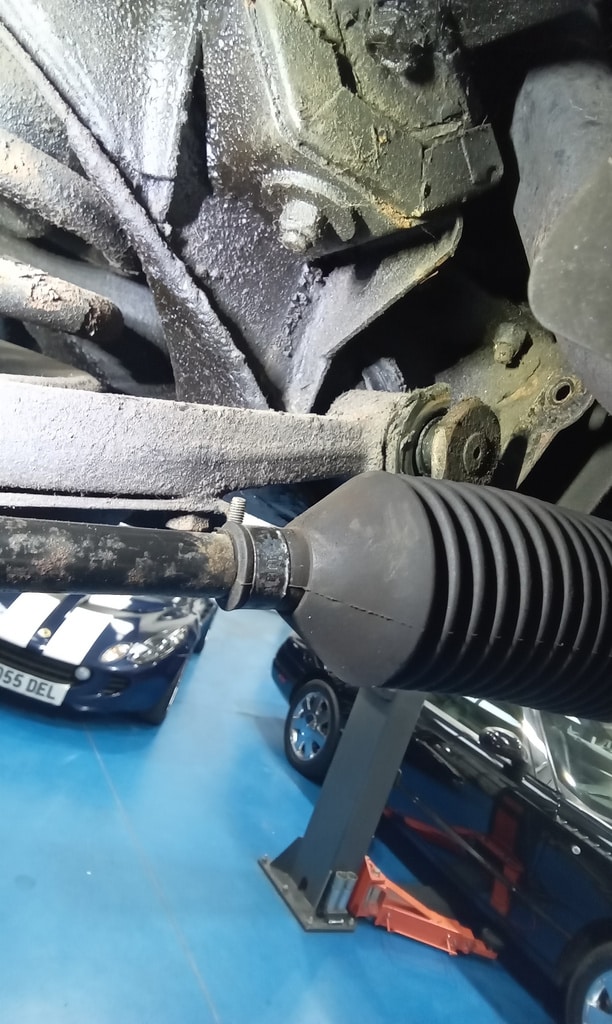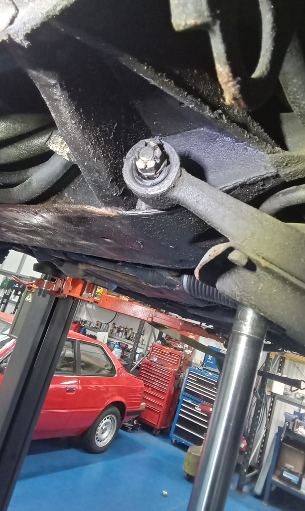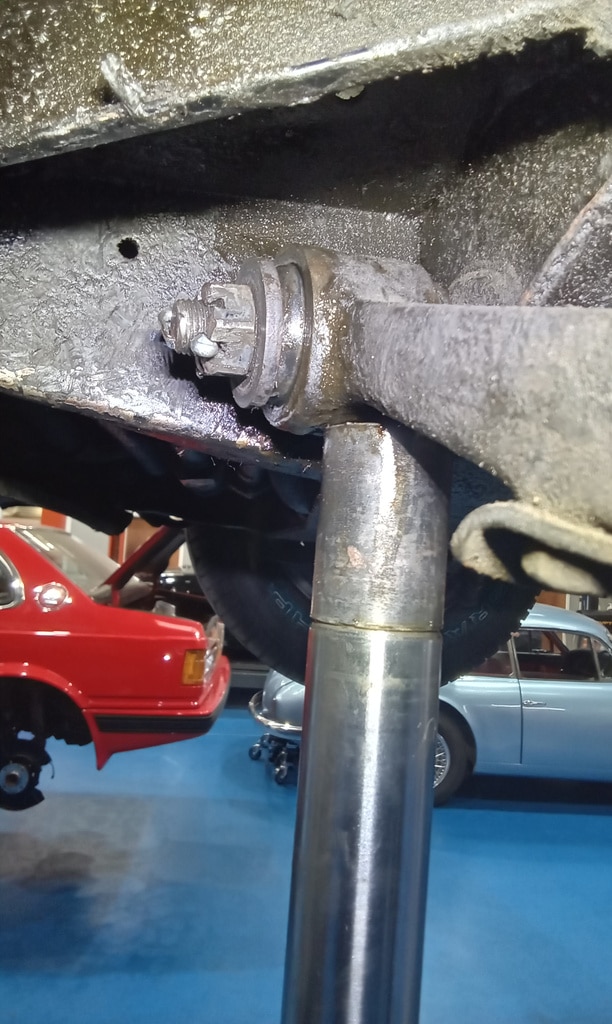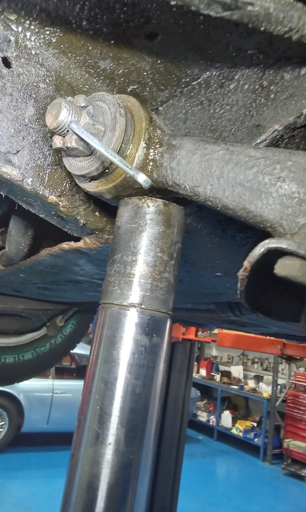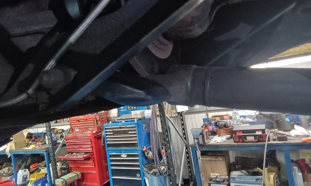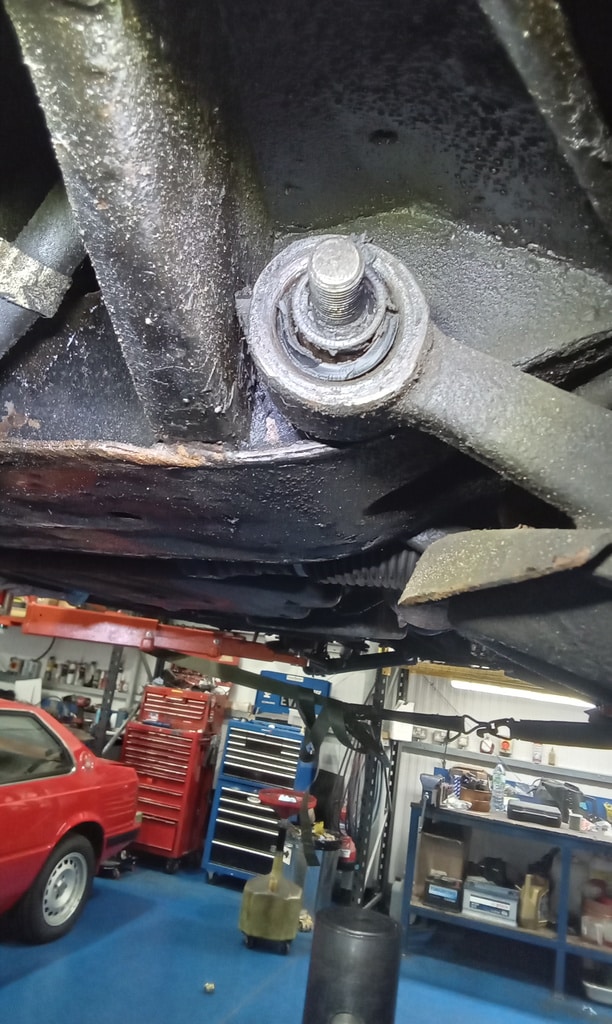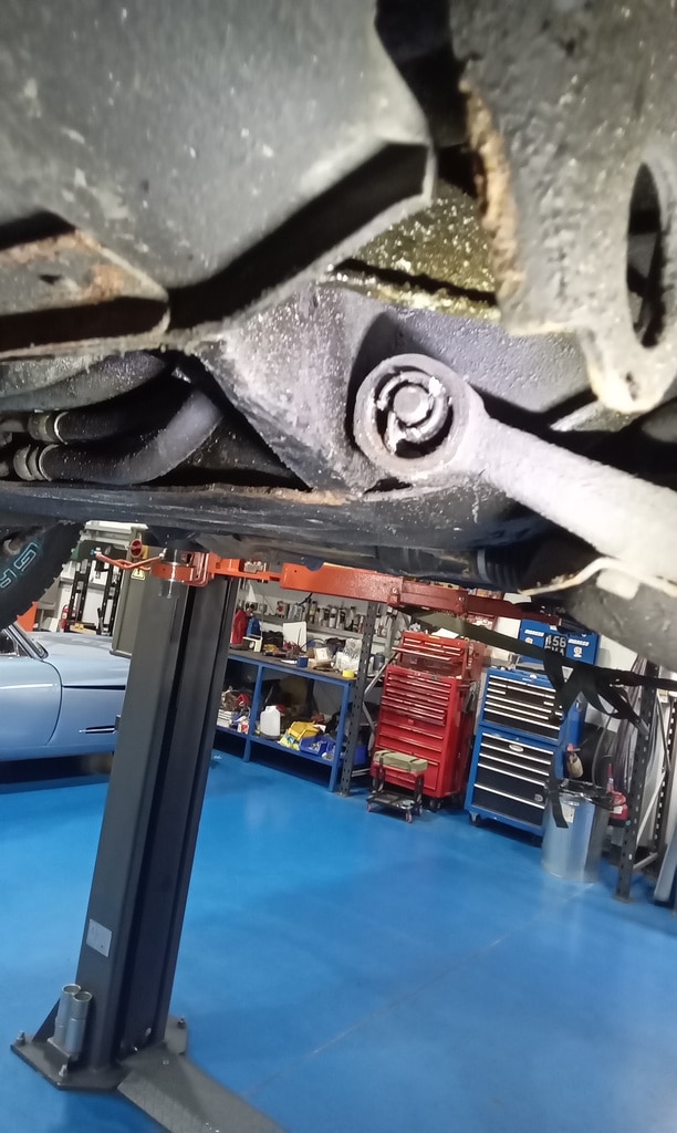 Next up were a series of repairs at the front of the 1990’s V12 GT car as Jon began to gain access to the nearside front of the car, to replace a suspension bush. To this, he had to remove the catalytic converter sheild, under the steering rack and lower it as far as possible in order to start removing the bush before fitting a new one.