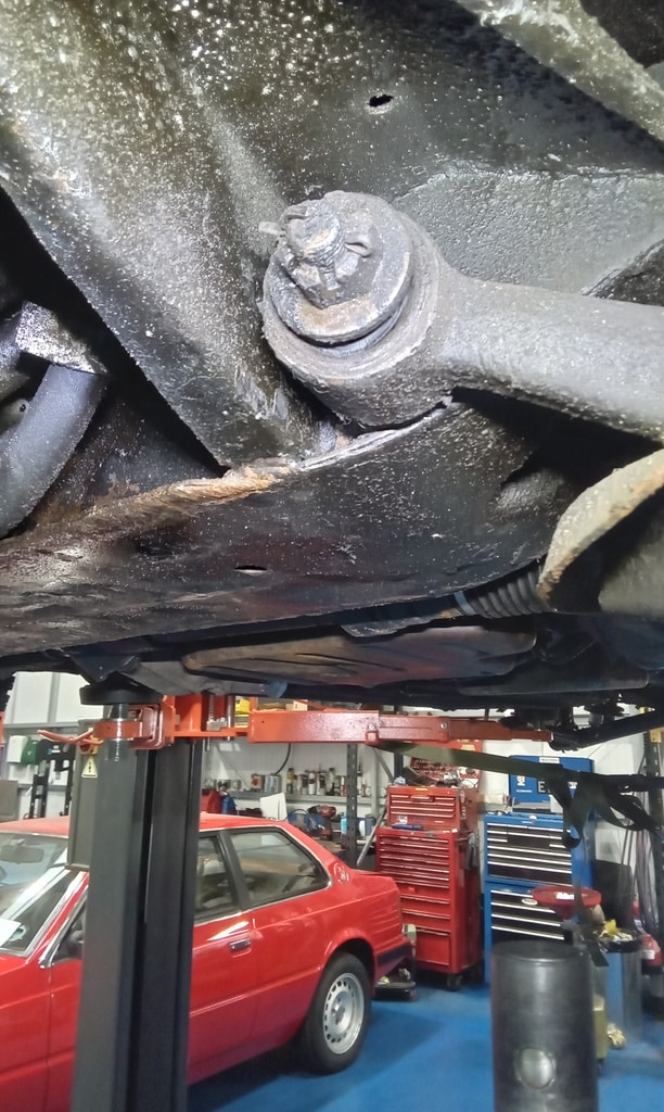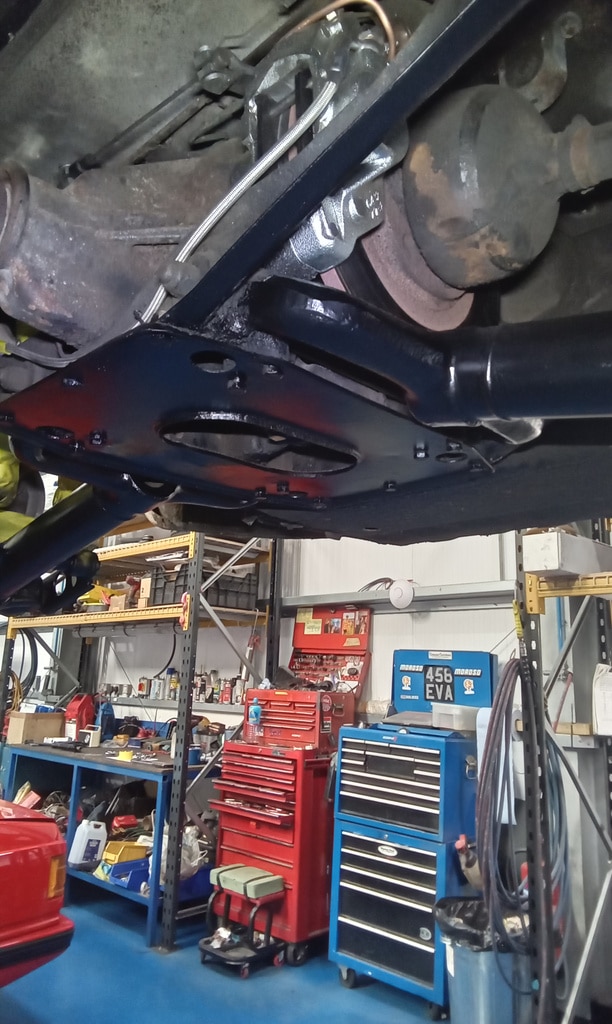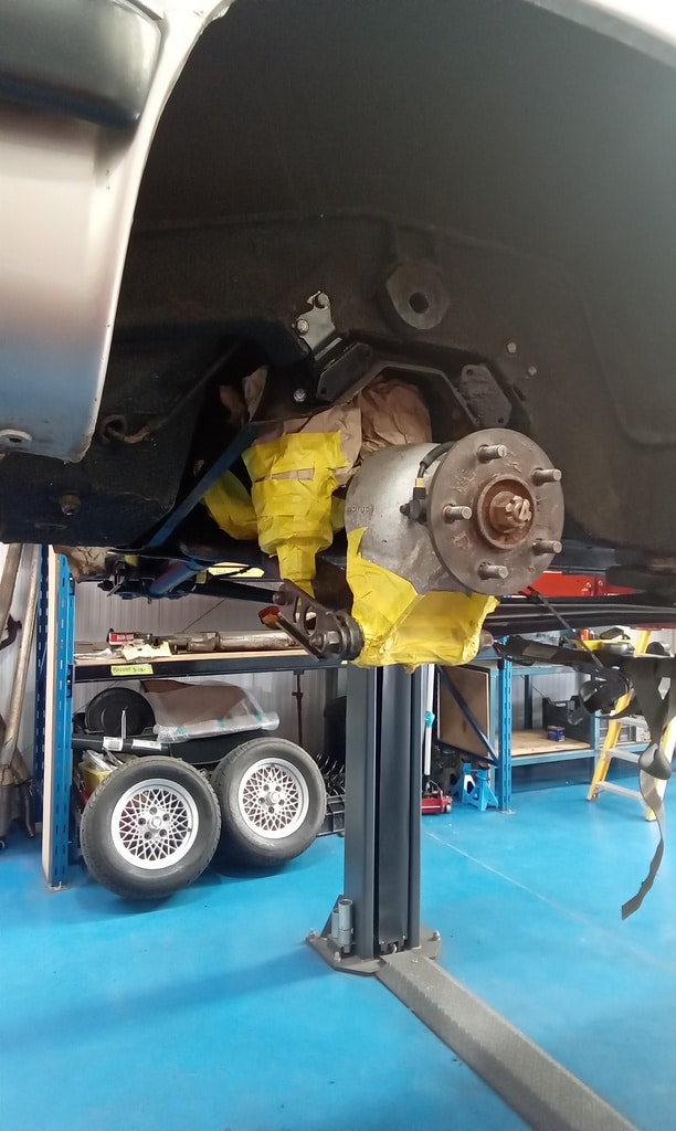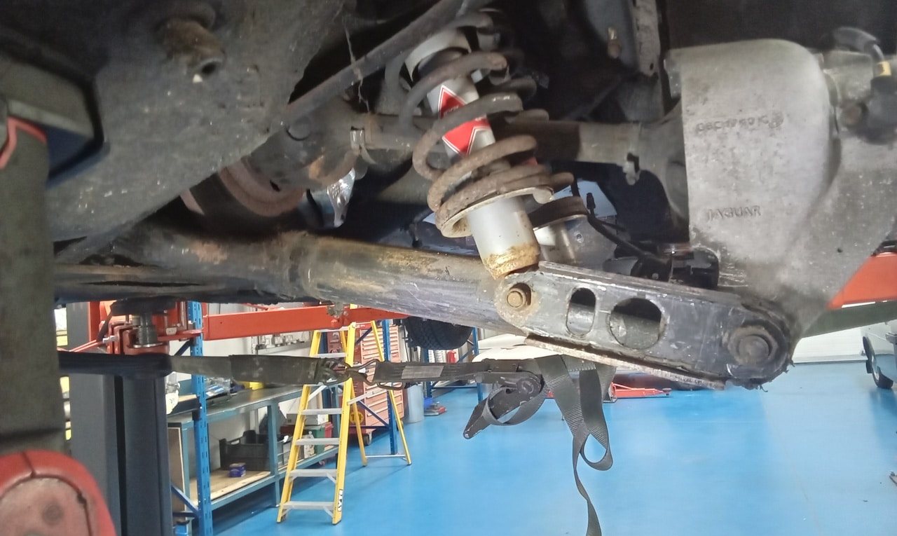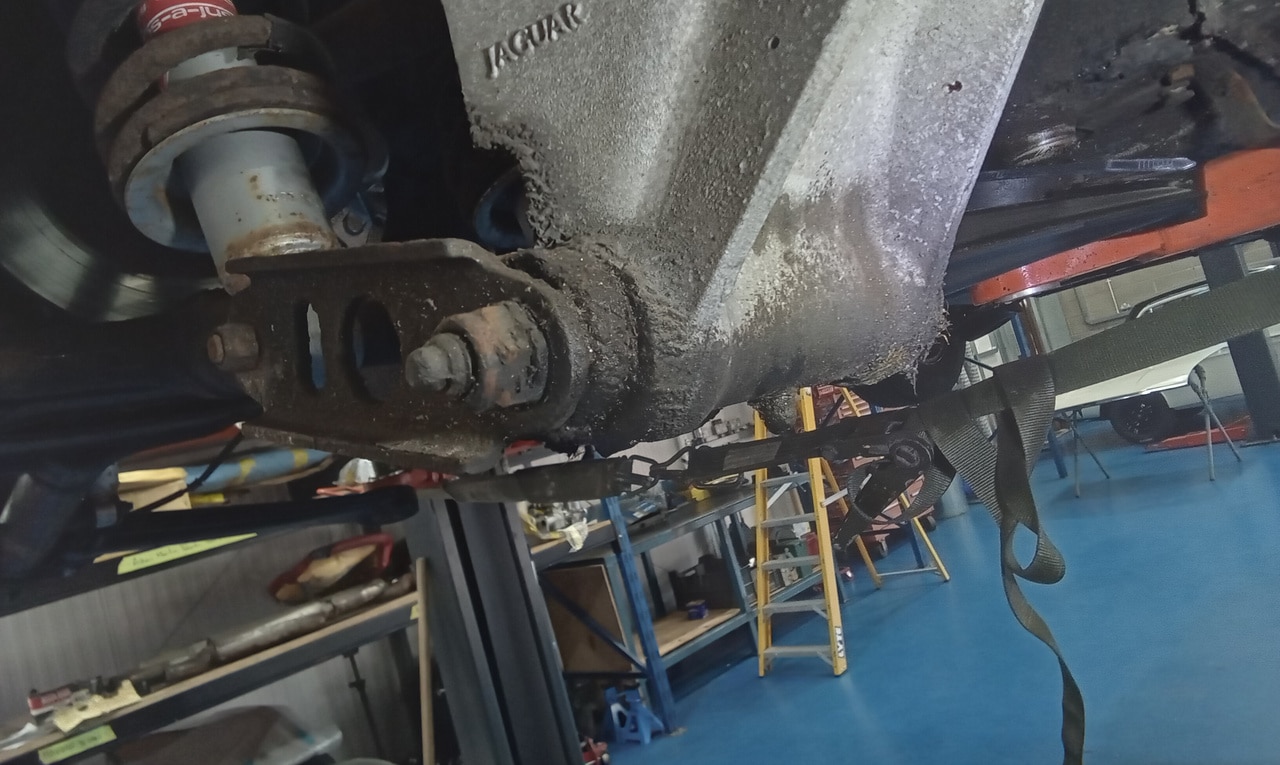 The Bridge Classic Cars team have been busy on the 1991 Jaguar XJS V12. Our technician Jon has got the rear axle back underneath the car after the rust repairs were completed – so he could begin to cleaning up the underneath for painting.